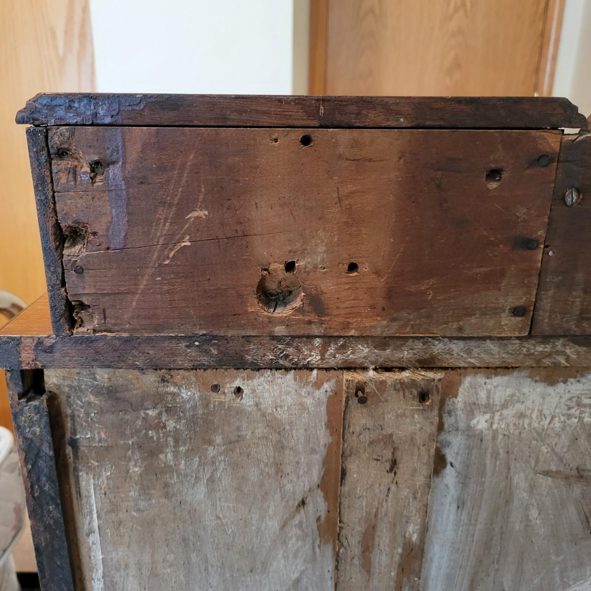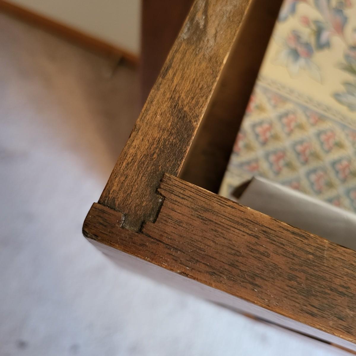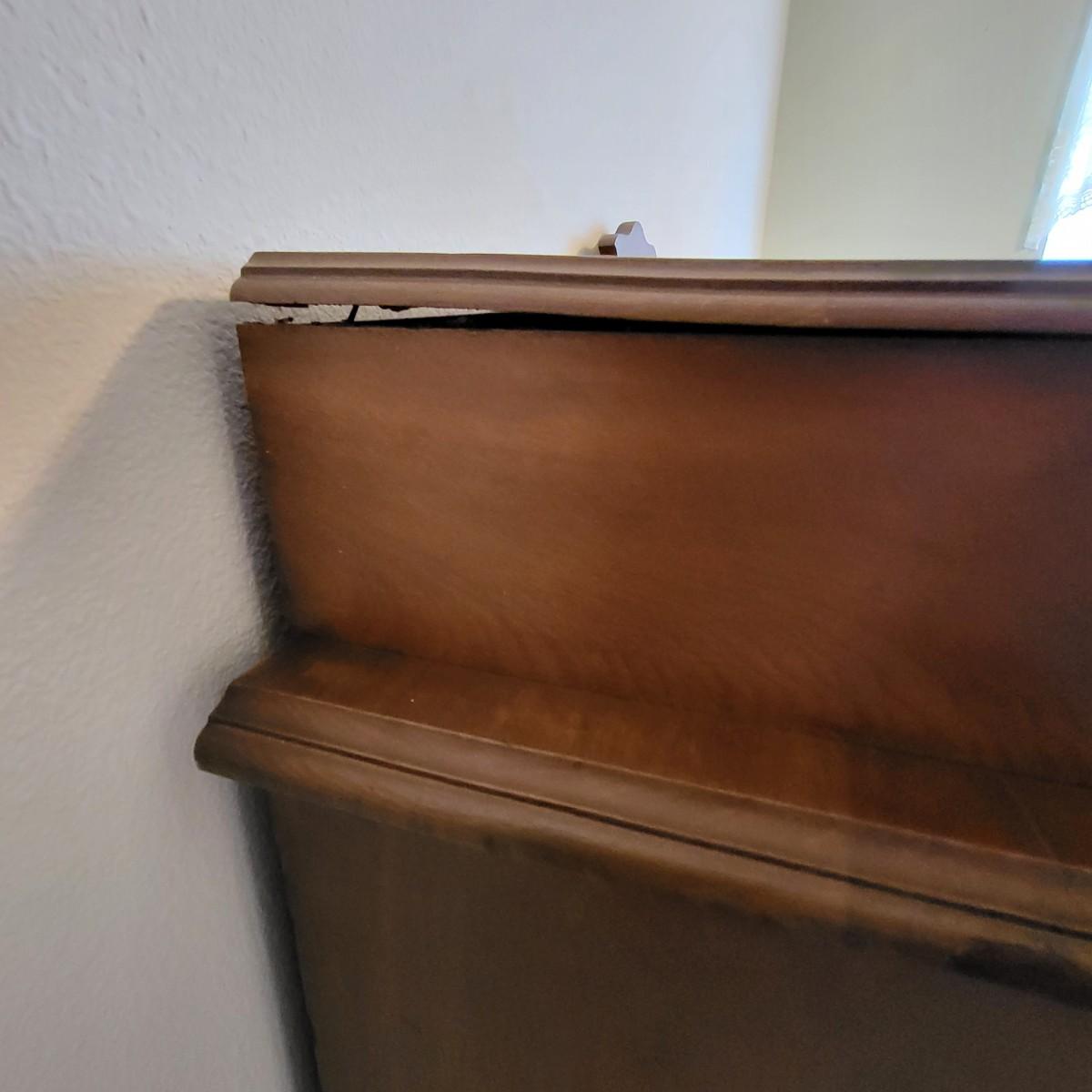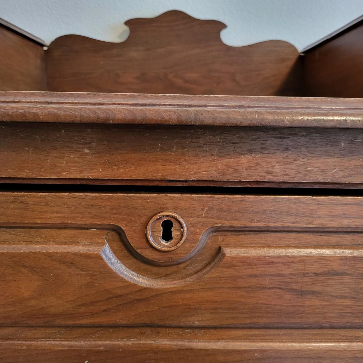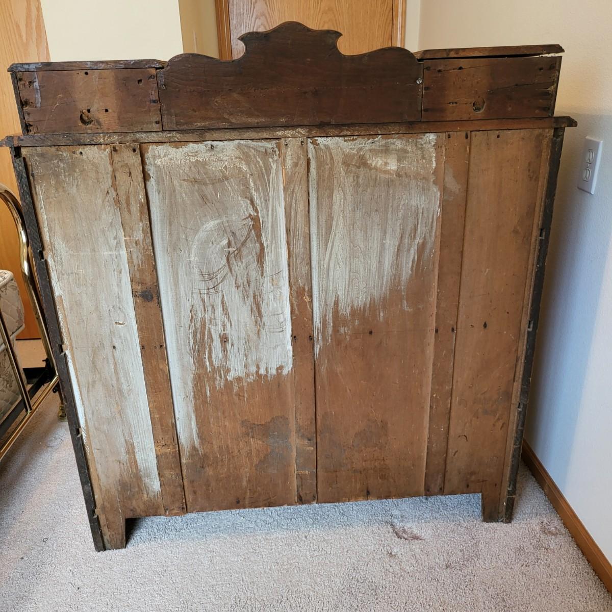 Antique wood bedroom dresser. Four full length drawers on bottom, two small top vanity drawers. Brass colonial style drawer pulls. 42" long x 42" tall x 17" deep.