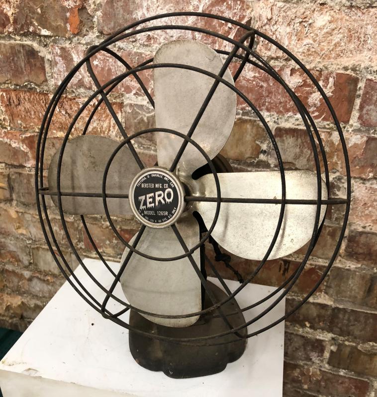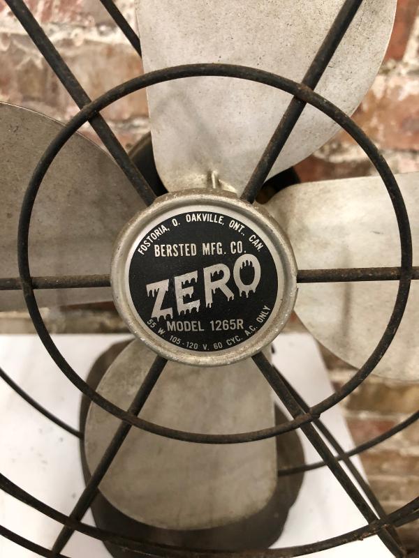 Here is an antique Zero oscillating electric fan offered as is..needs rewiring...4 aluminum blades...by Bersted Mfg....