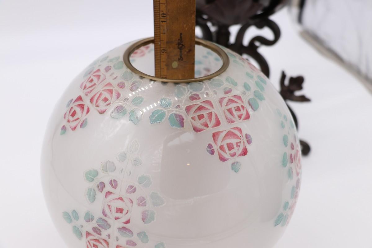 Lovely Bradley and Hubbard kerosene lamp burner, in a beautiful Art Nouveau floral leaf vine metal base, and frosted clear globe lamp base with red rose floral and leaves painted design. Base for the globe holds it in a slightly crooked way. From the estate of an antique store owner and lamp enthusiast. Condition as shown.