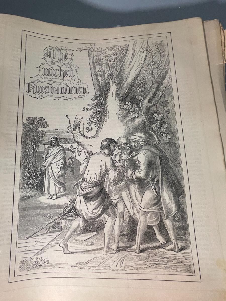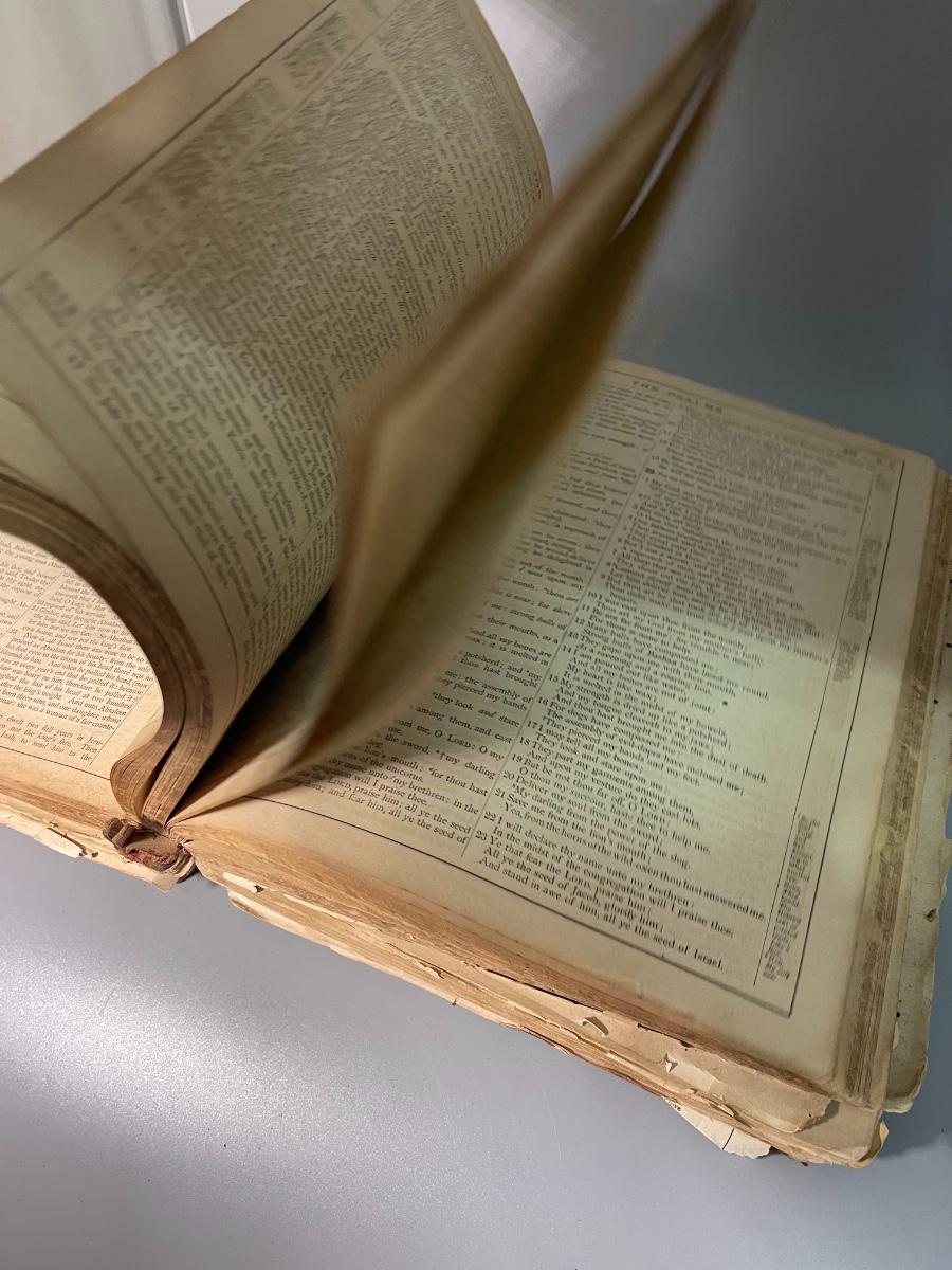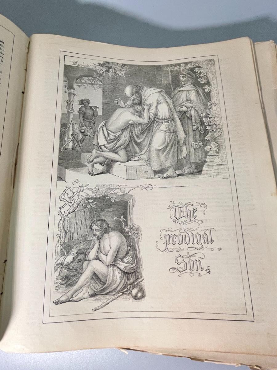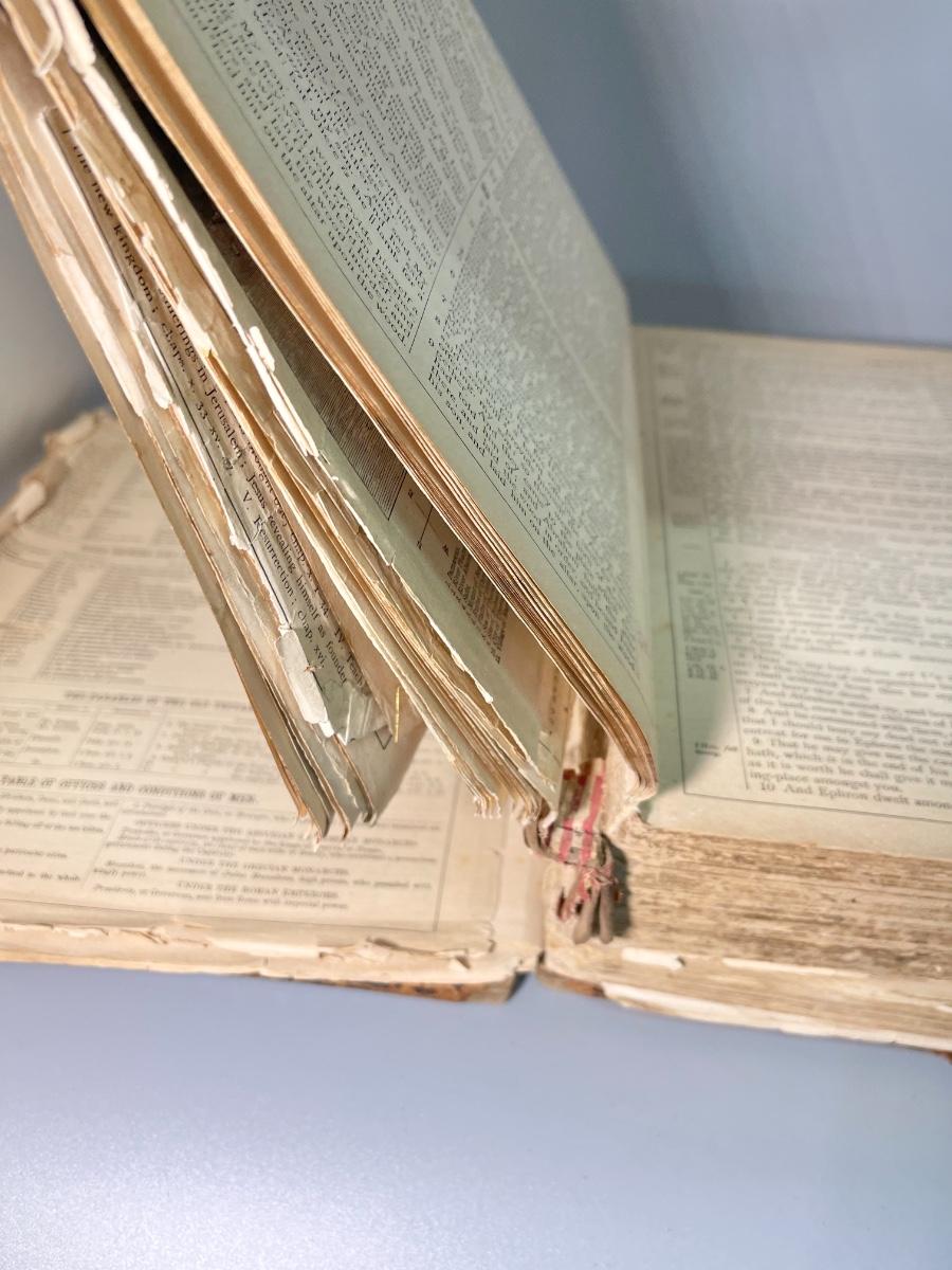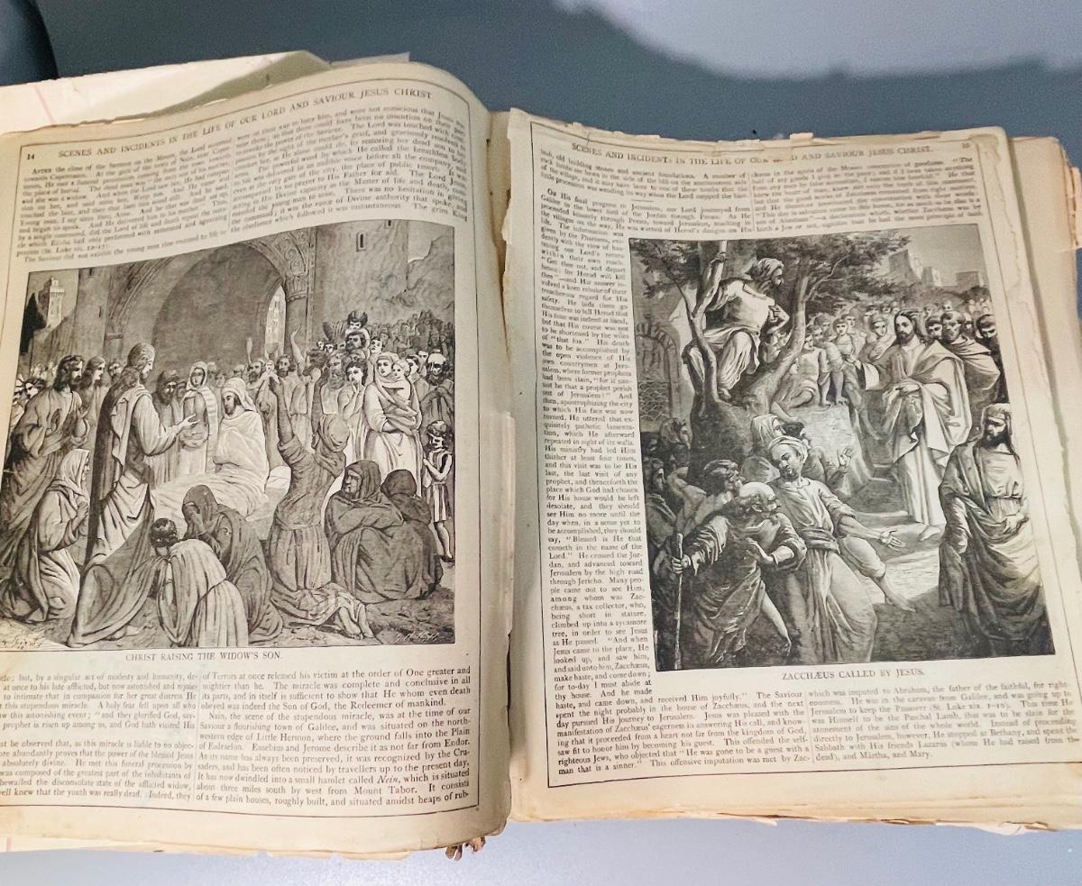 Circa 1800s Bible in rough shape. It appears that pages are there and in order. Binding is poor. Some pages are still bound while some are not. Despite condition the age of the Bible certainly makes it a treasure!!