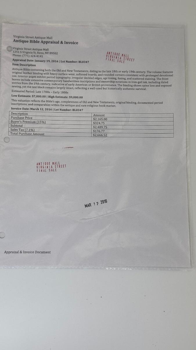 1. Antique Bible with Old New Testament Late 1700s / Early 1800s-The item was originally purchased at auction in 2016 for $2667. The appraisal value at that time was between $7 000 and $9 000. The winning bidder will receive the invoice and appraisal letter with the purchase.