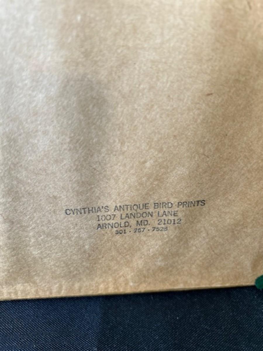 Cynthia's Antique Bird Prints, Arnold, Maryland 21012. Beautifully matted and framed. Excellent Condition.