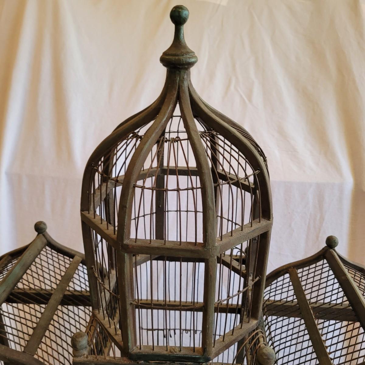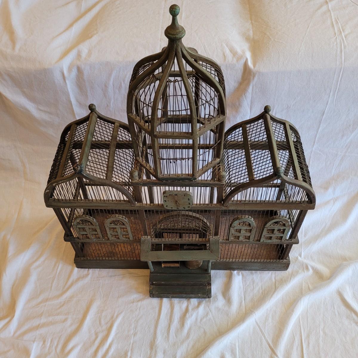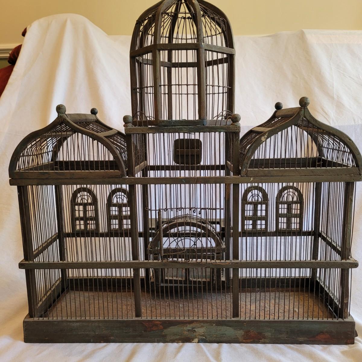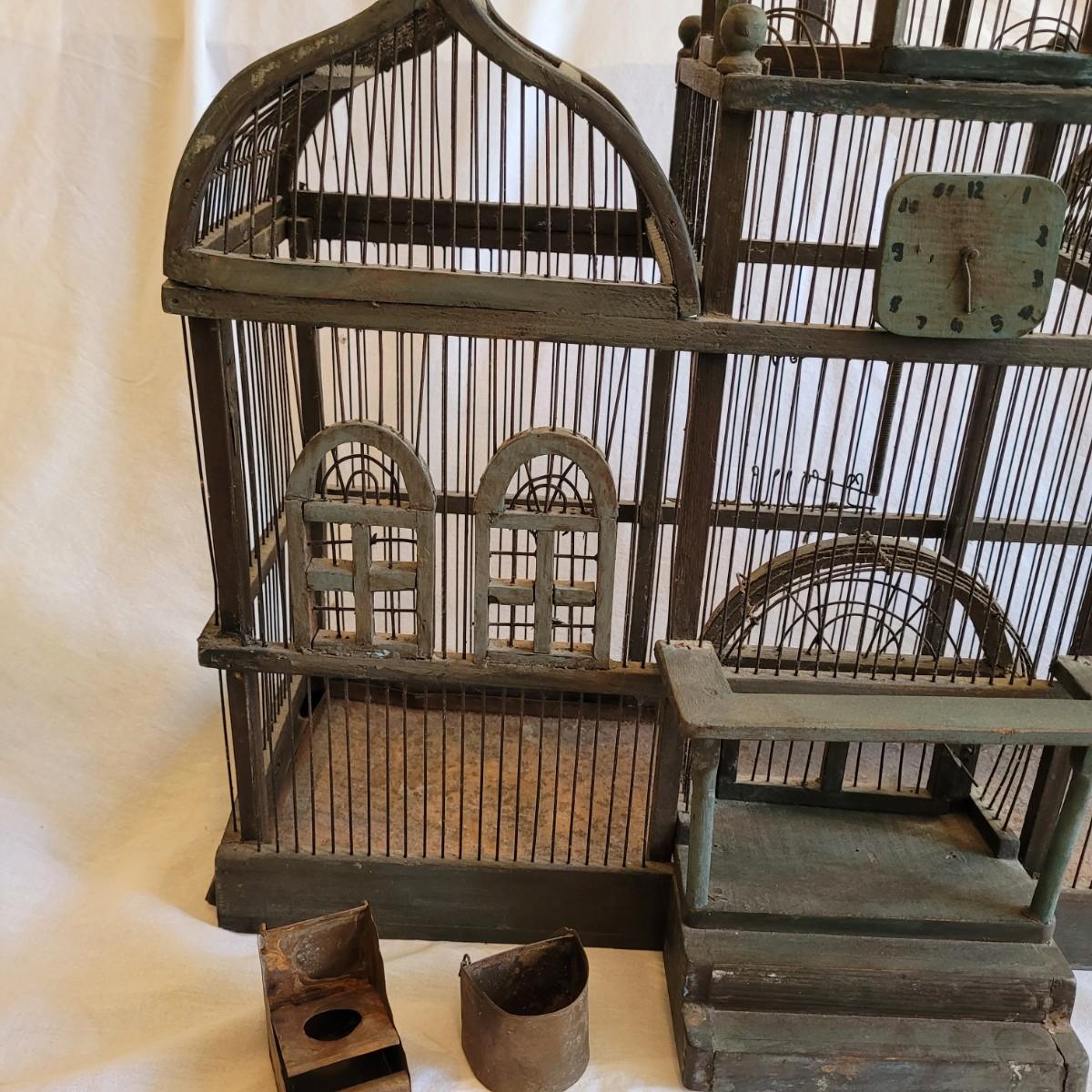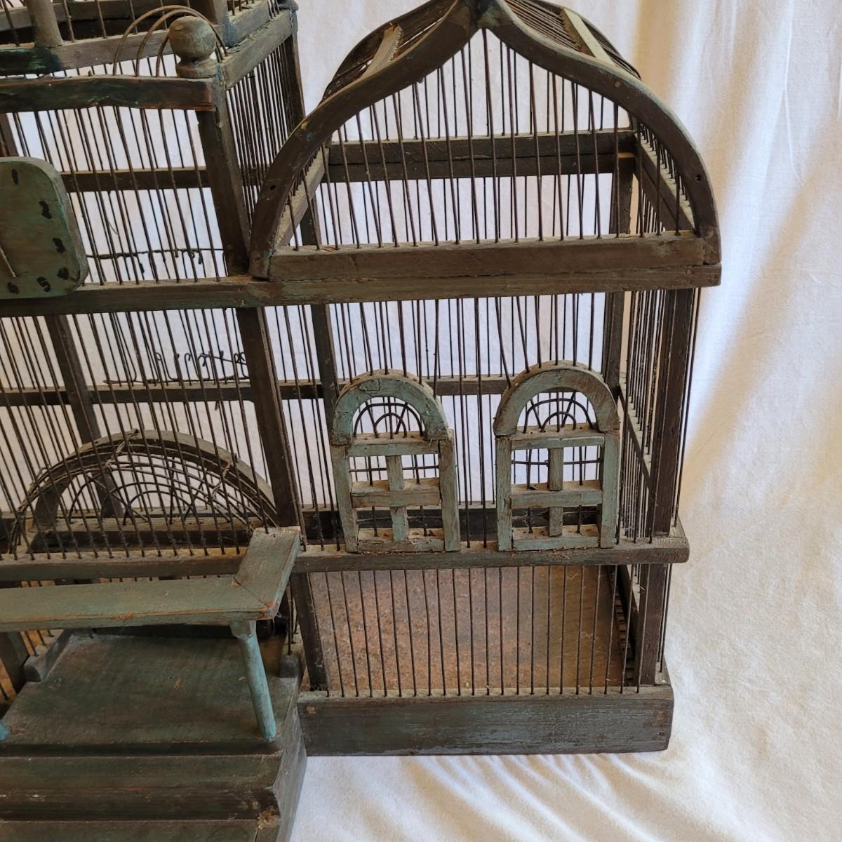 Antique Victorian triple dome wood and metal bird cage. This cage features a clocktower, four windows, and a front door with porch. Wood is painted green. Large but lightweight. Includes feeders shaped like furniture. Antique birdcages are popular among collectors and are often displayed as decorative items. Not suitable for live birds. Item measures 27" x 13" x 33"H.