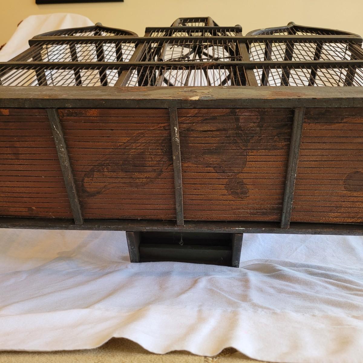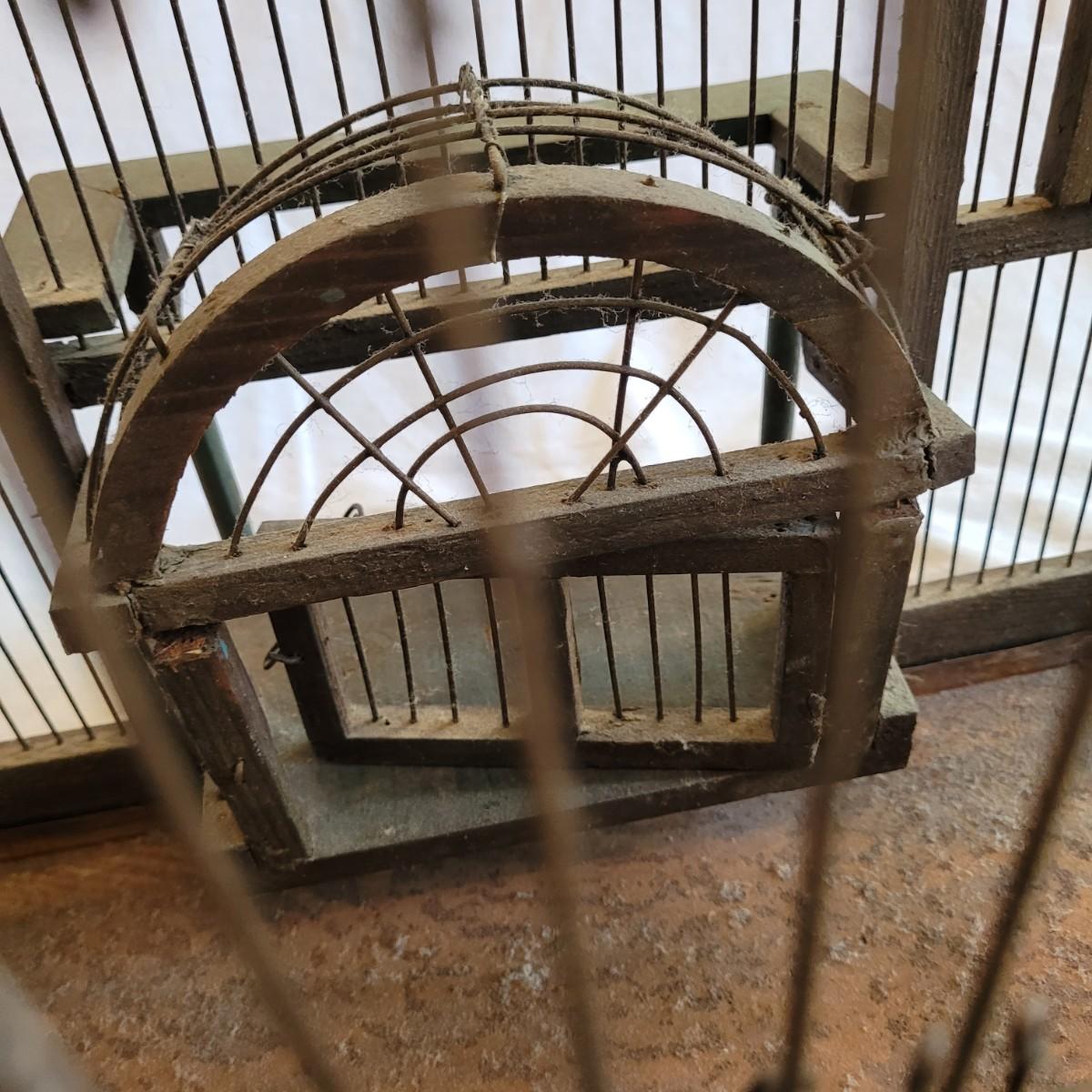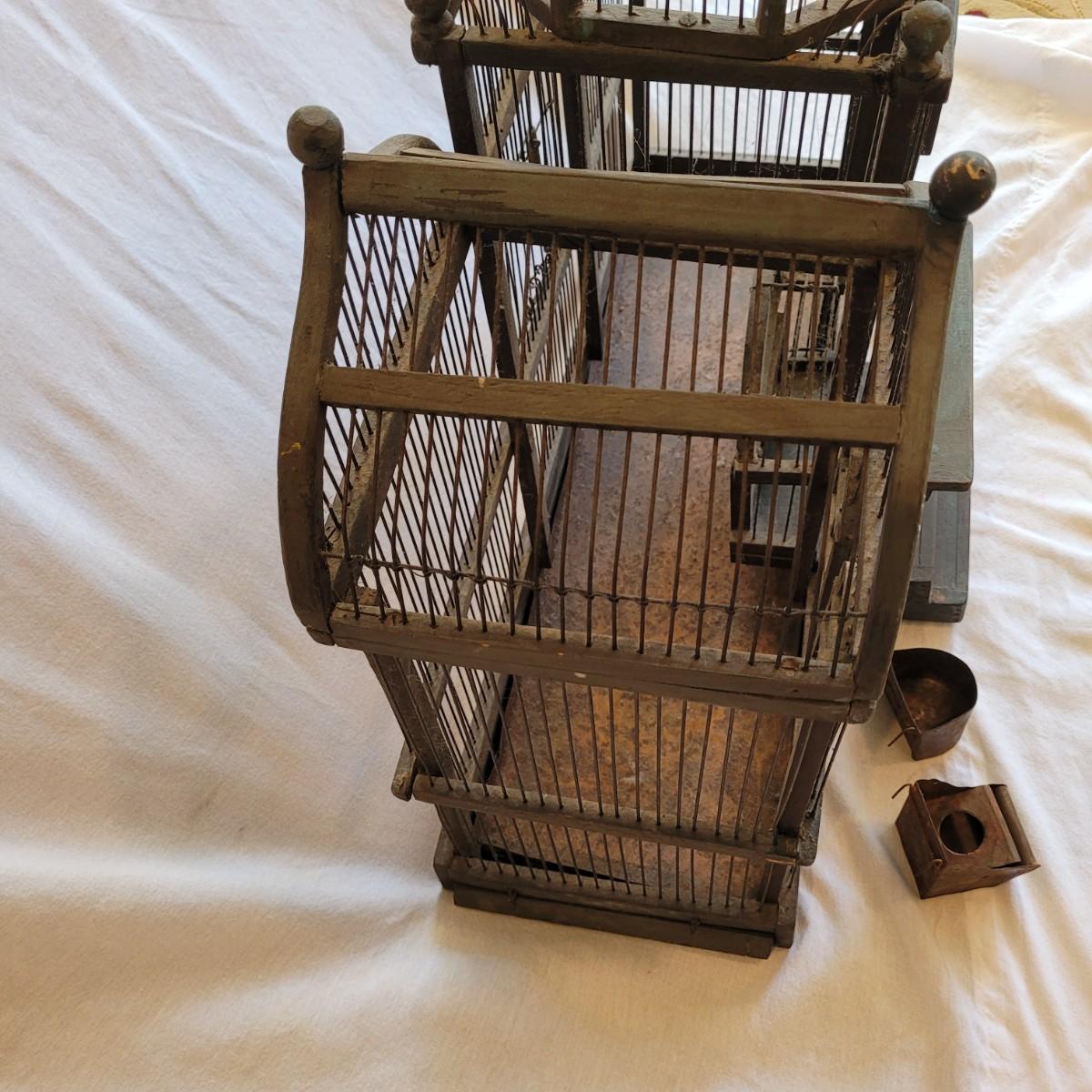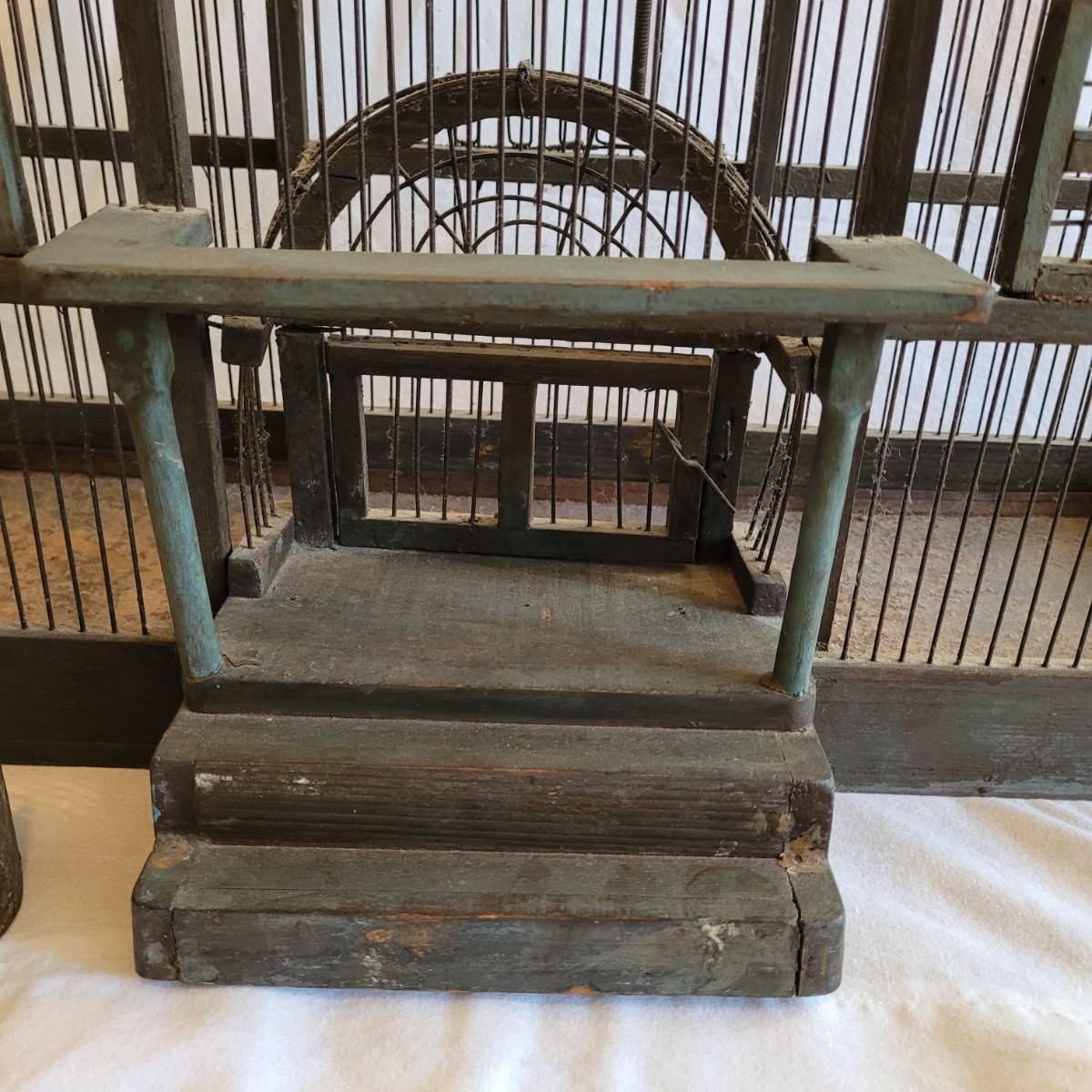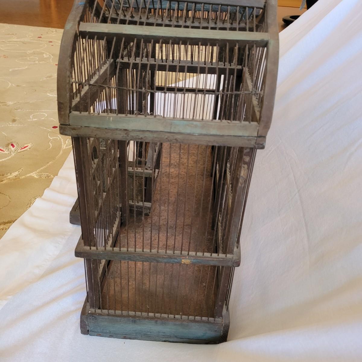 Antique Victorian triple dome wood and metal bird cage. This cage features a clocktower, four windows, and a front door with porch. Wood is painted green. Large but lightweight. Includes feeders shaped like furniture. Antique birdcages are popular among collectors and are often displayed as decorative items. Not suitable for live birds. Item measures 27" x 13" x 33"H.