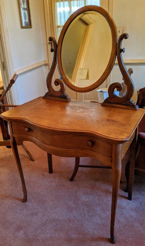 Antique Bird's eye maple vanity dressing table with beveled mirror and serpentine front (#3 R)