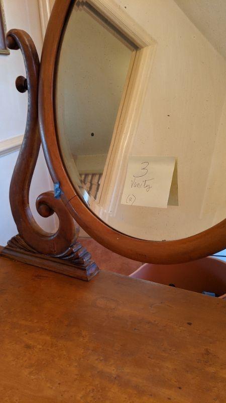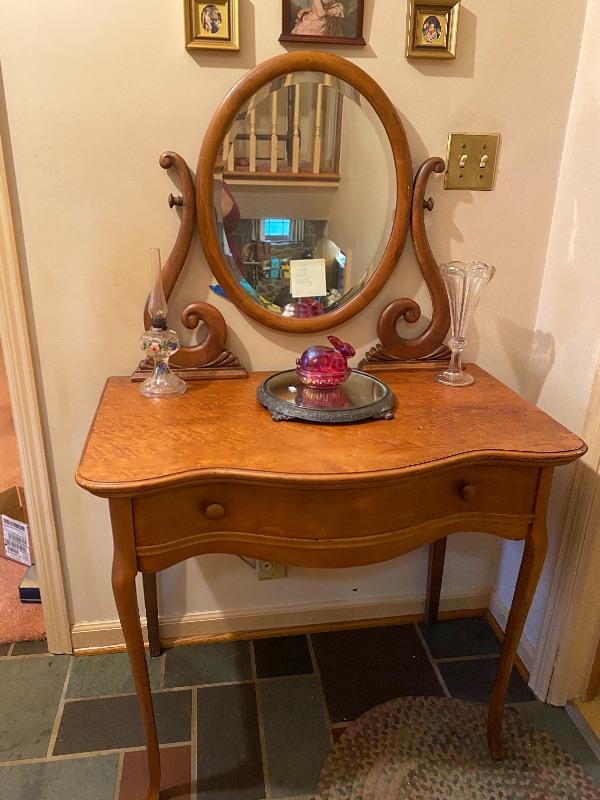 Antique Bird's eye maple vanity dressing table with beveled mirror and serpentine front (#3 R)