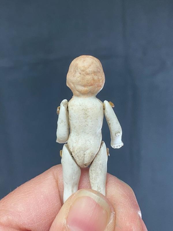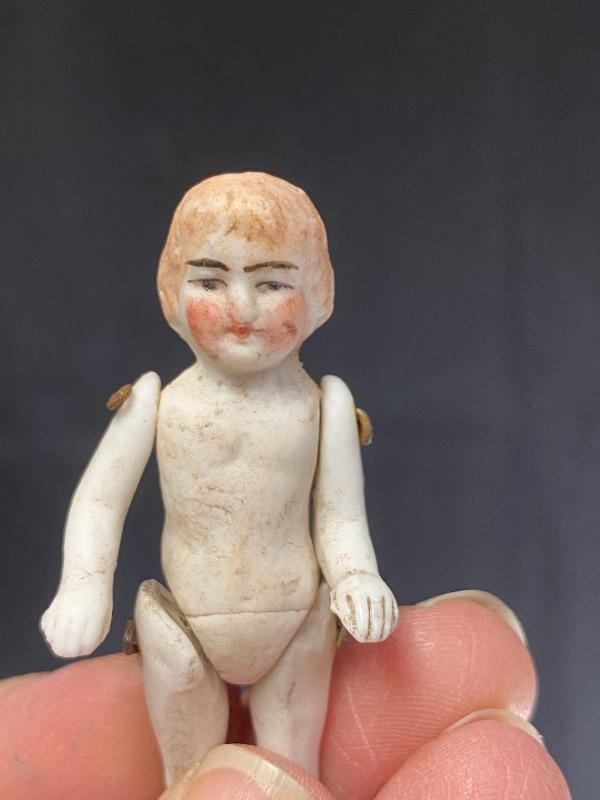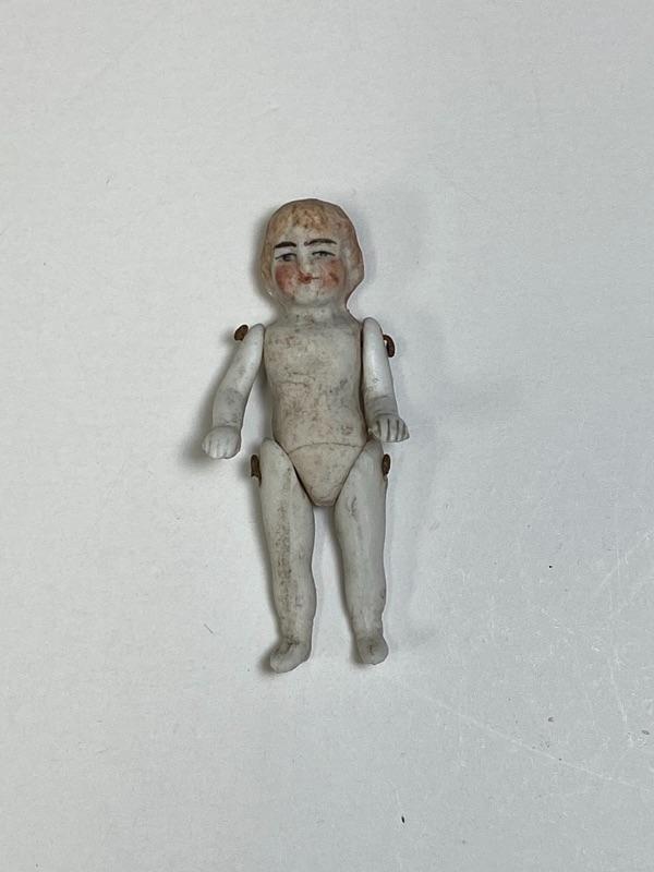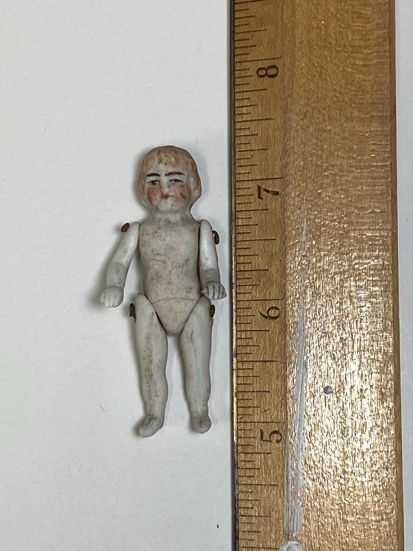 Small 2.25" antique bisque dollhouse doll. Looks like a blonde girl doll. Jointed. No broken pieces, possible crack in body near hips, discolored from dust