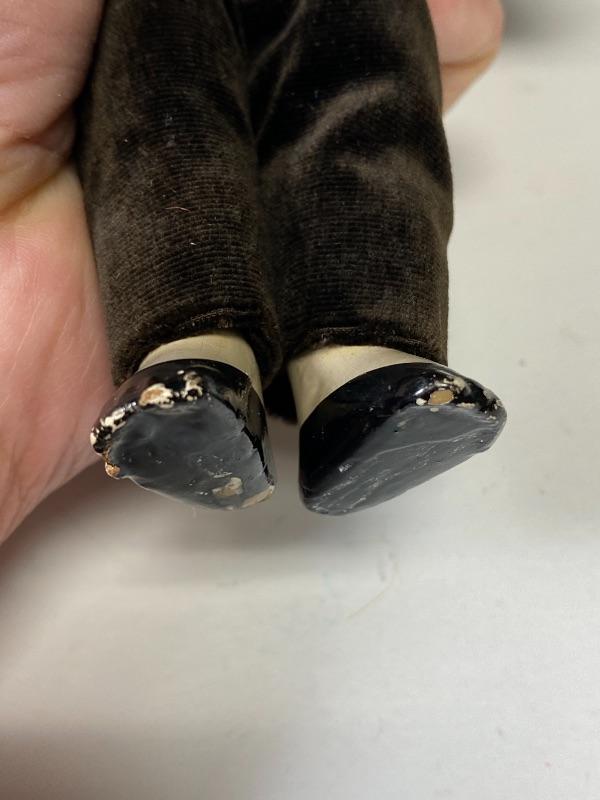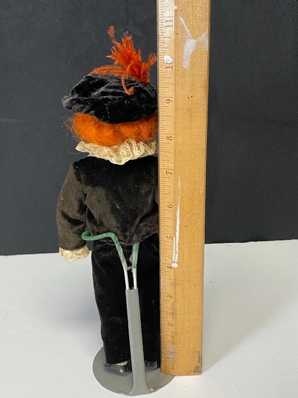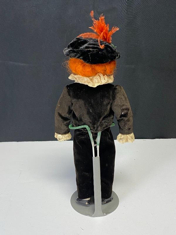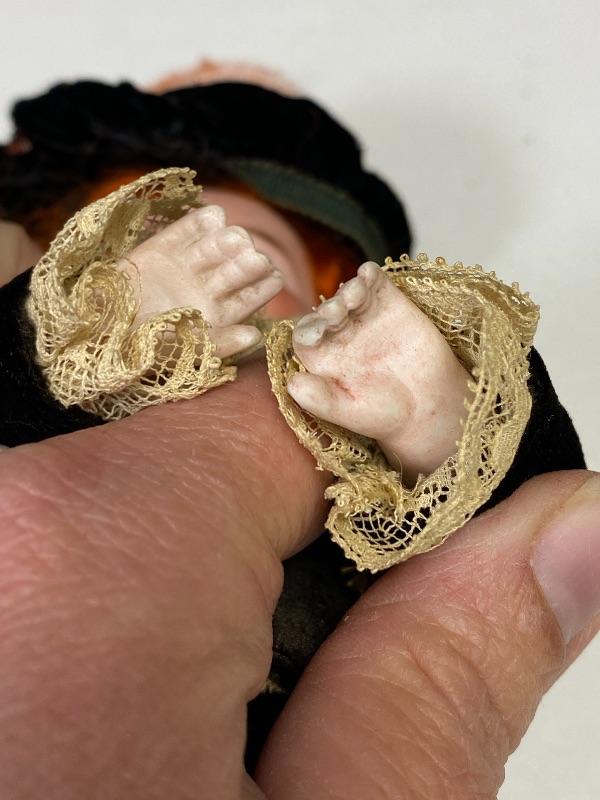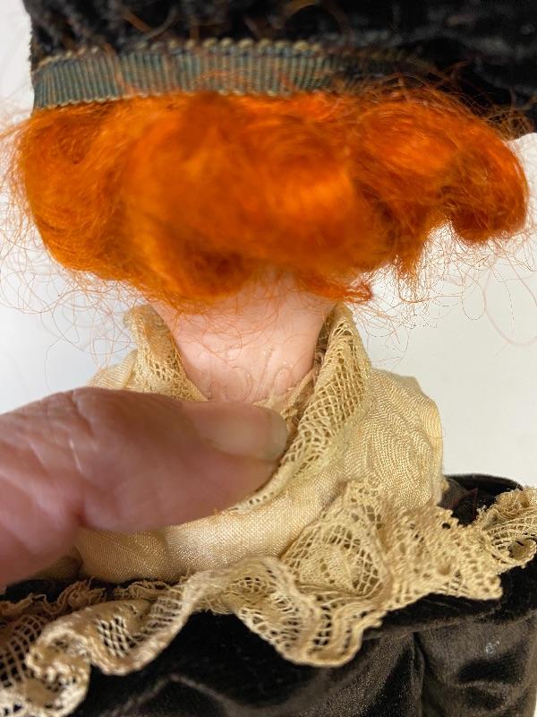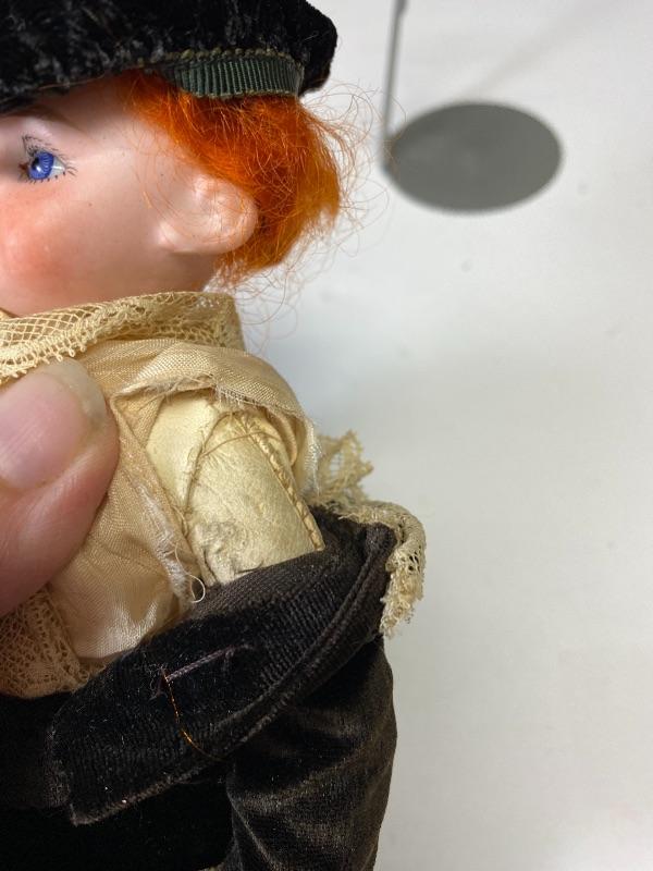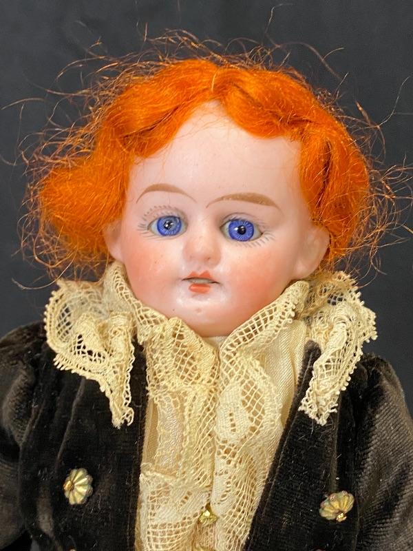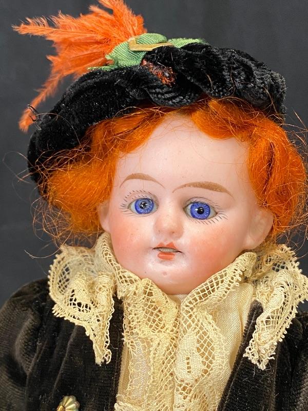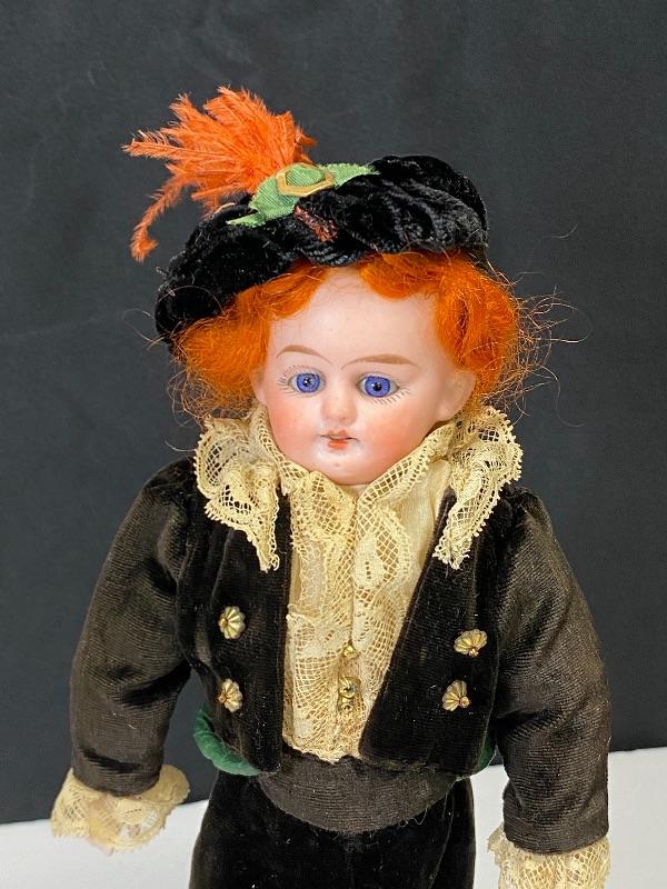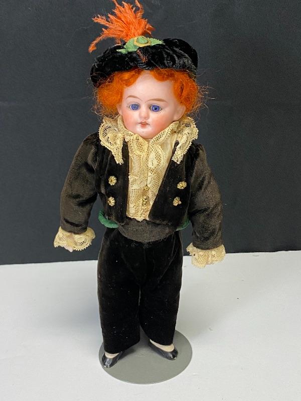 Antique jointed doll. This doll has a bisque head & arms, composite legs, and leather body. Bright orange red hair and blue glass eyes wearing a velvet outfit. Clothes were sewn on, hard to check for markings. Did see the mark 15/0 but that is it. Stands about 9" or so. Comes with stand. Does have a chipped finger.