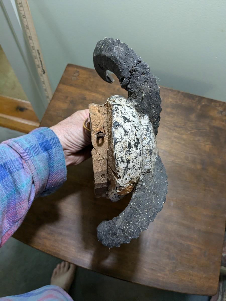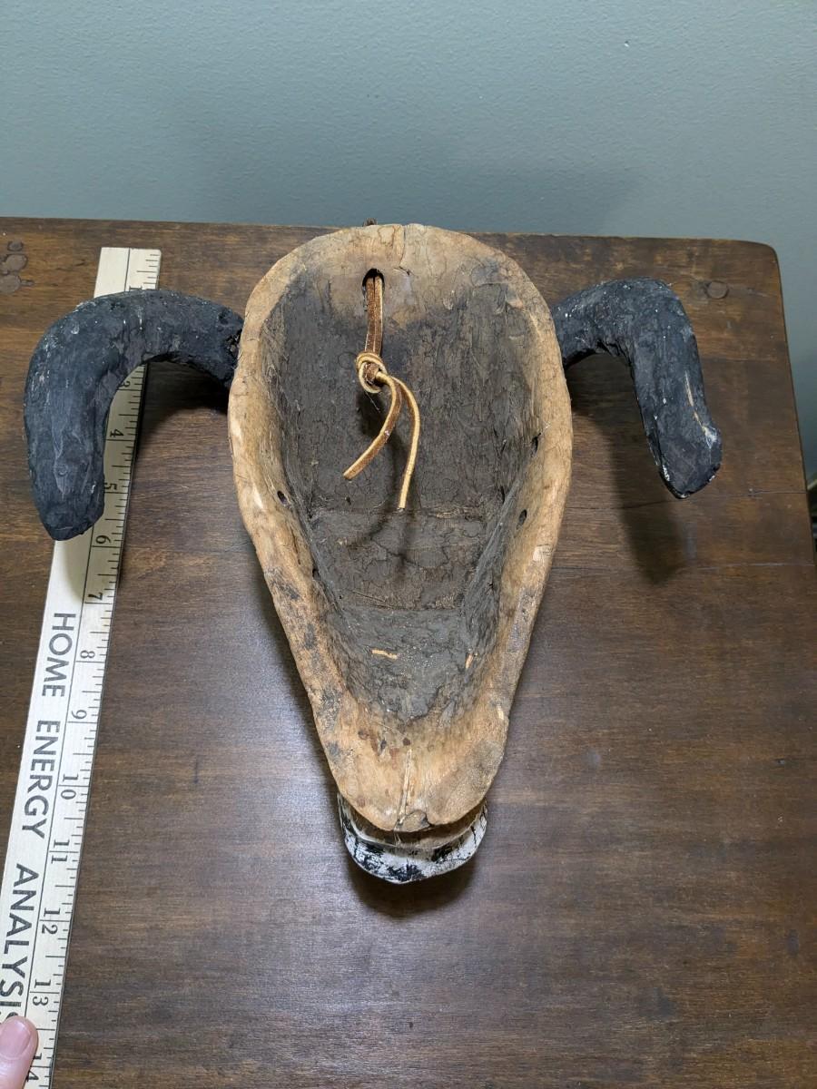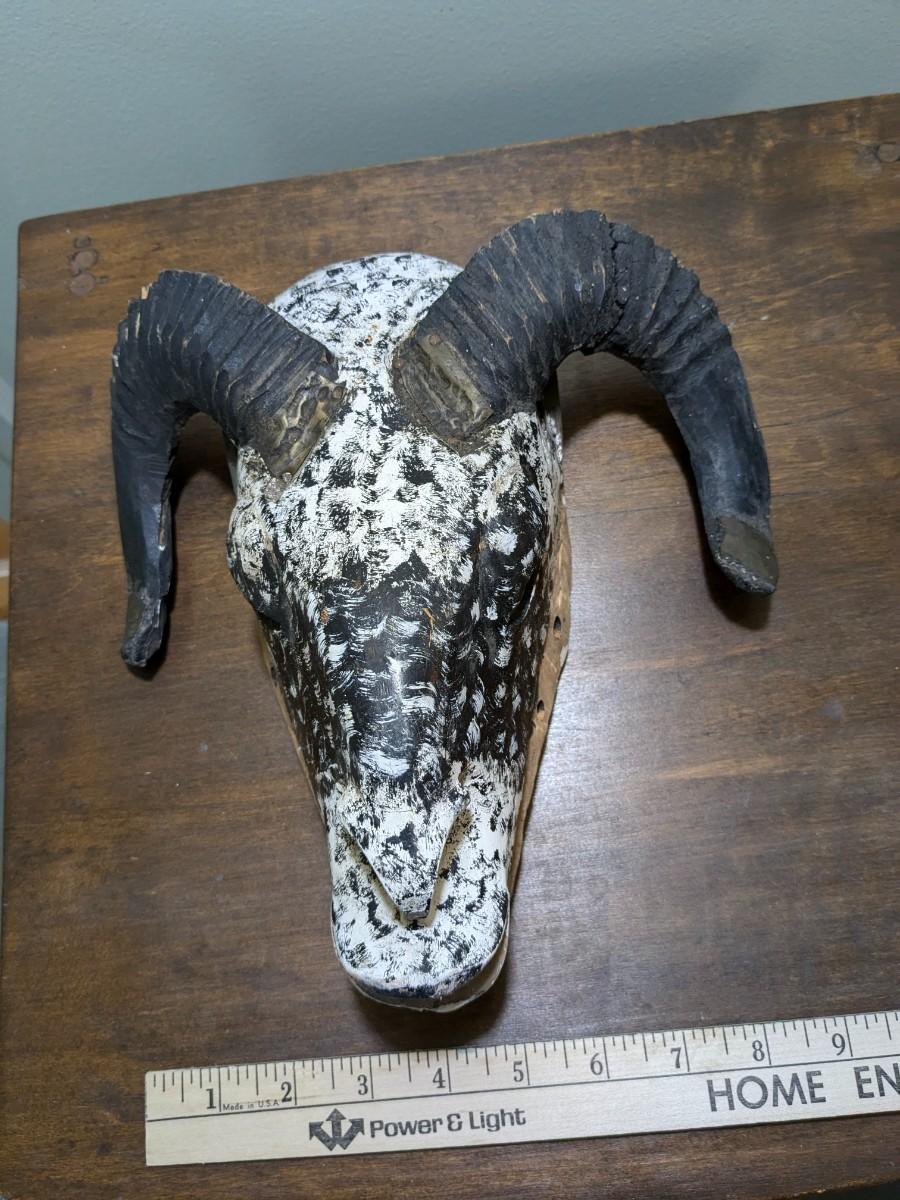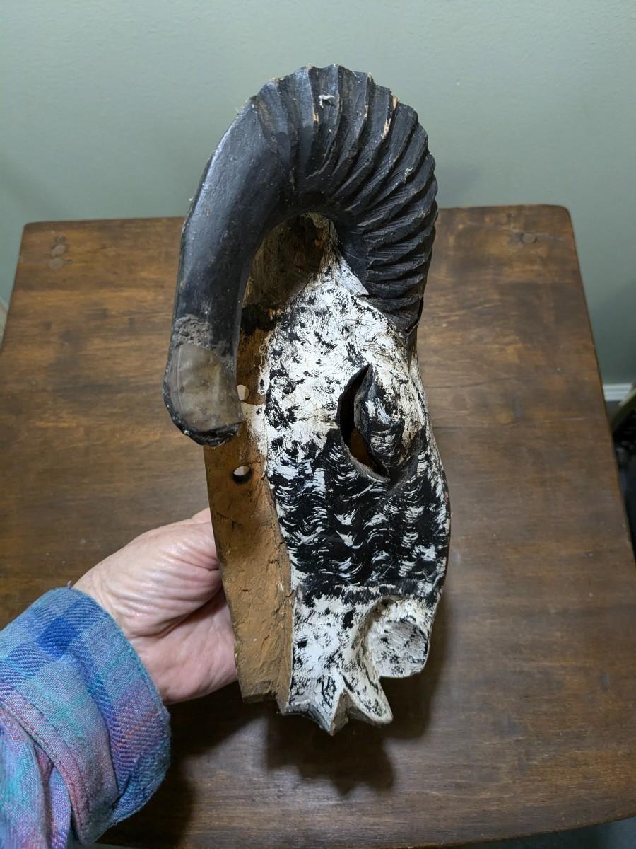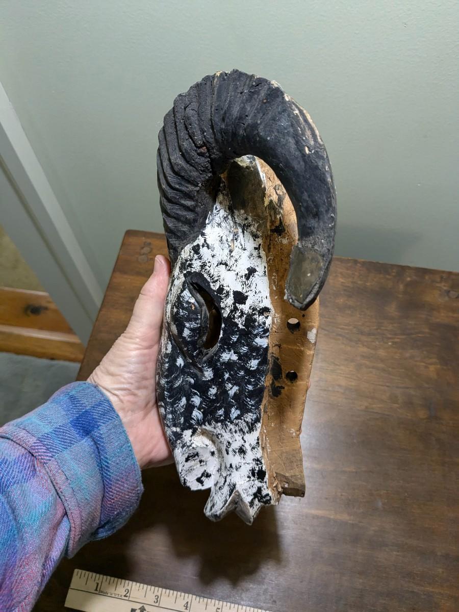 Antique Black and White Hand Carved Head with Genuine Horns Wall Decor