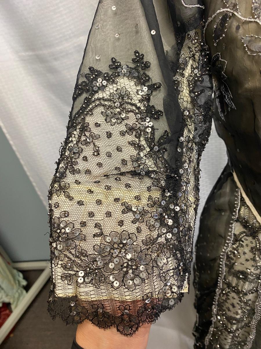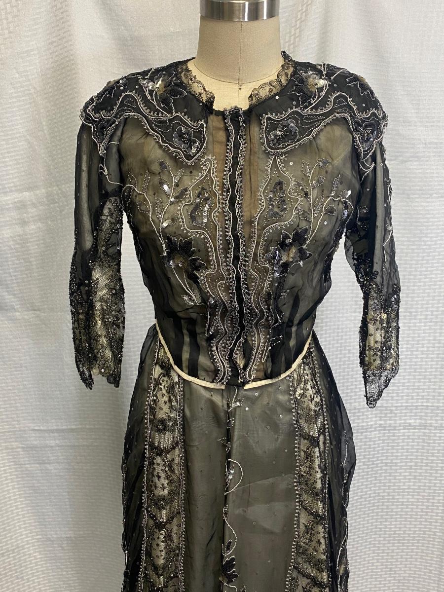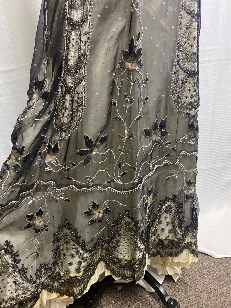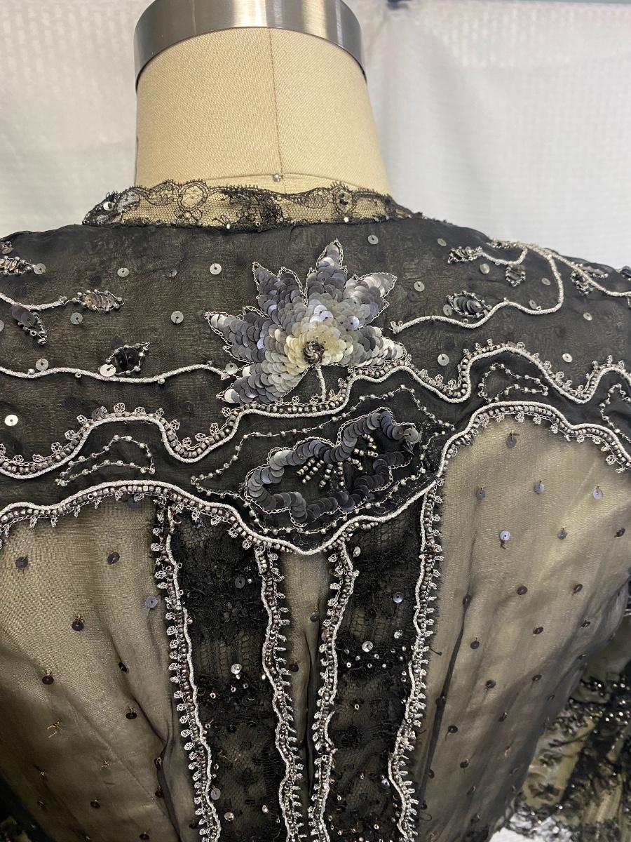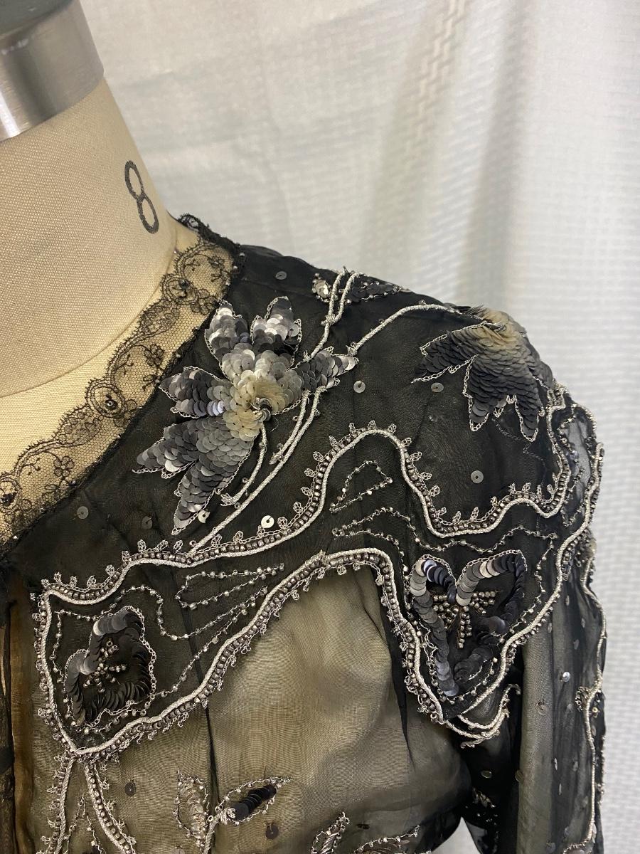 Antique Black Over White Embroidered Sequined Two Piece Gothic Victorian Dress Skirt Blouse. Beautifully done sequined floral embroidery. Lace details. Sheer black over white makes it visually stunning. There is some wear as expected with the antique age. Hook and eye closure with fully boned bodice. About a size 8.