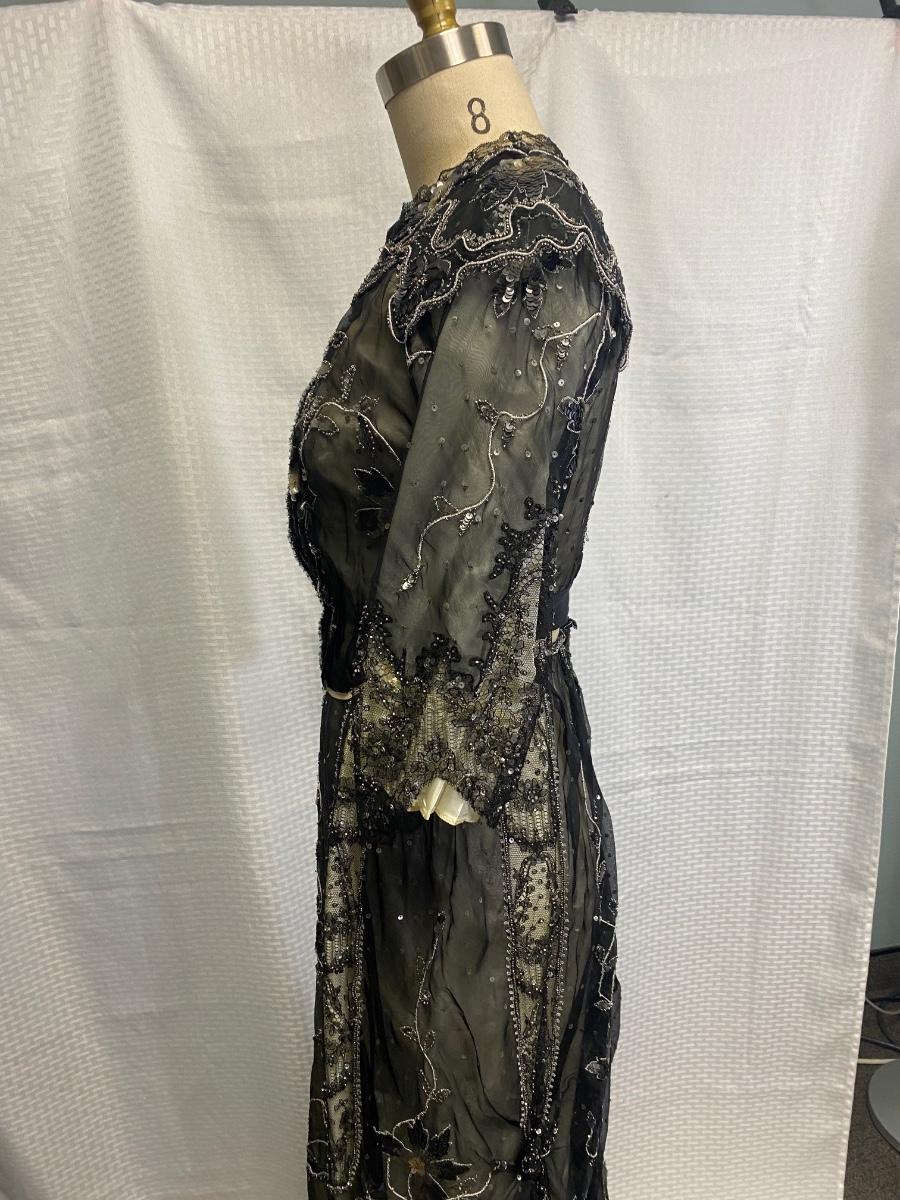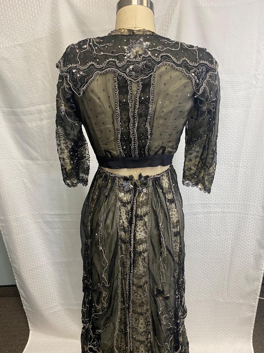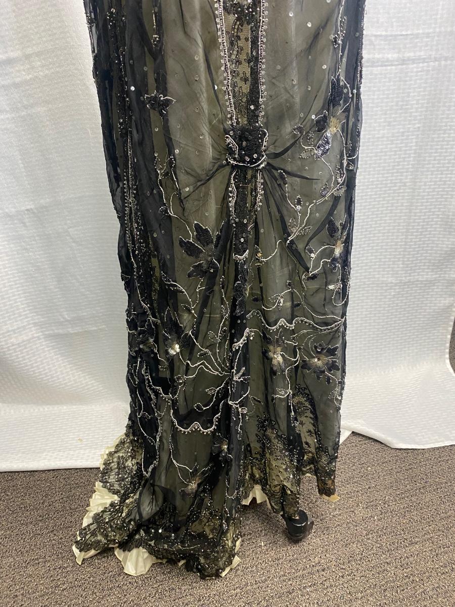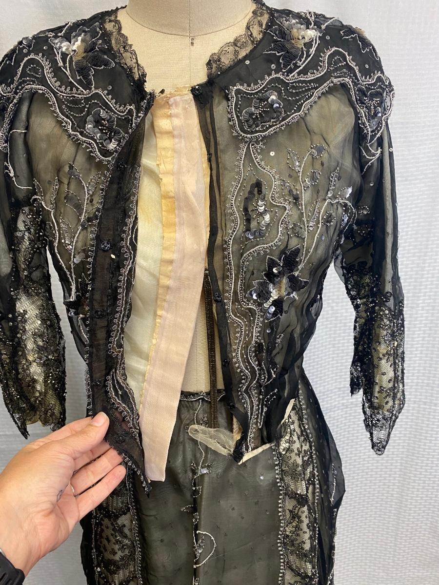 Antique Black Over White Embroidered Sequined Two Piece Gothic Victorian Dress Skirt Blouse. Beautifully done sequined floral embroidery. Lace details. Sheer black over white makes it visually stunning. There is some wear as expected with the antique age. Hook and eye closure with fully boned bodice. About a size 8.