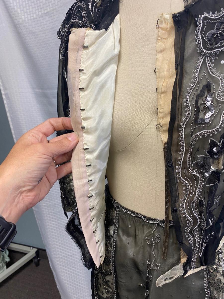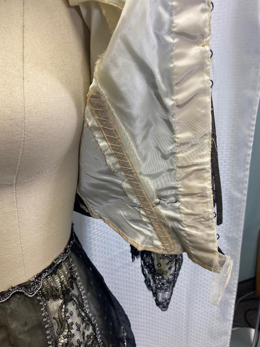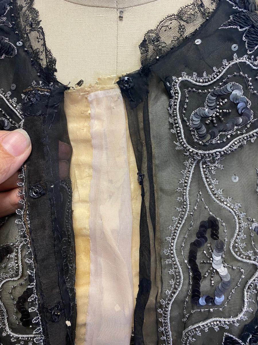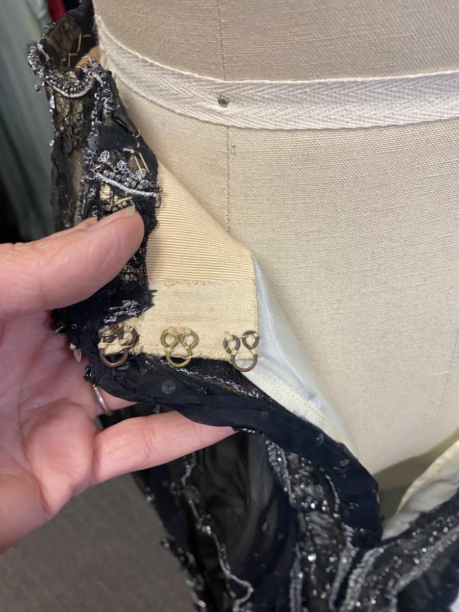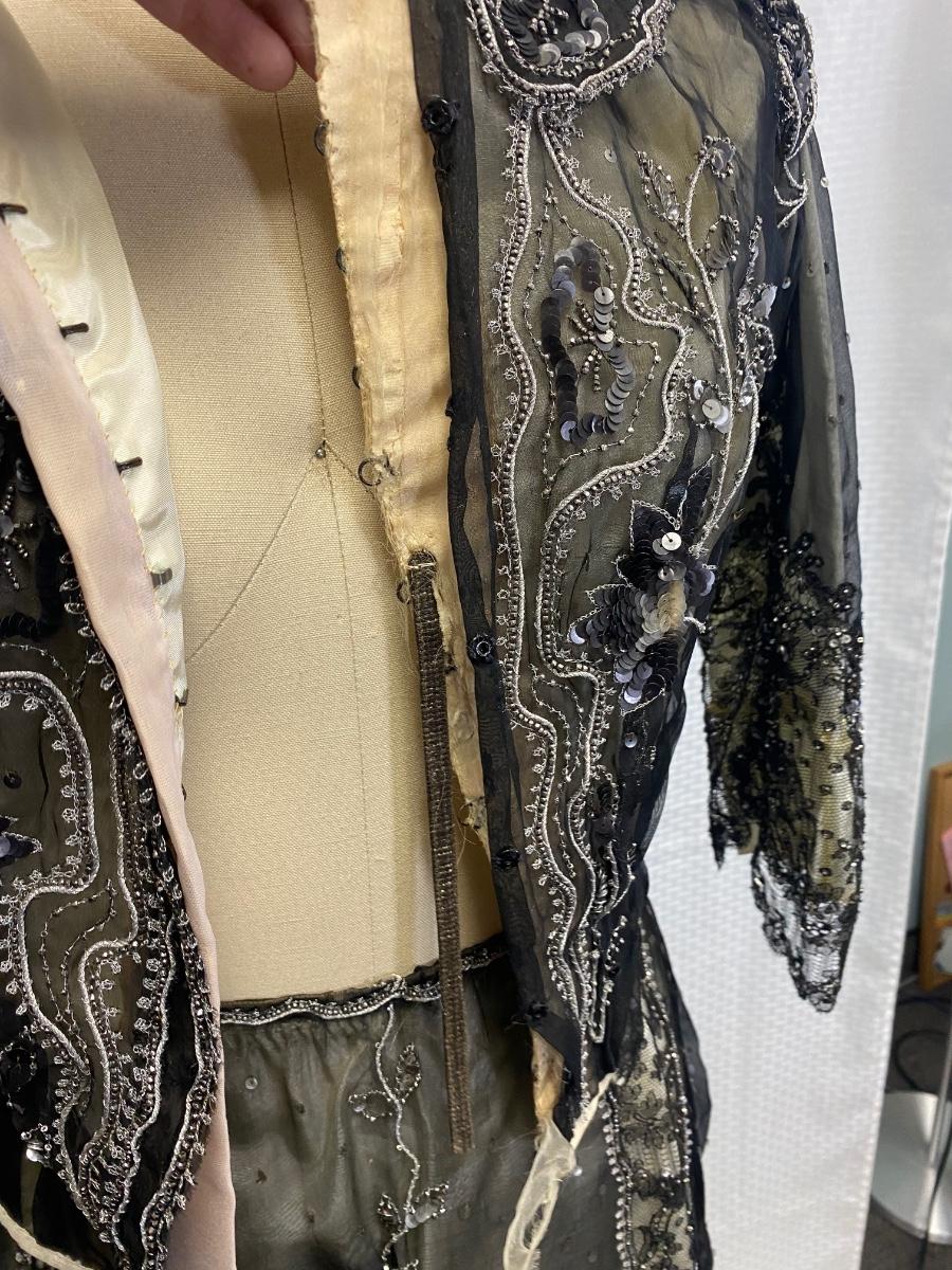Antique Black Over White Embroidered Sequined Two Piece Gothic Victorian Dress Skirt Blouse. Beautifully done sequined floral embroidery. Lace details. Sheer black over white makes it visually stunning. There is some wear as expected with the antique age. Hook and eye closure with fully boned bodice. About a size 8.