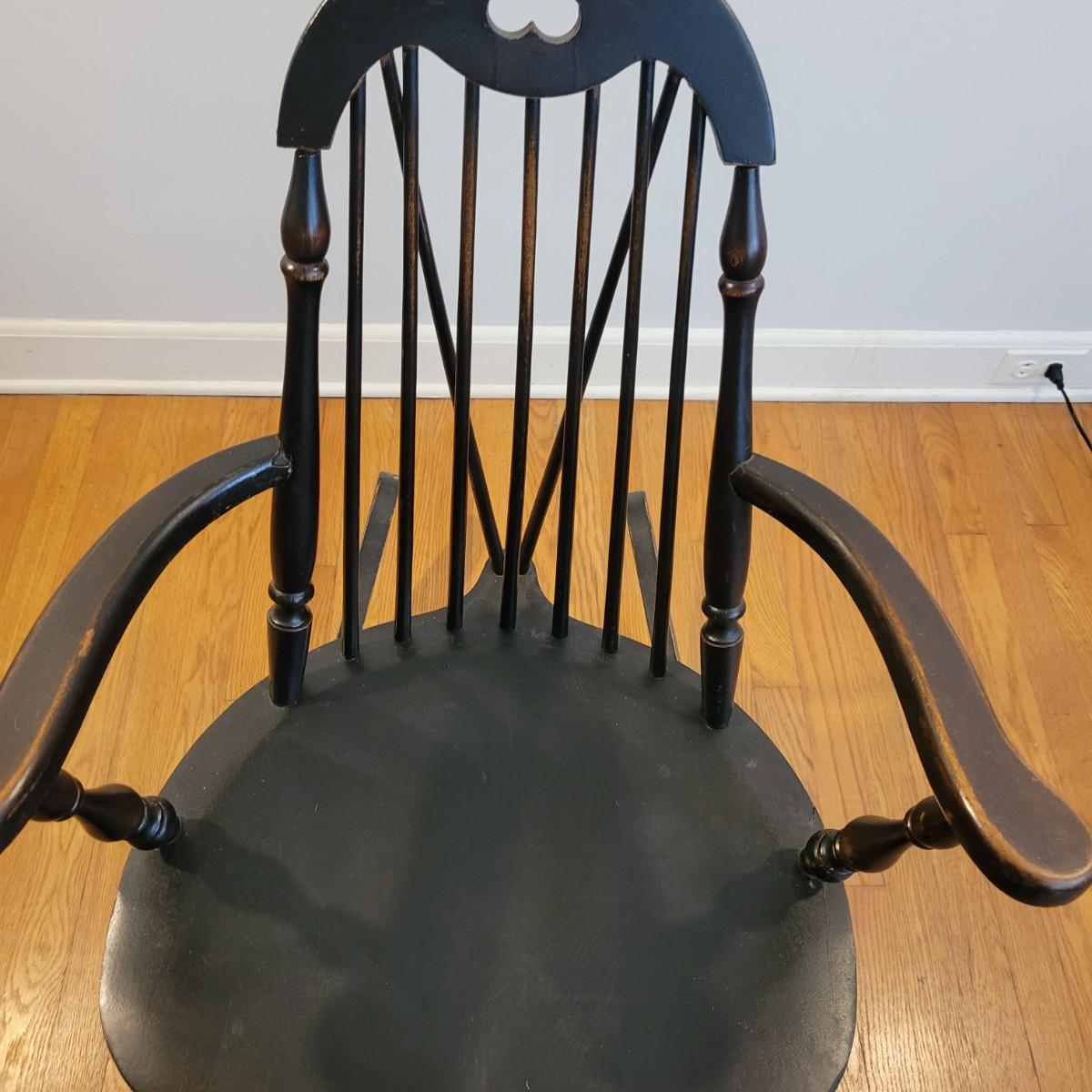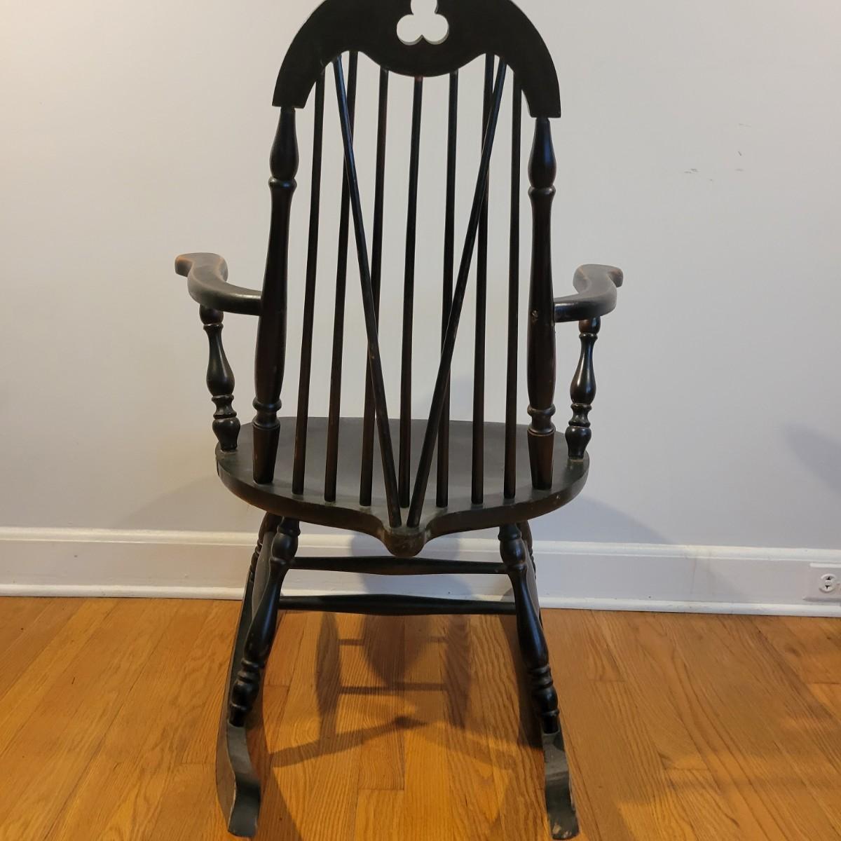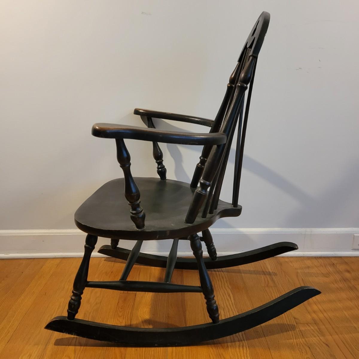 Antique black Windsor rocking chair in good condition with some wear from age. No notable gouges or scratches. Stain is worn in a few areas from use. Chair measures approximately 26" x 31" x 36". Seat height is approximately 14.5" Local pickup only
