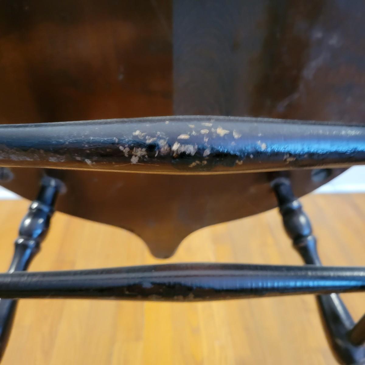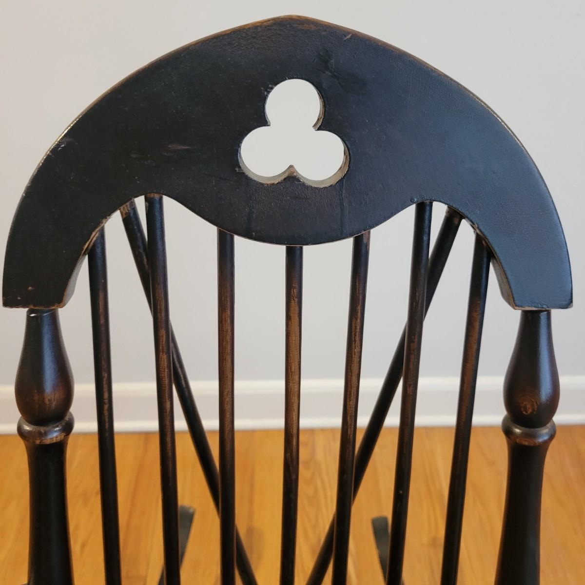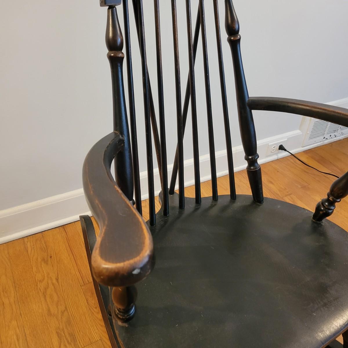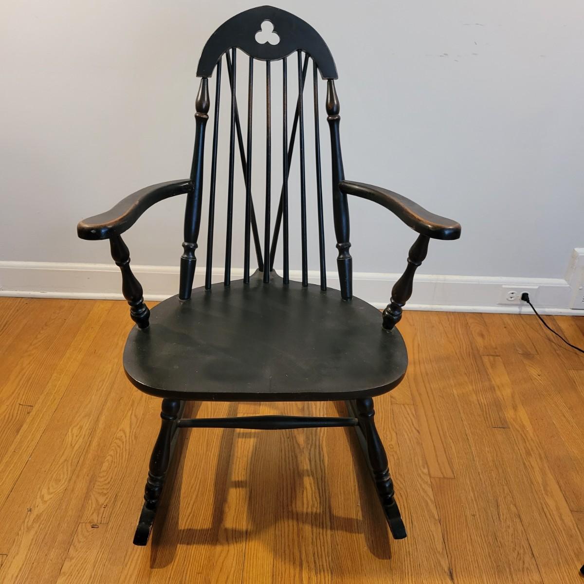 Antique black Windsor rocking chair in good condition with some wear from age. No notable gouges or scratches. Stain is worn in a few areas from use. Chair measures approximately 26" x 31" x 36". Seat height is approximately 14.5" Local pickup only