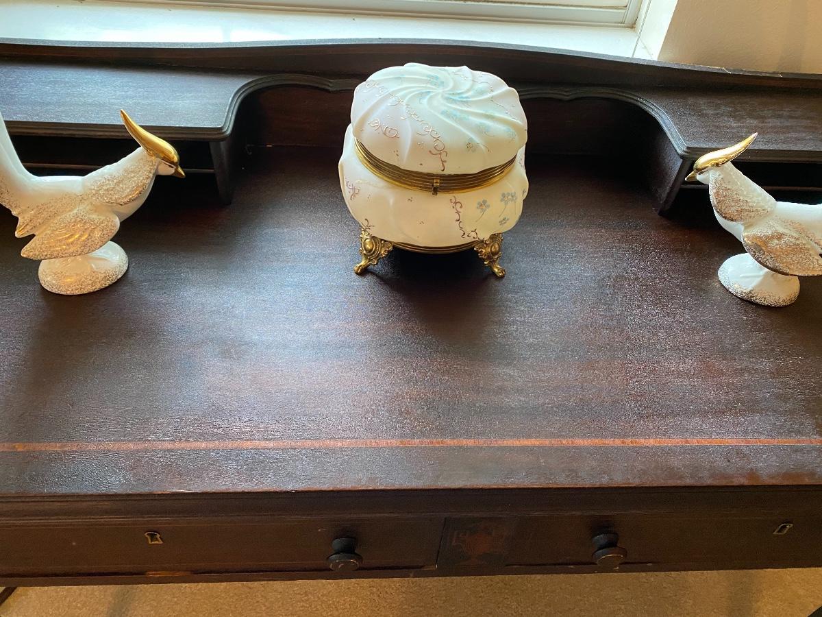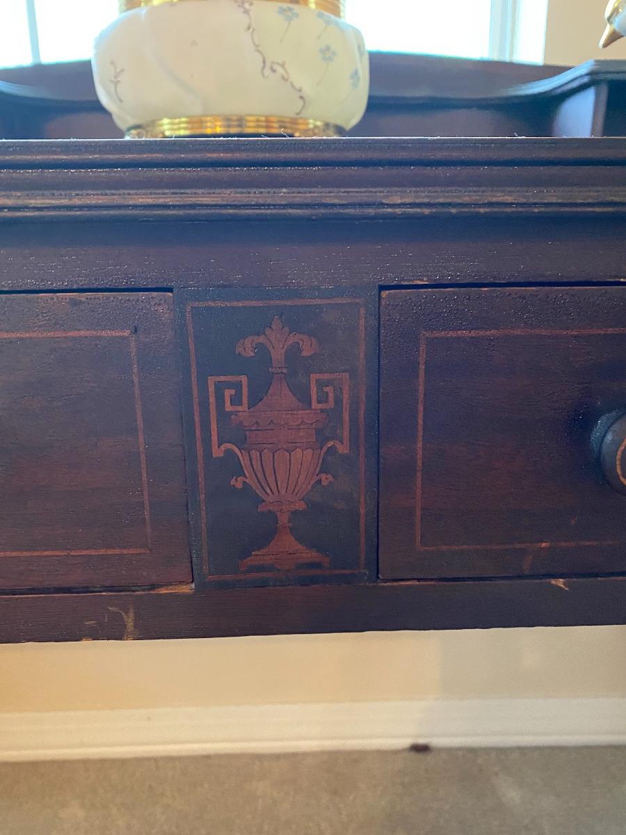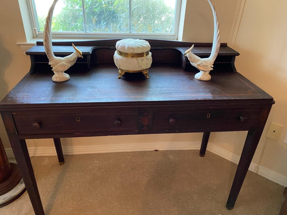 Antique black wooden writing desk with stenciling and cubbies. Brass capped legs & key holes. 43"W x 20"D x 33 3/4" H. The finish is rough (alligatored) but the desk is really nice.