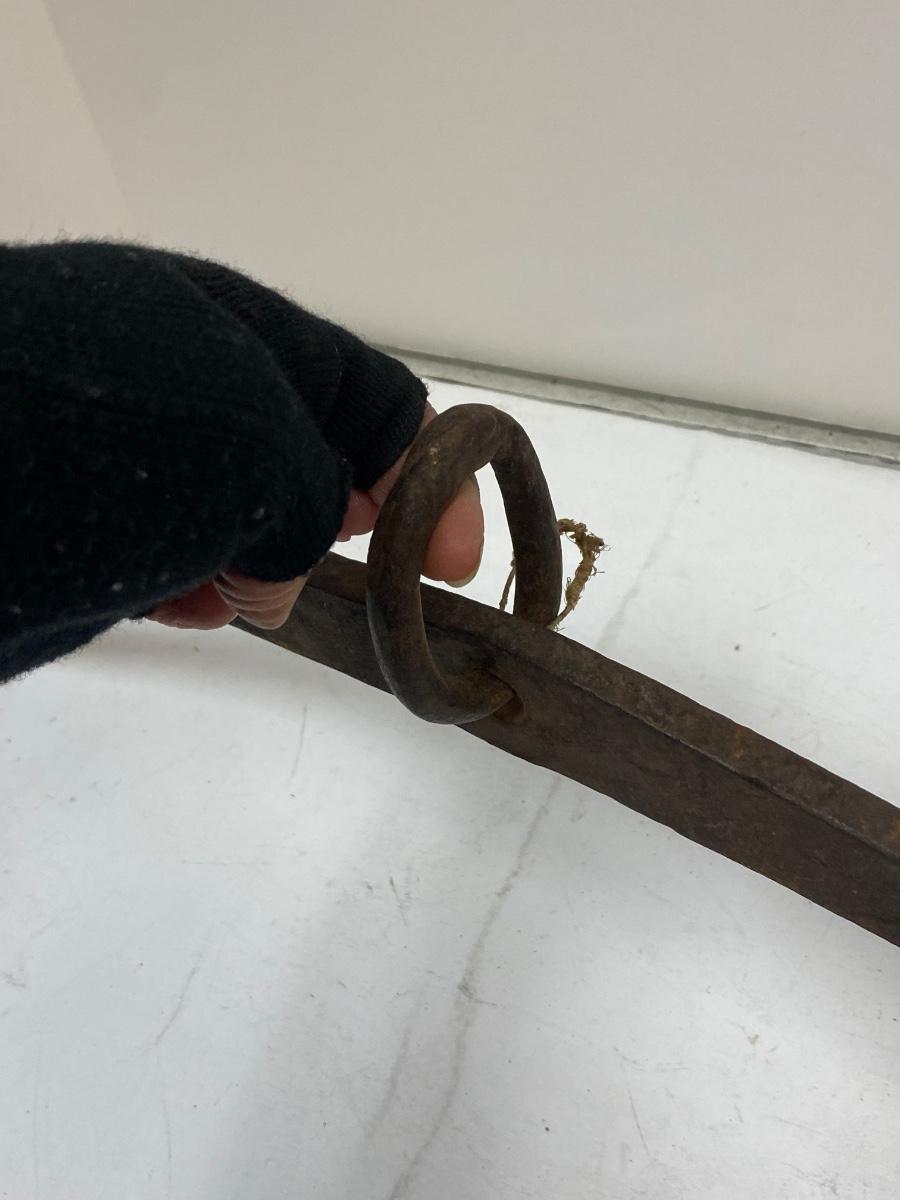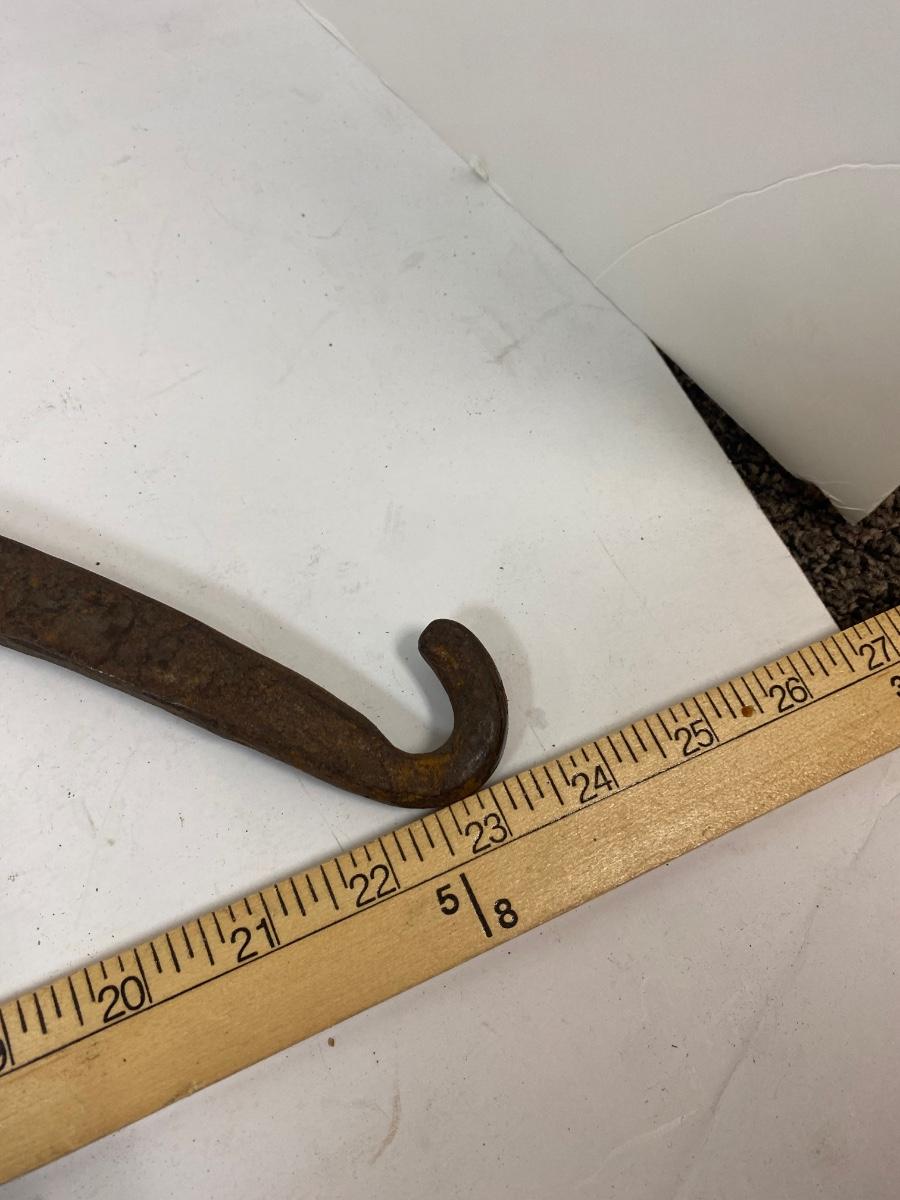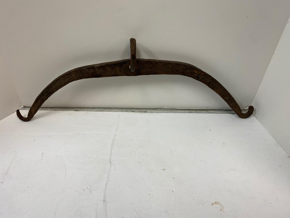 Antique Blacksmith Made Metal Double Hook Bow Hanger. Center loop for hanging. In good antique condition. About 24" length.