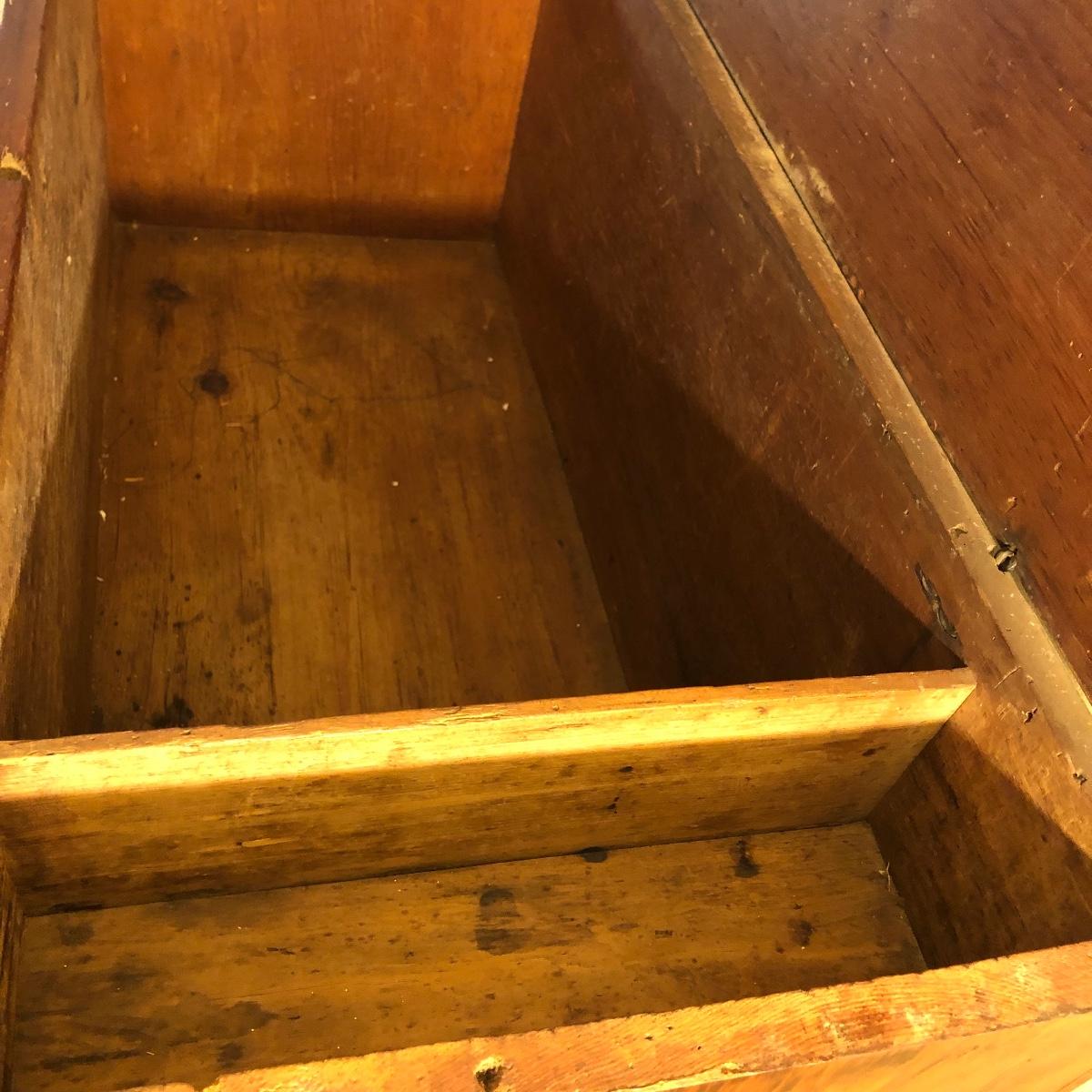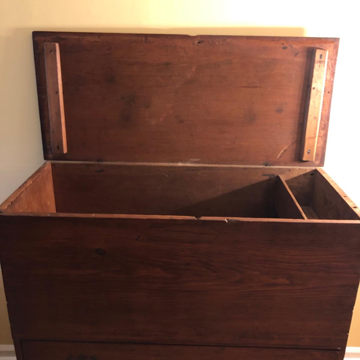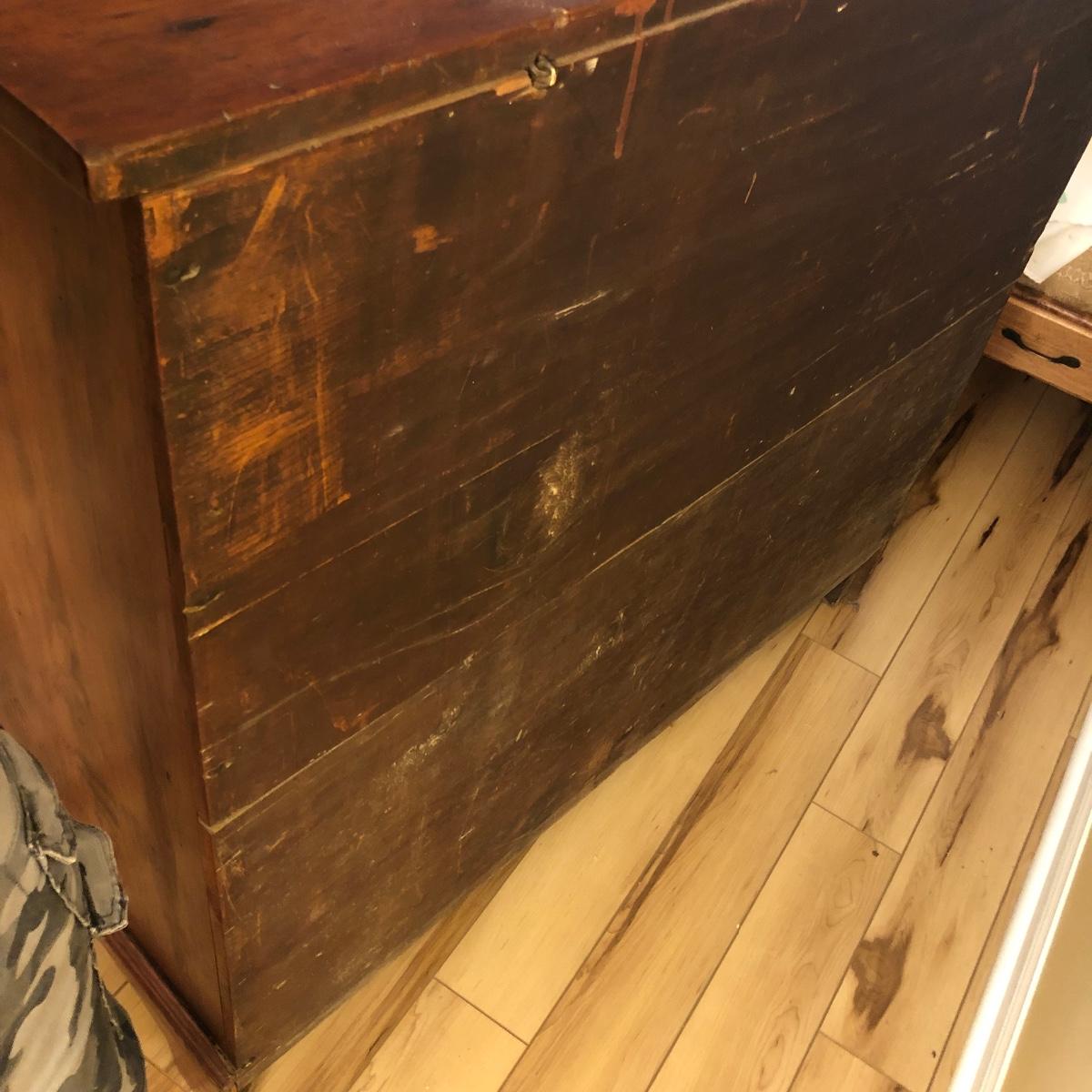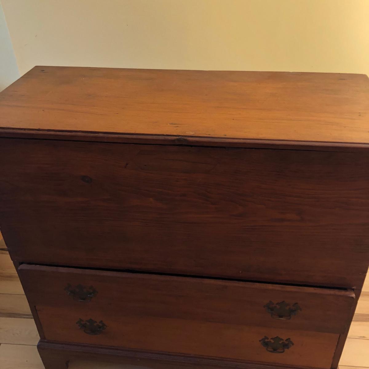 Lot includes a large chest with two dovetailed drawers at the bottom. Chest is in nice condition with just a few nicks and scratches and the top has a slight warp, see pictures. It’s a large size to hold lots of blankets or whatever you desire. Piece measures 18.5” x 43” x 42” and the upper chest is 17” deep. Bring help item is substantial.