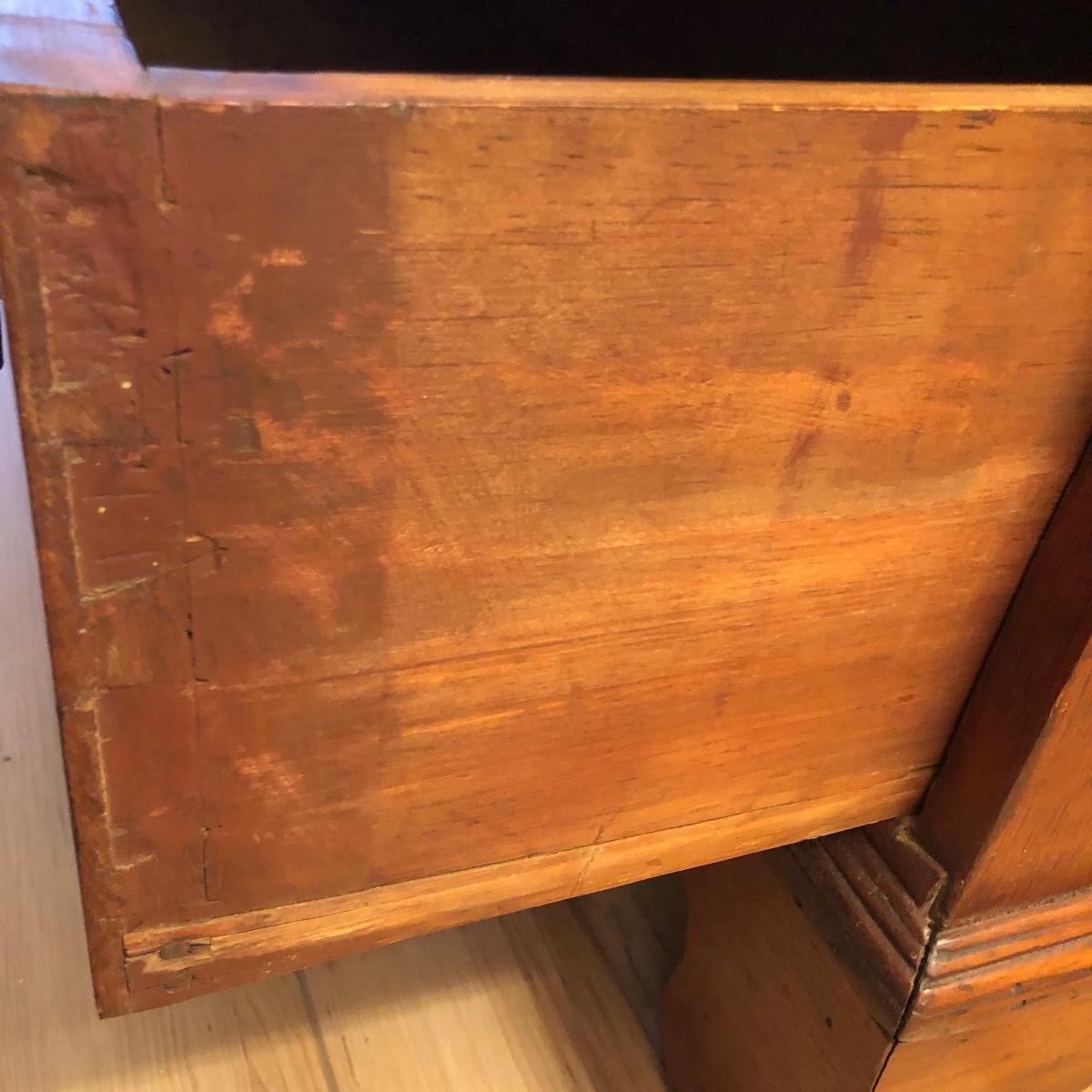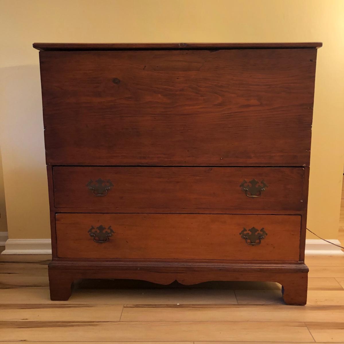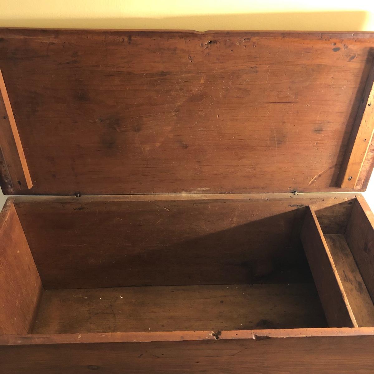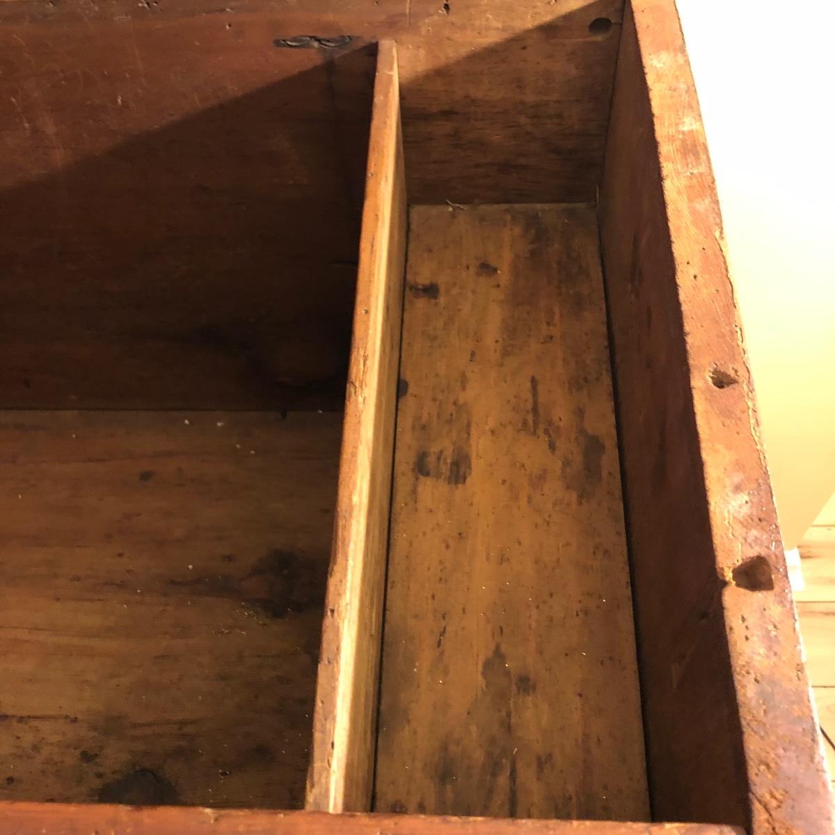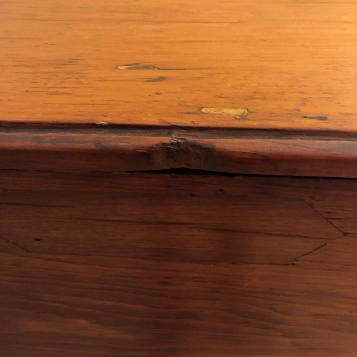 Lot includes a large chest with two dovetailed drawers at the bottom. Chest is in nice condition with just a few nicks and scratches and the top has a slight warp, see pictures. It’s a large size to hold lots of blankets or whatever you desire. Piece measures 18.5” x 43” x 42” and the upper chest is 17” deep. Bring help item is substantial.