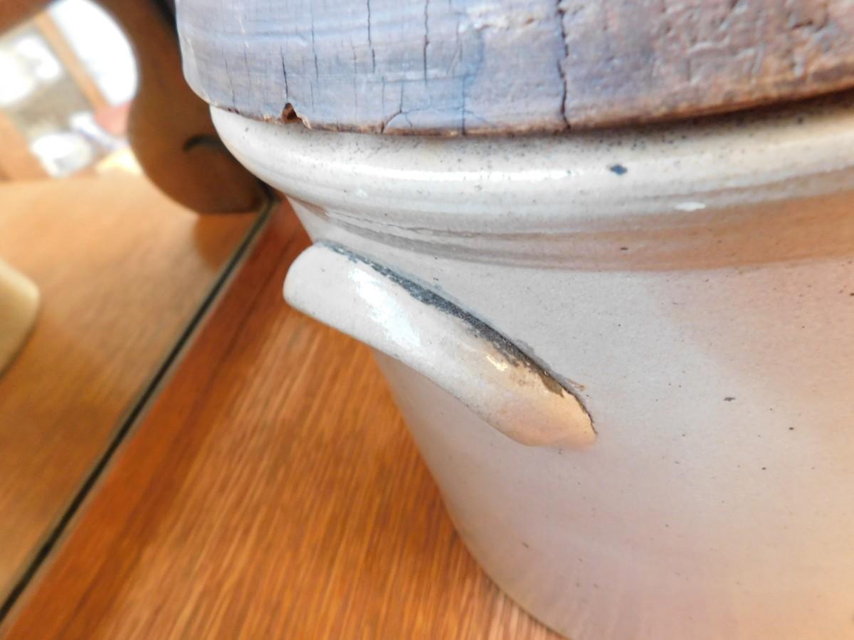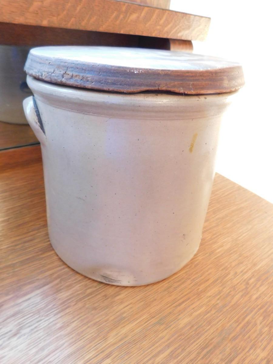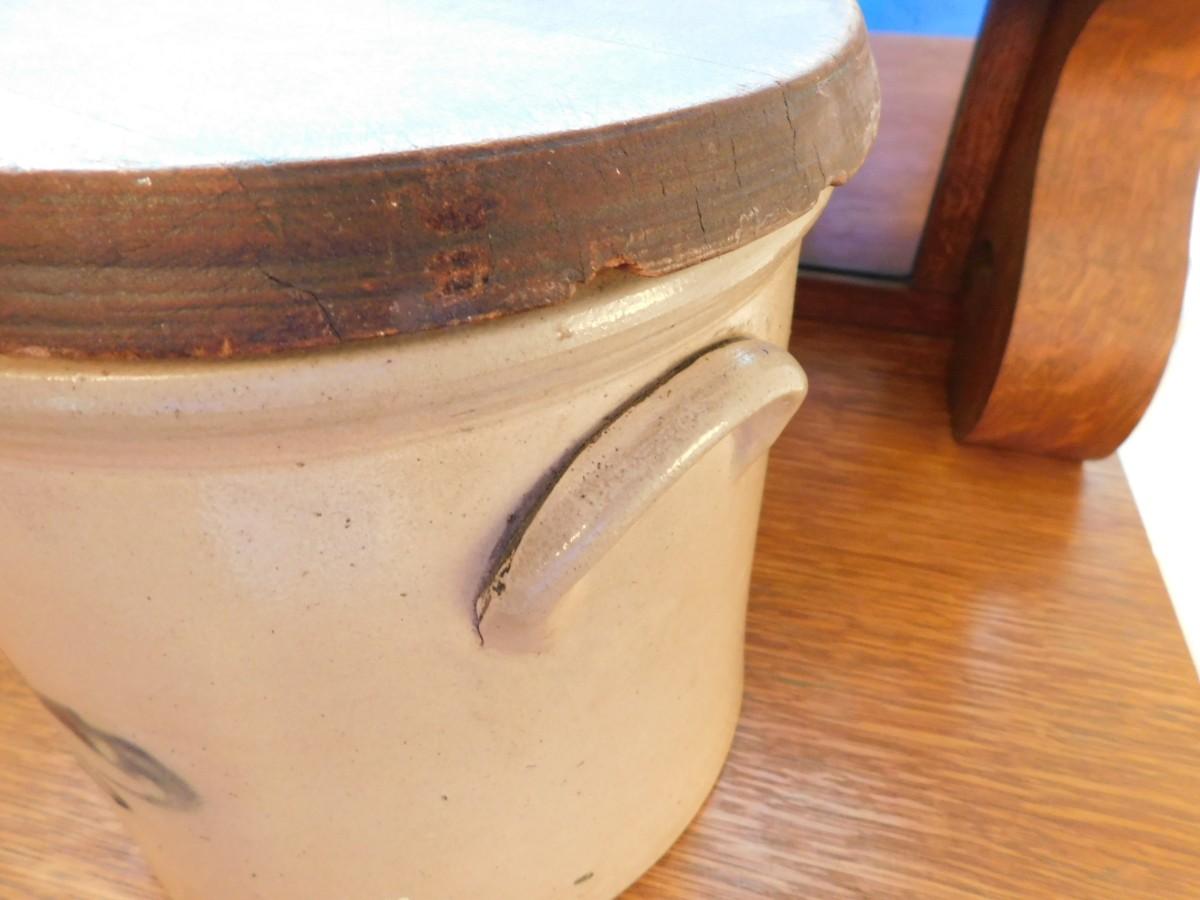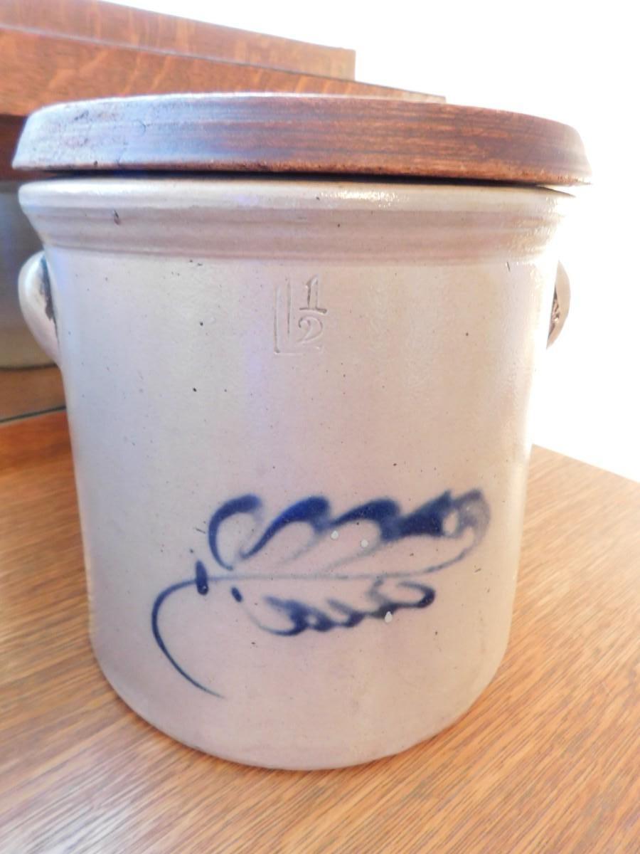 Antique Blue Glaze Stoneware 1.5 Gallon Crock With Wood Lid