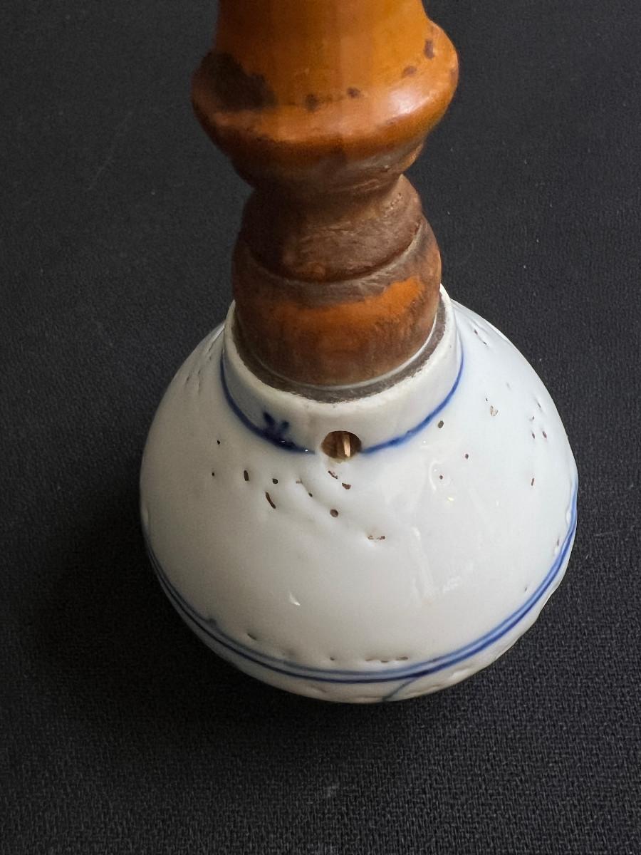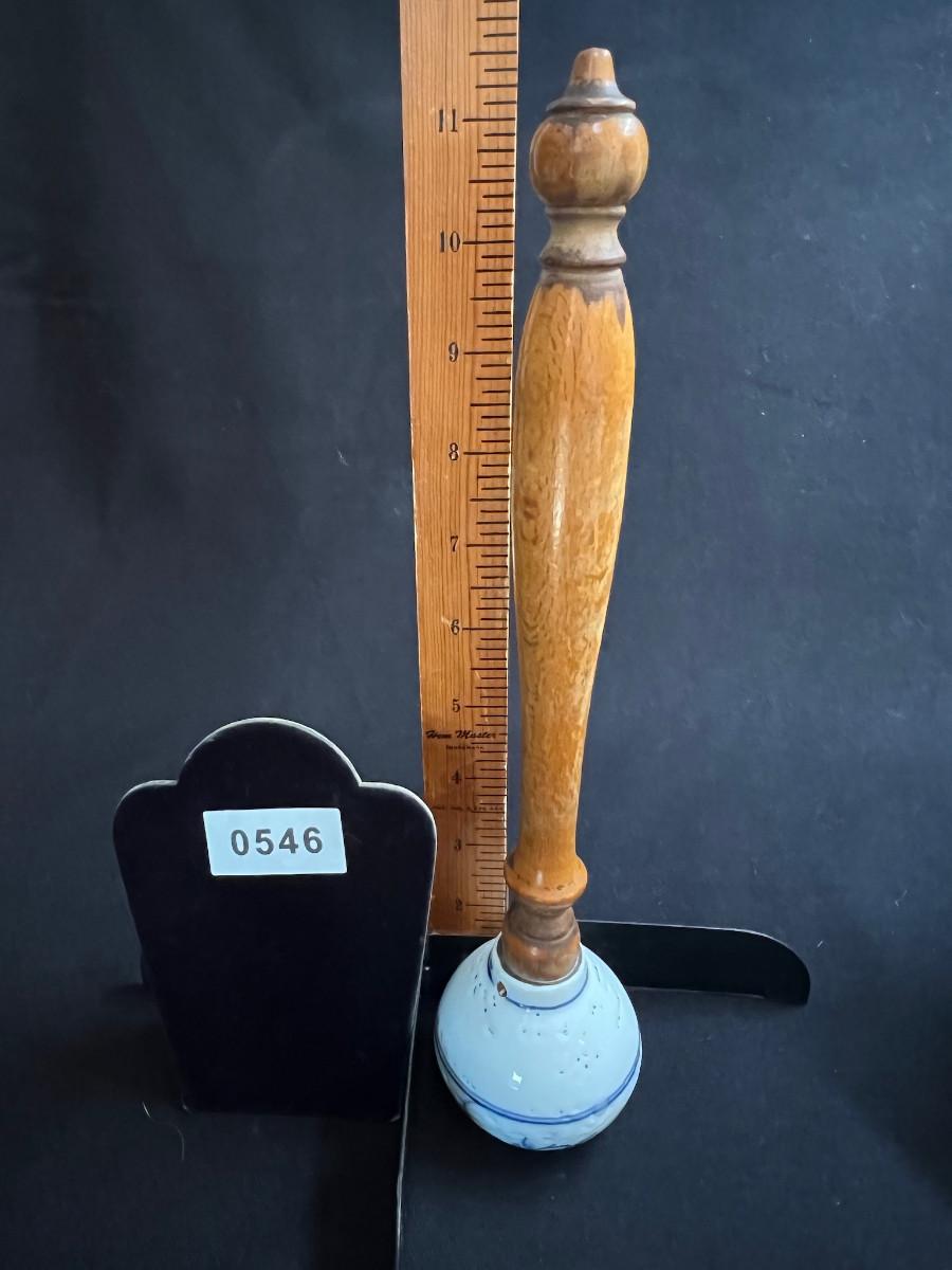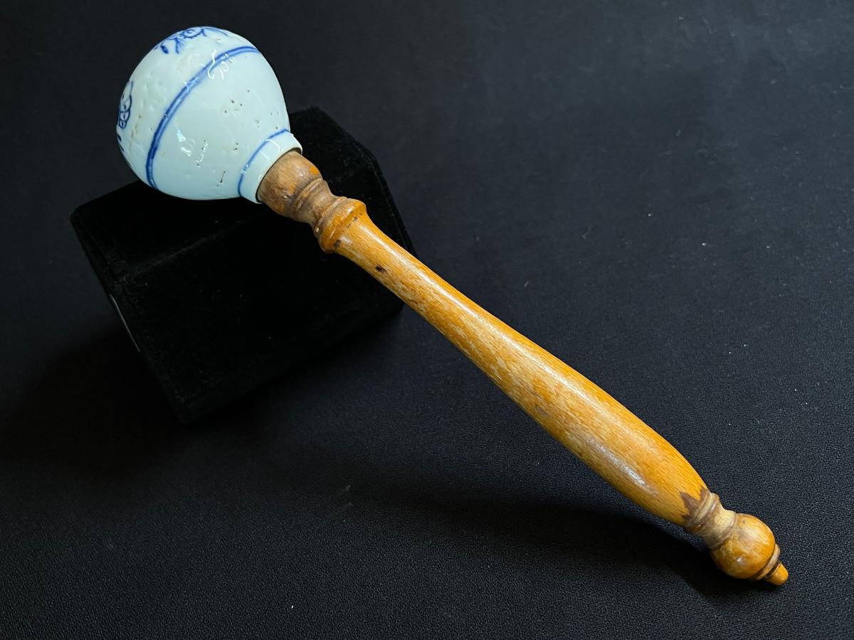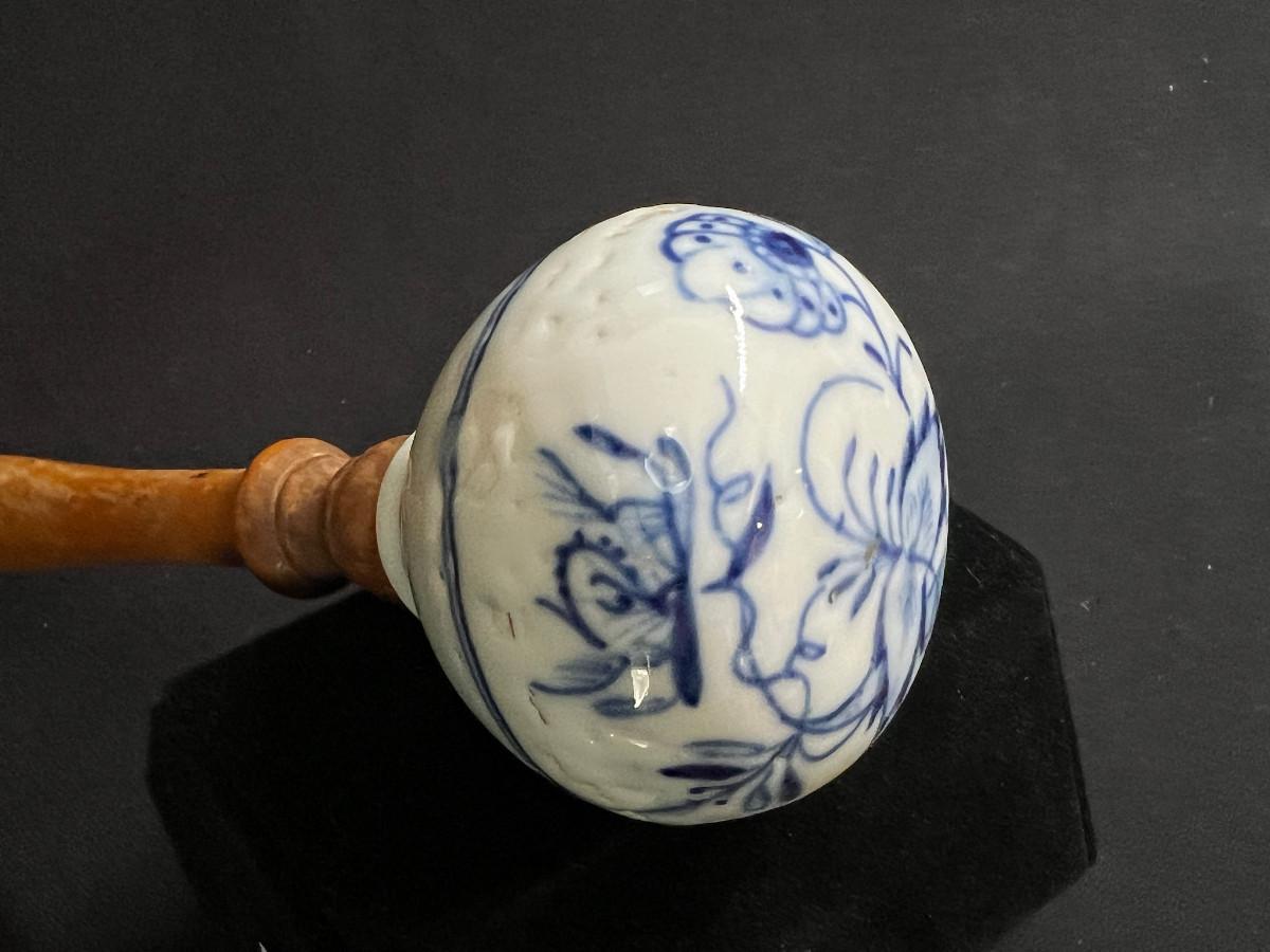 Antique Blue Onion Glazed Porcelain Sock Darner or Pestle with Wooden Handle
