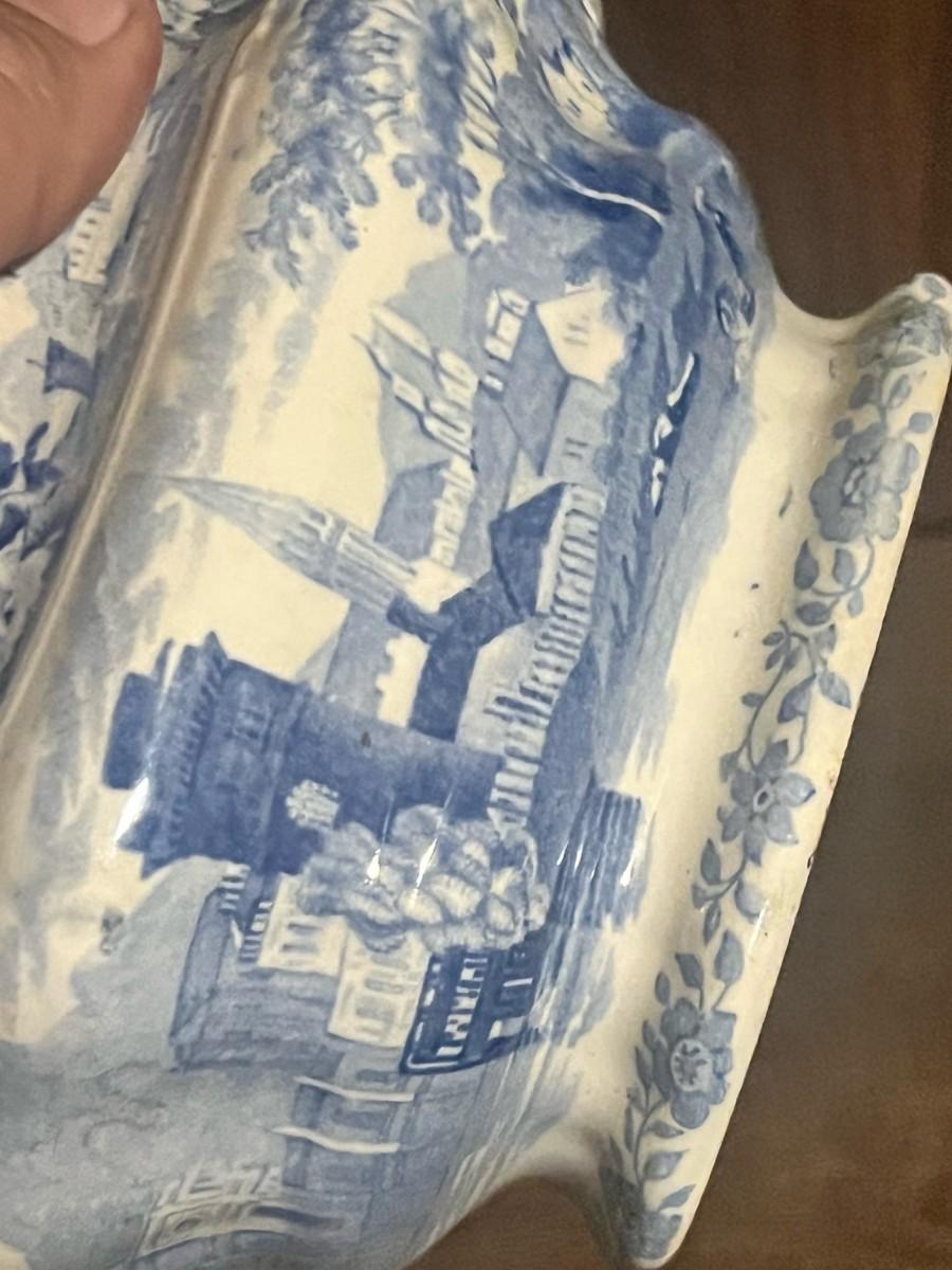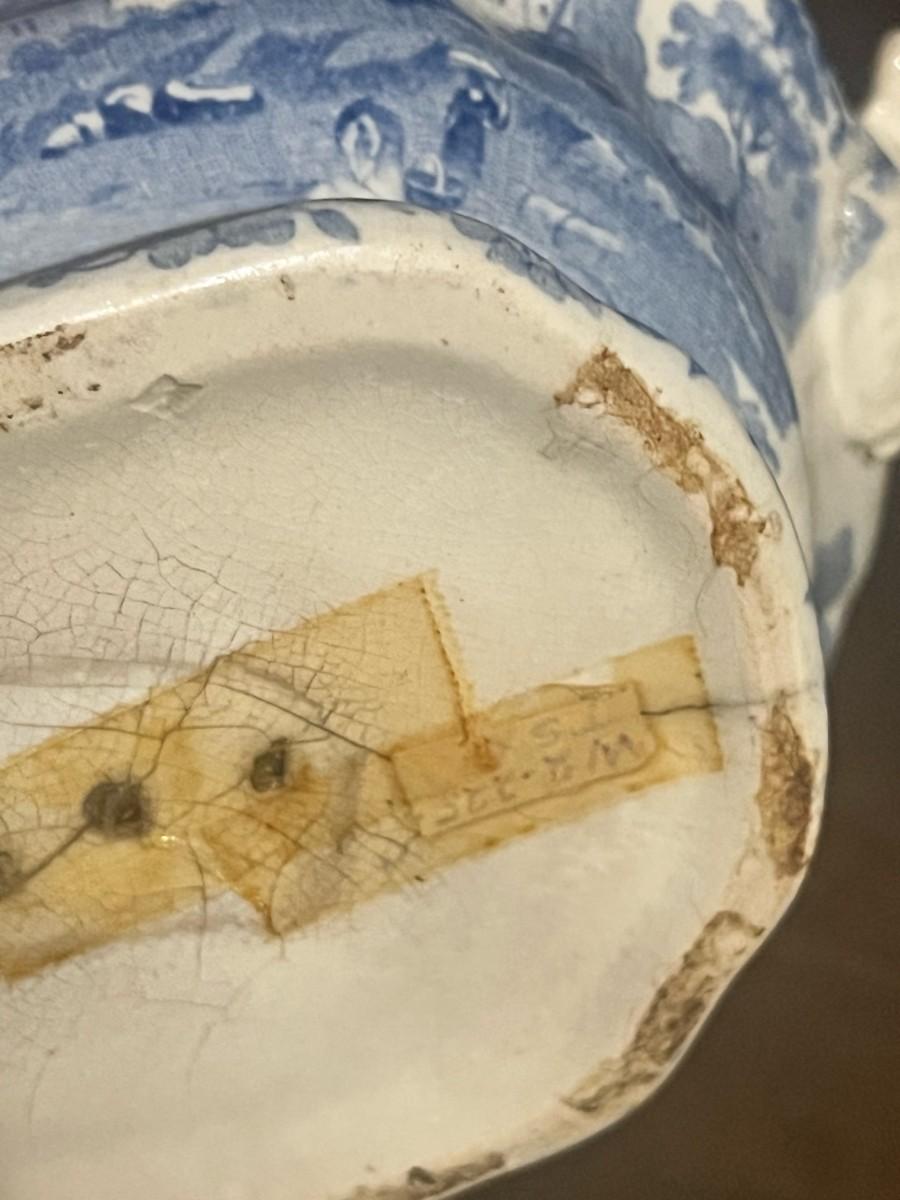 Beautiful antique blue & white transferware ironstone jardinière featuring a scenic pastoral village landscape on all sides. The piece has ornate floral borders, raised side handles, and classic early English-style transfer design. The glaze shows uniform age crazing throughout, consistent with late 1800s–early 1900s production. Bottom bears remnants of an old dealer or museum-style inventory label. No visible maker’s mark, typical of many early Staffordshire/English potteries.
