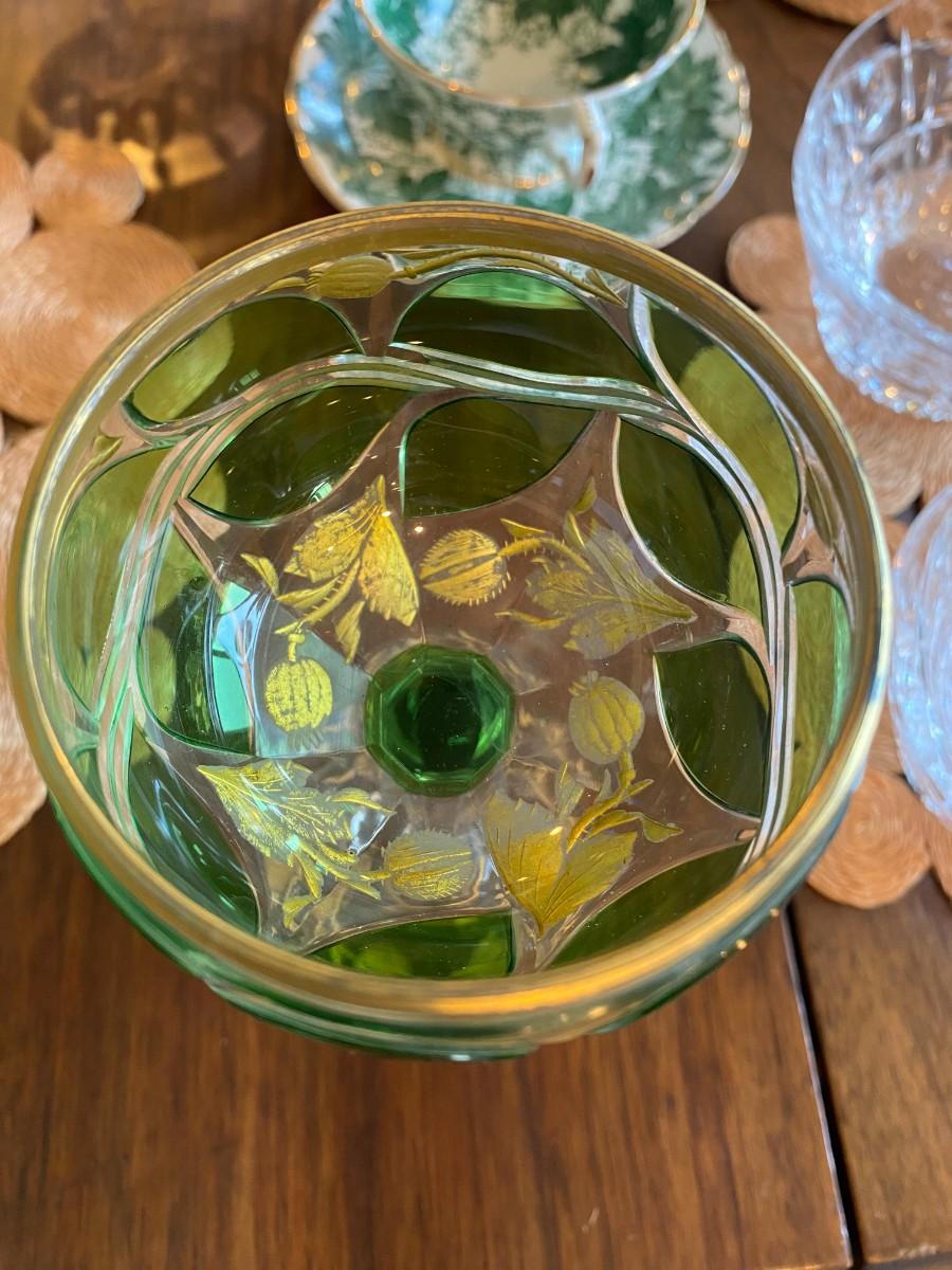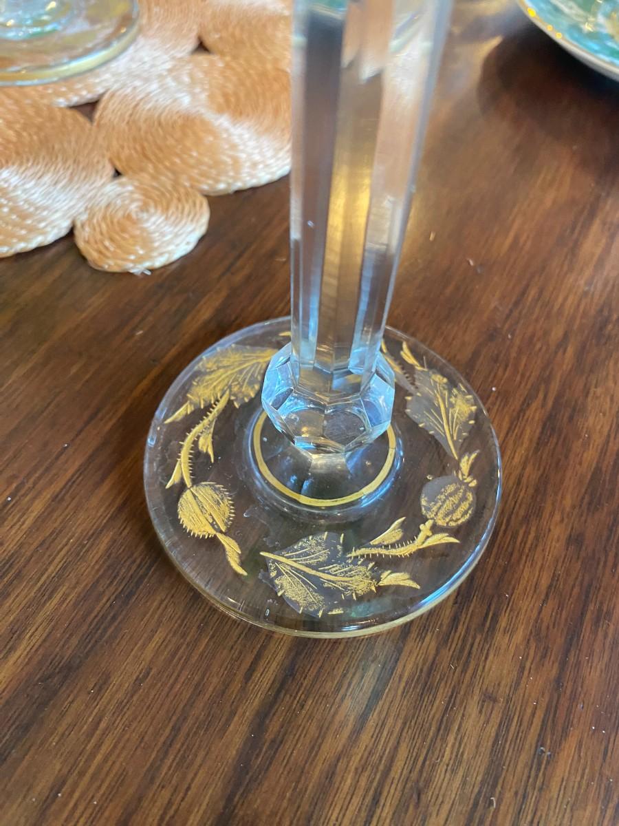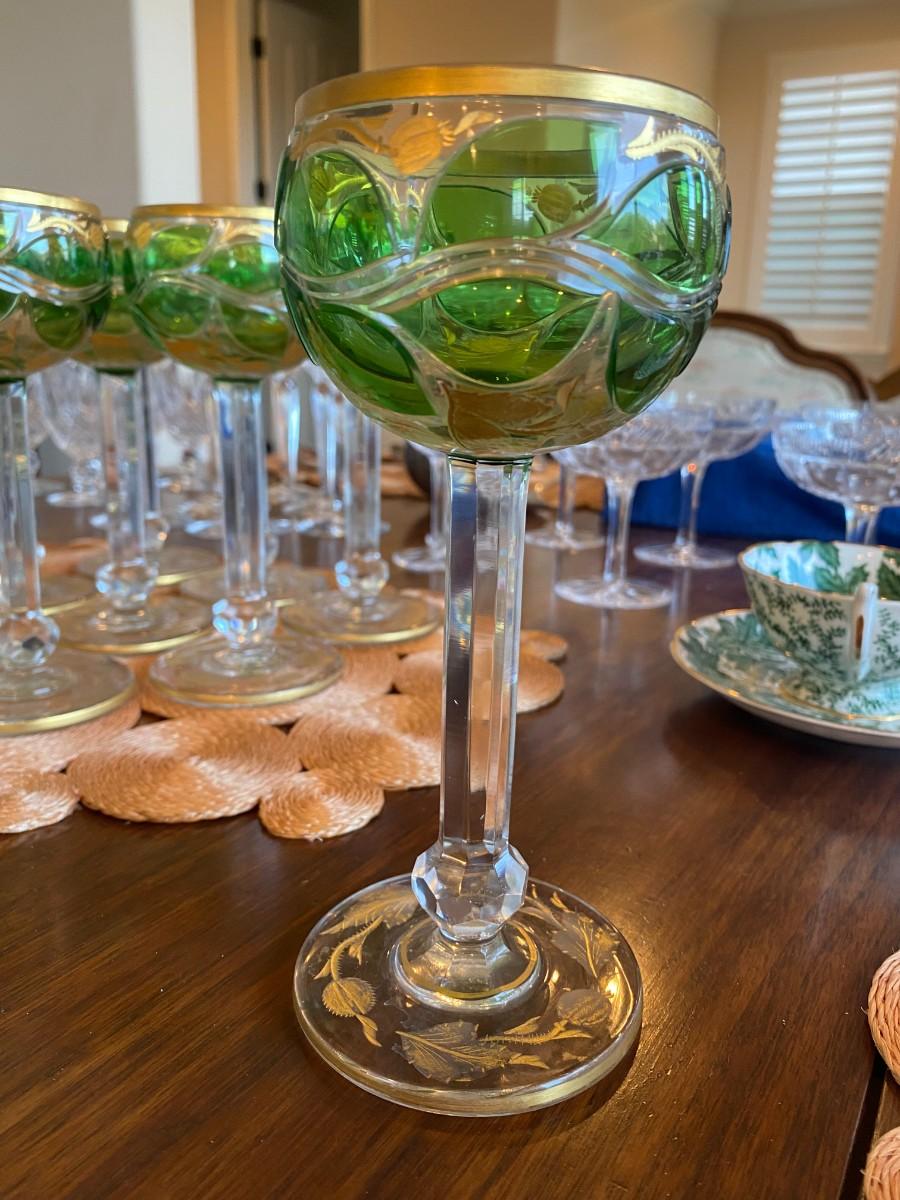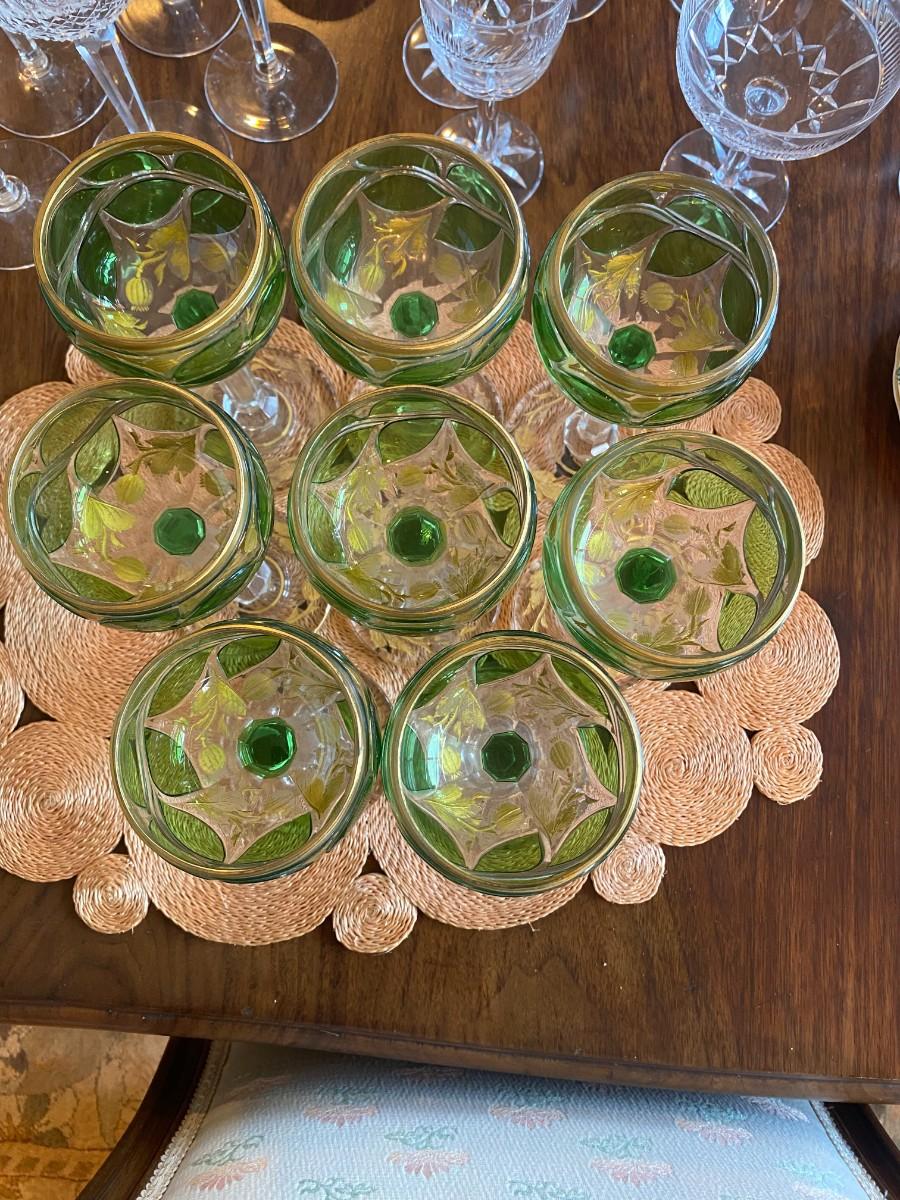 Antique Bohemian Green Wine Goblets - (one with significant wear on gold).