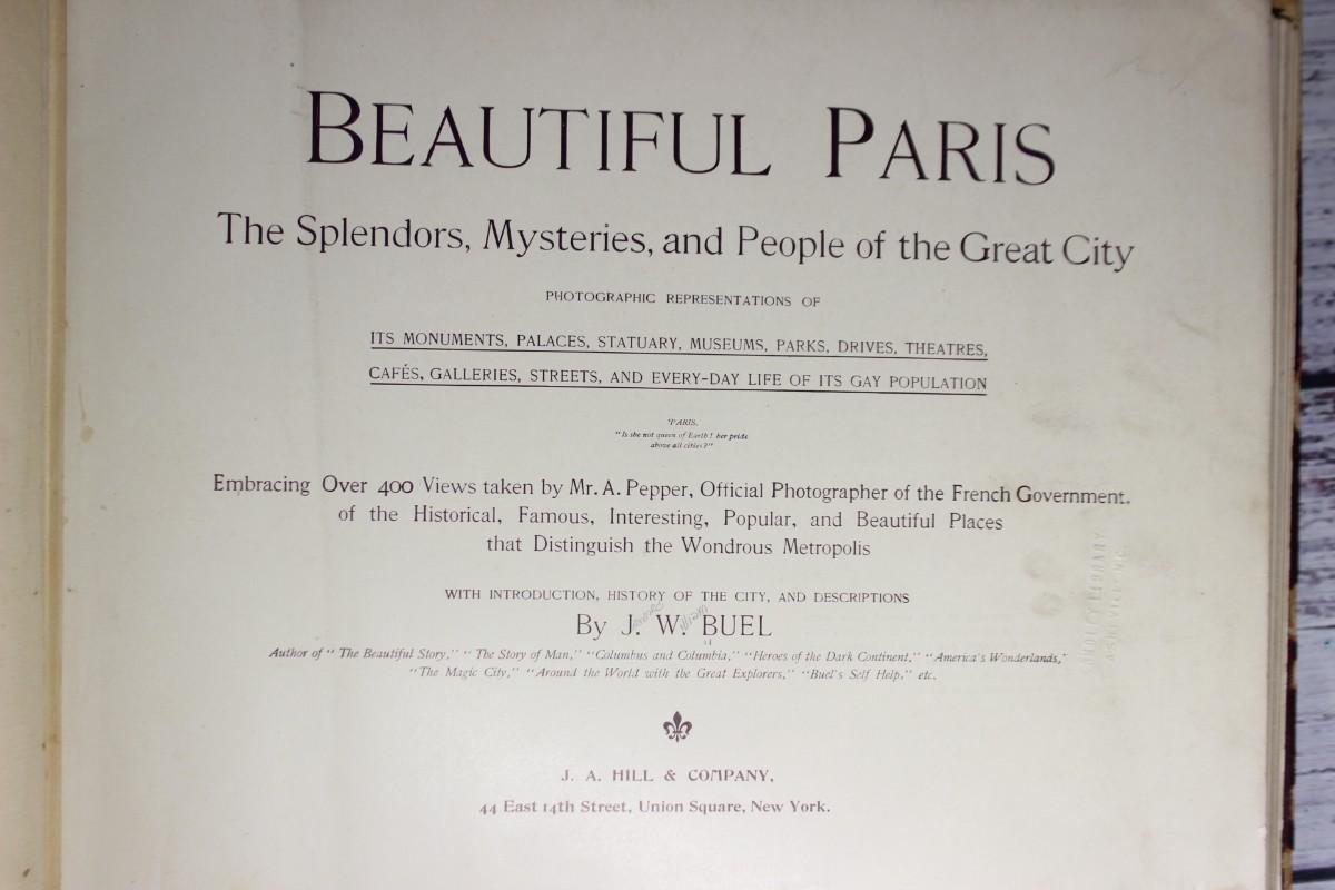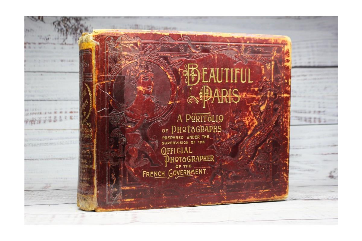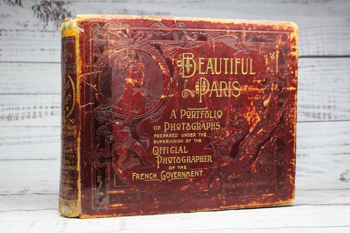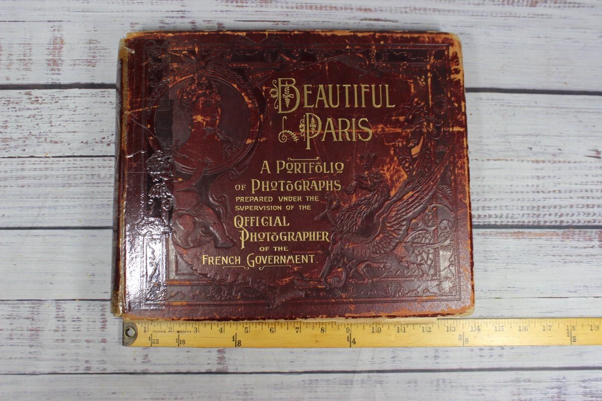 Antique Book Beautiful Paris A Portfolio of Photographs Prepared Under the Supervision of the Official Photographer of the French Government, there is some wear and tearing to the front cover and has been taped and repaired mainly on the spine of the book. There are no rips or tears to the pages inside the book and is in fair condition for its age. Check pictures for more details and for sizing.
