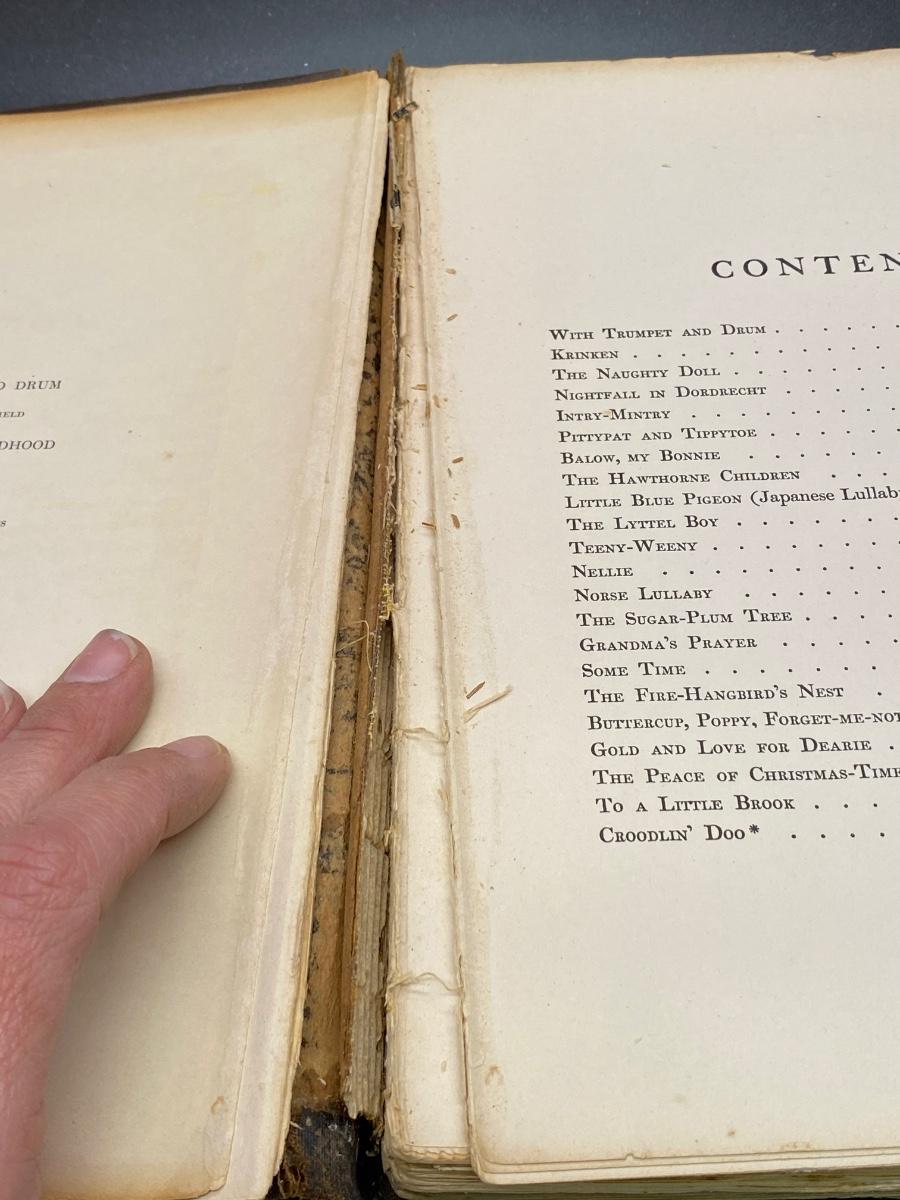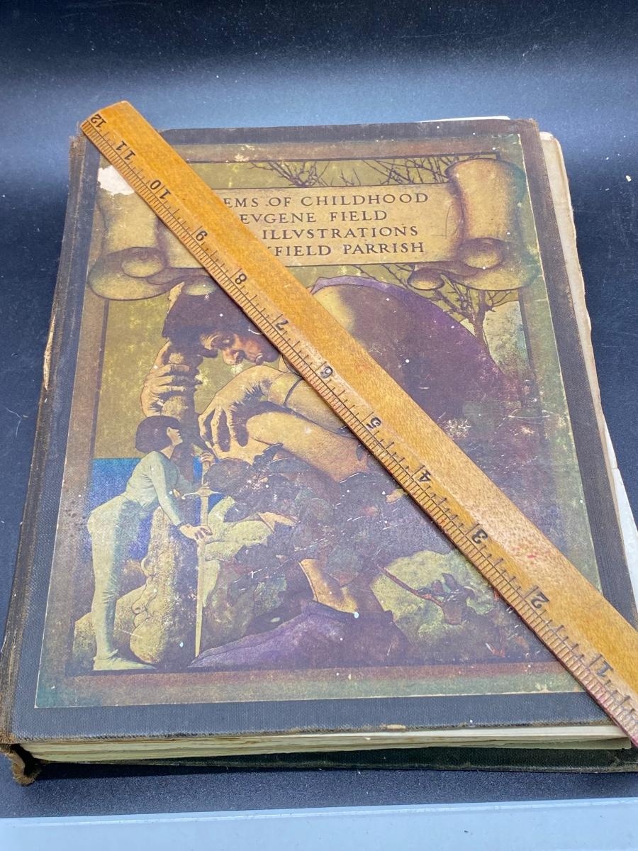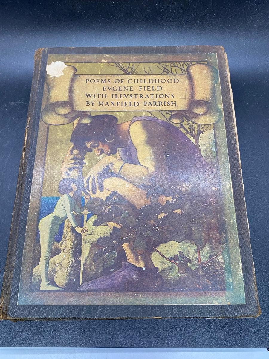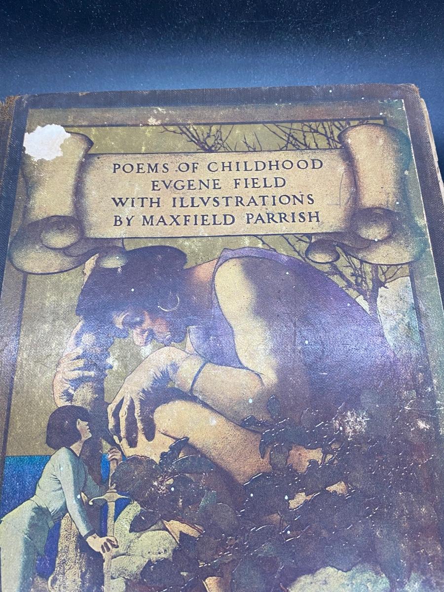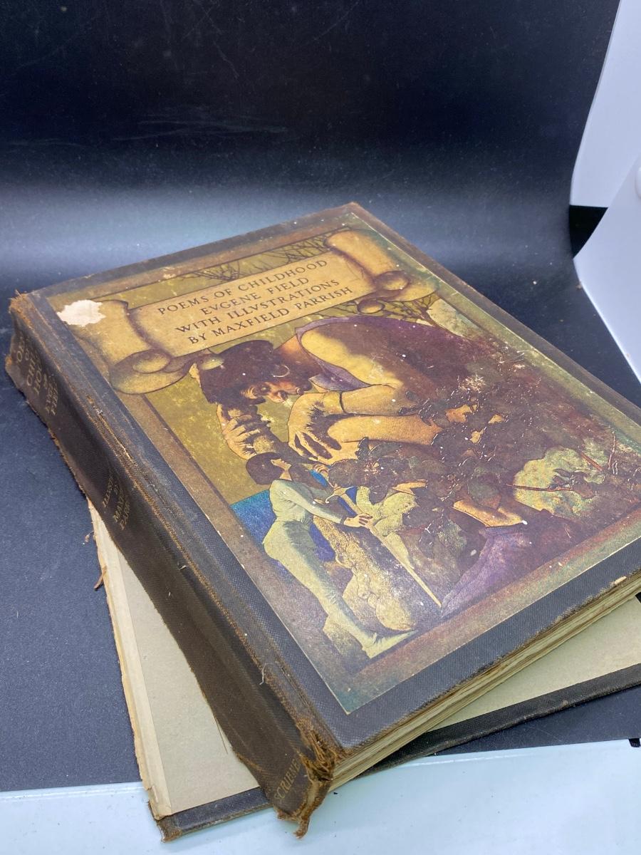 Antique Poems of Childhood Eugene Field with Illustrations by Maxfield Parrish, the hard cover is torn from the spine as well as some natural wear. There is no other significant damage to the pages and is in an overall fair condition for its age, check pictures for more details and for sizing.