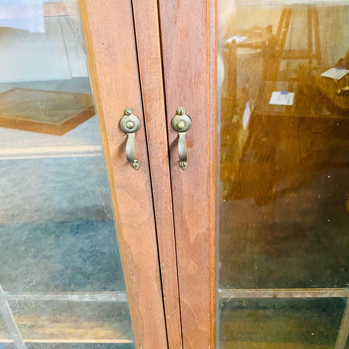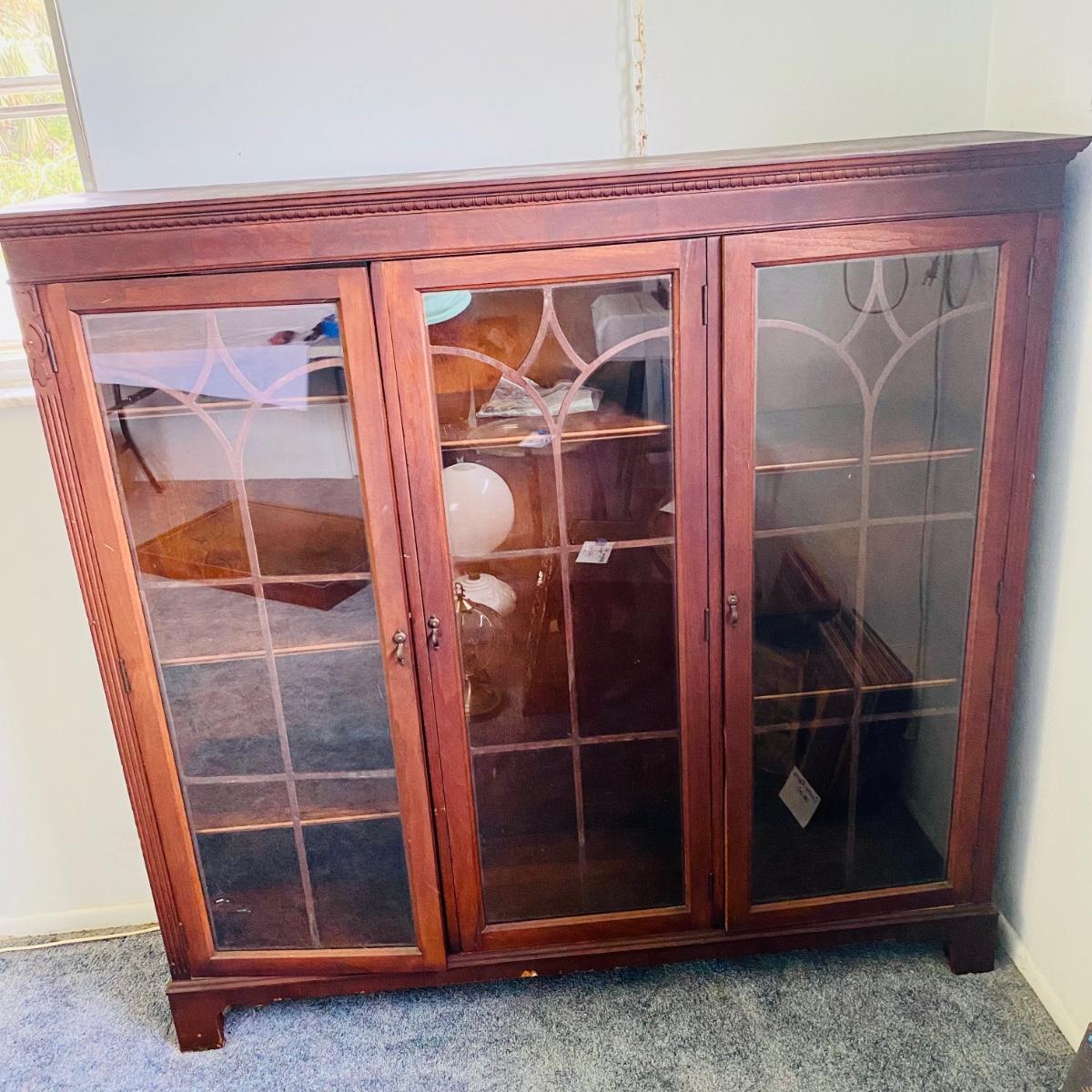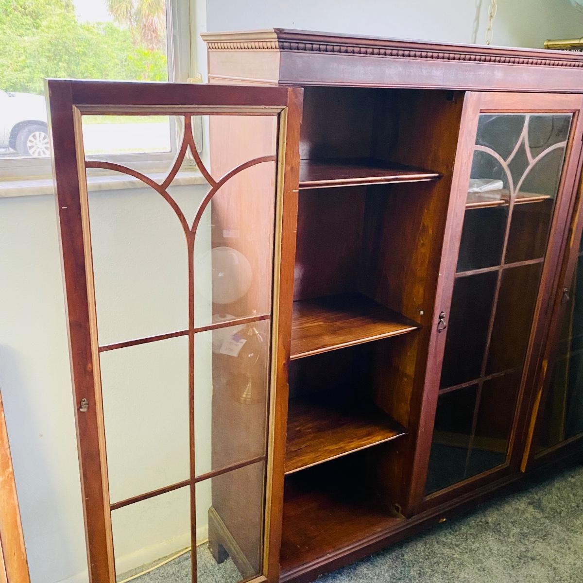 Beautiful piece. Wood bookcase/cabinet with adjustable shelves and three glass front doors. Measures 55”L x 13”W x 54”H. Has sctratches on top and on shelves inside.