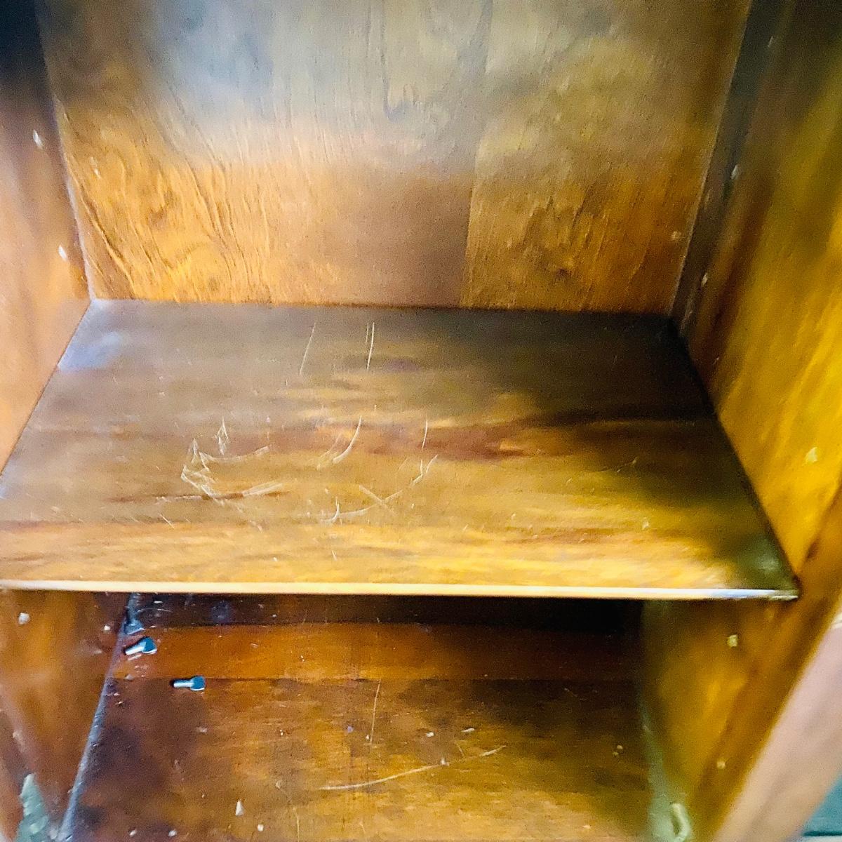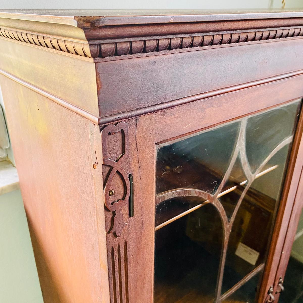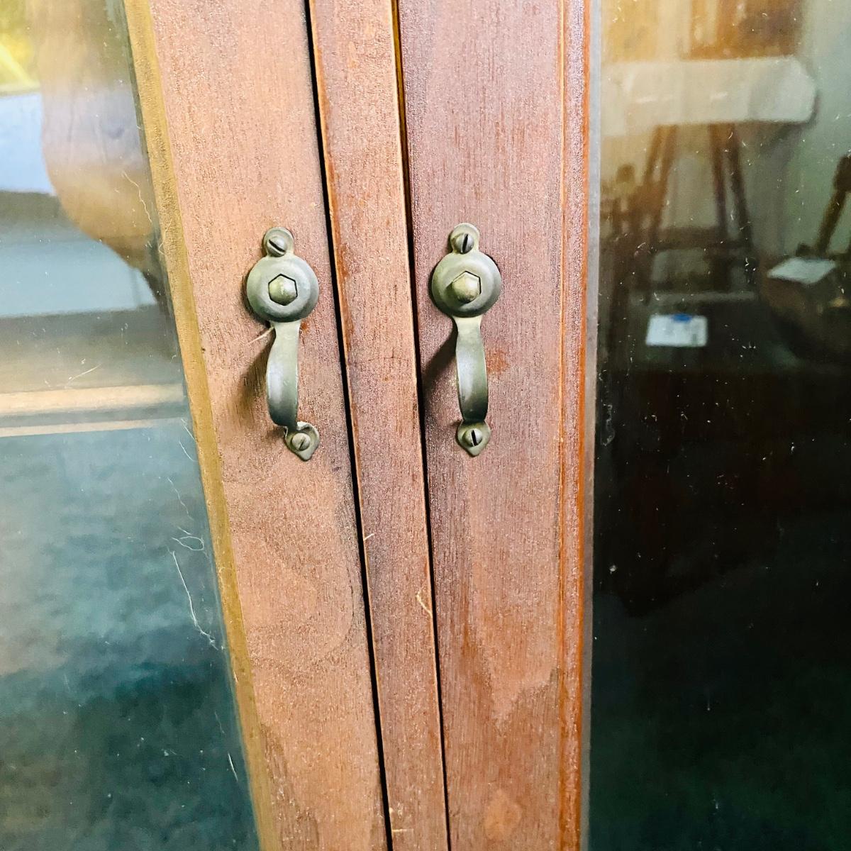 Beautiful piece. Wood bookcase/cabinet with adjustable shelves and three glass front doors. Measures 55”L x 13”W x 54”H. Has sctratches on top and on shelves inside.