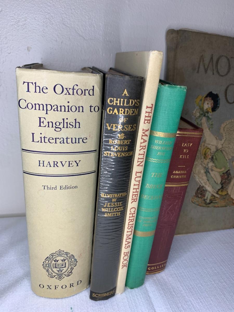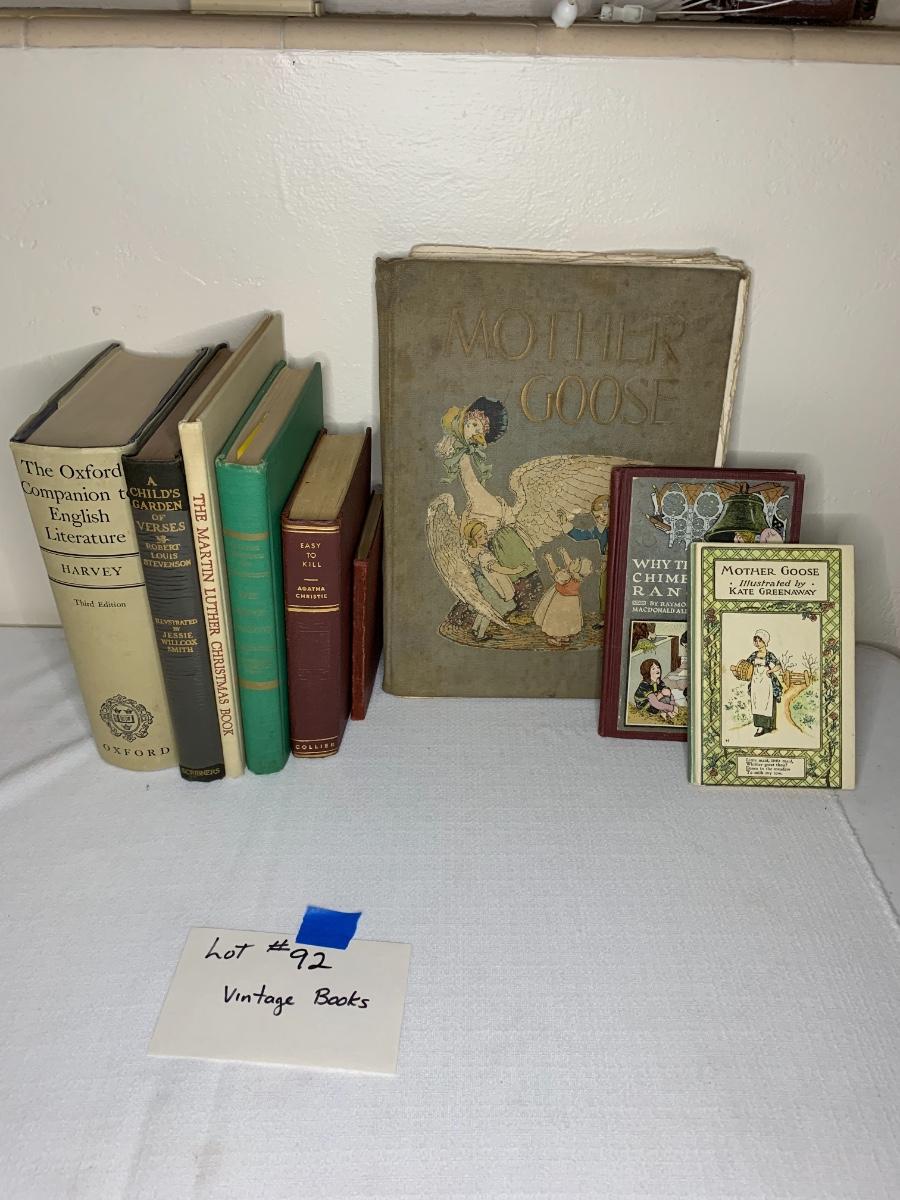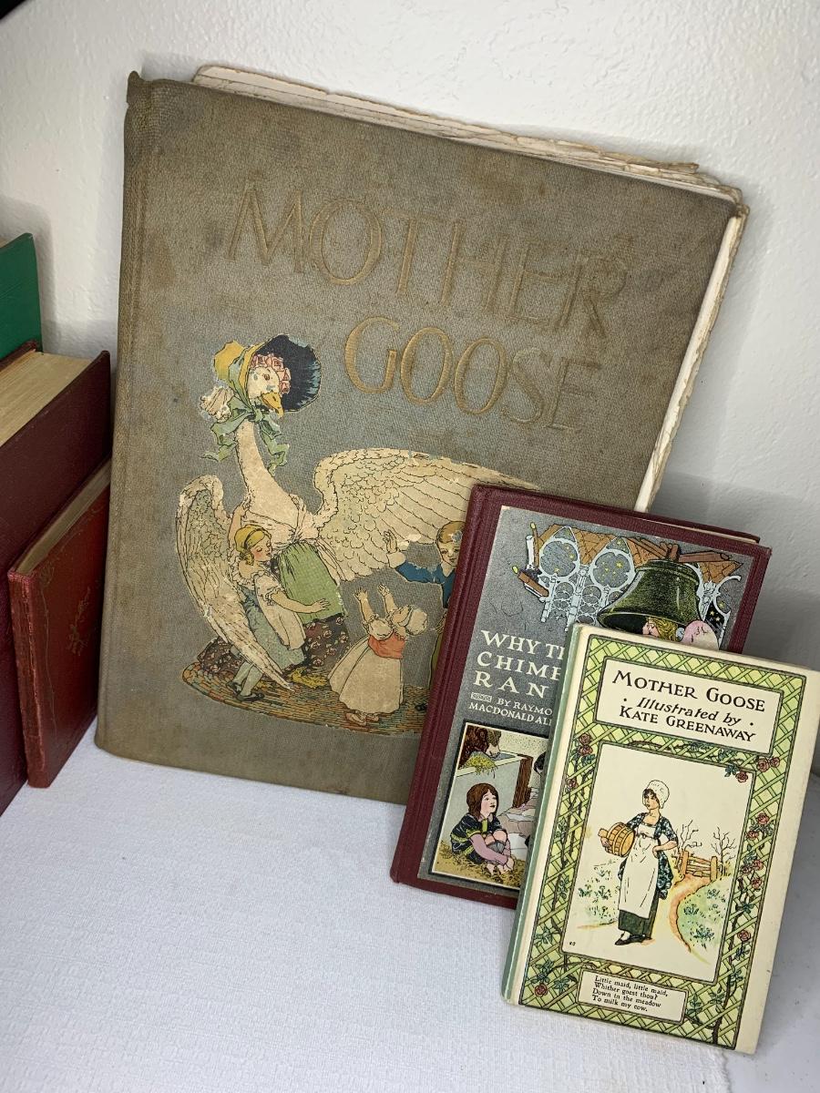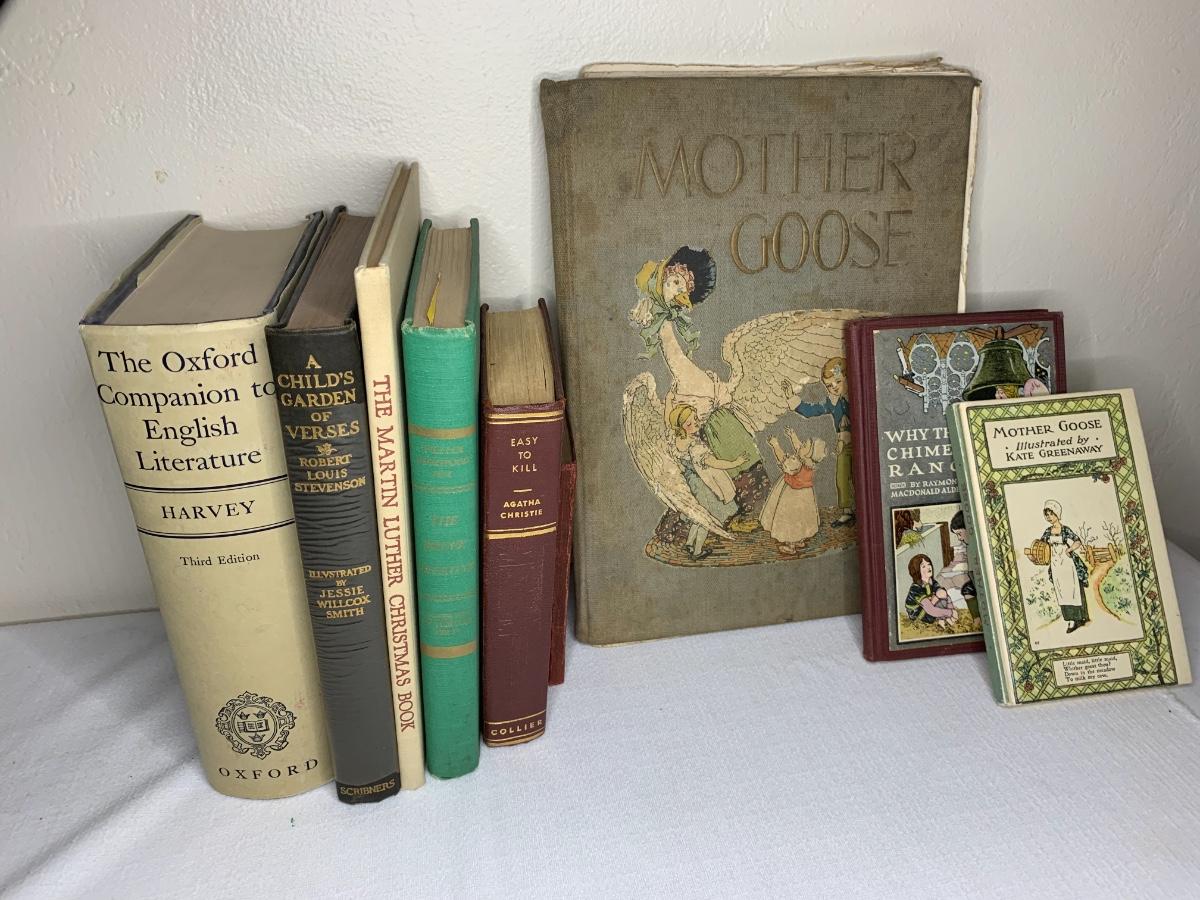 Lot of antique and vintage books including Mother Goose, Martin Luther Christmas Book, Oxford Dictionary, Children’s versus and others