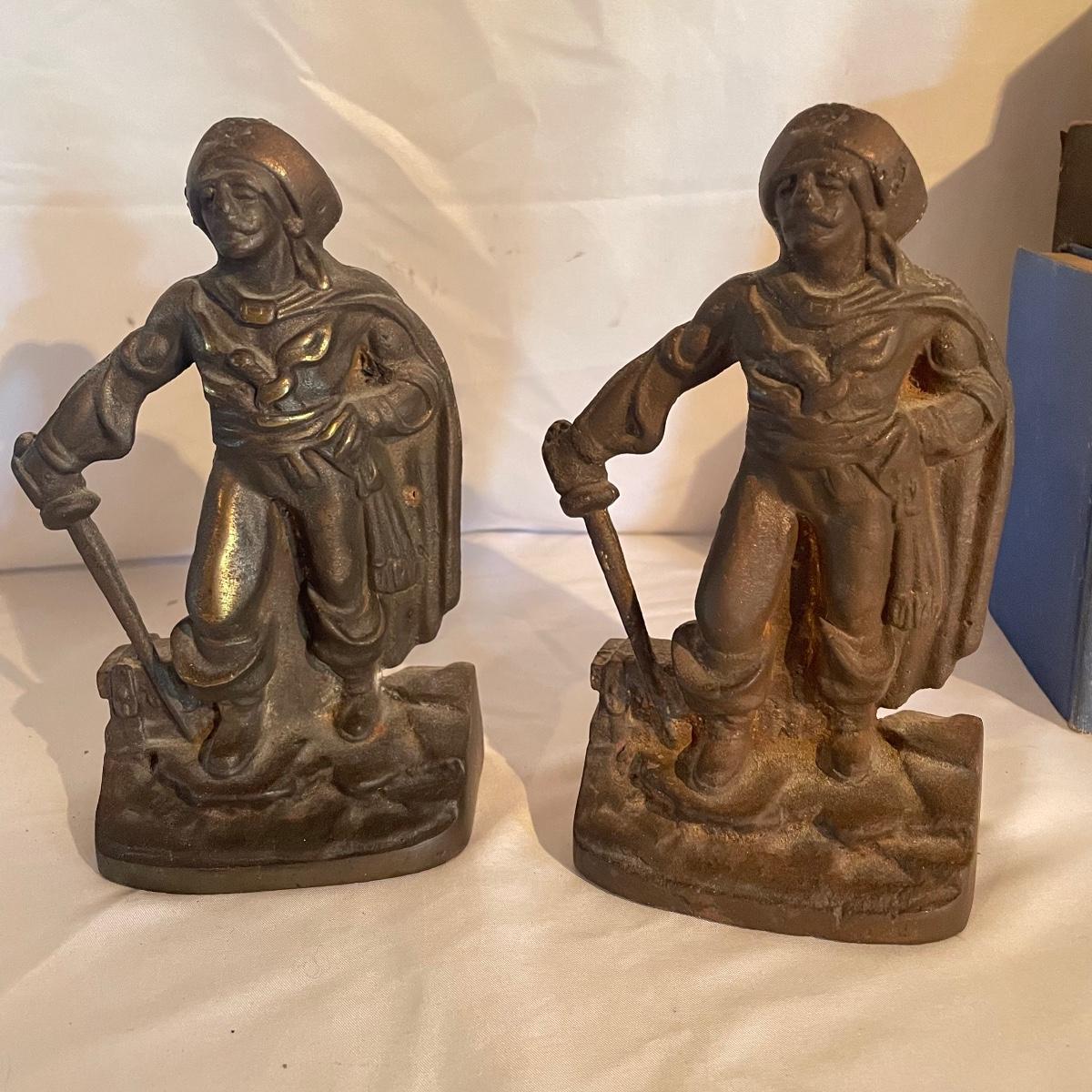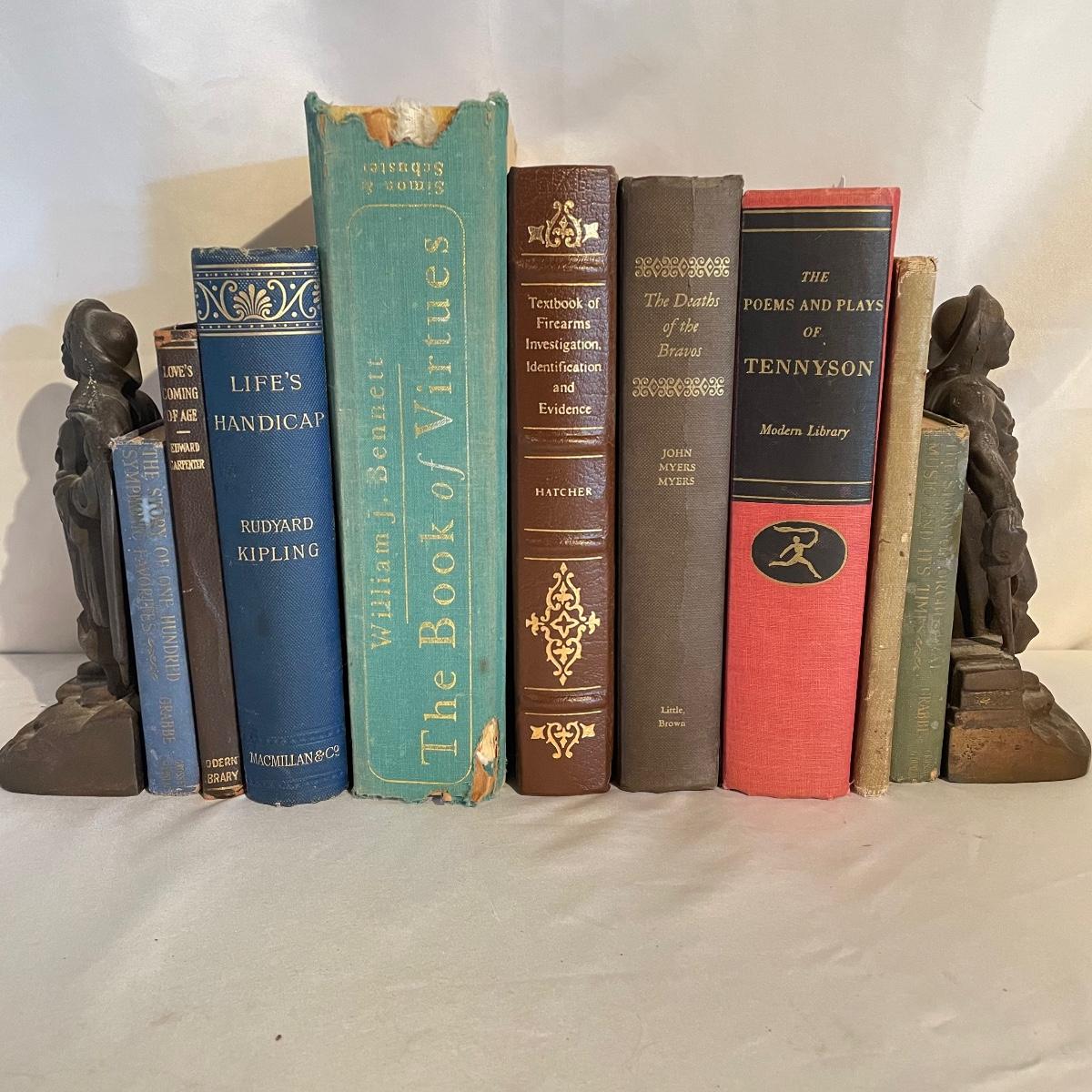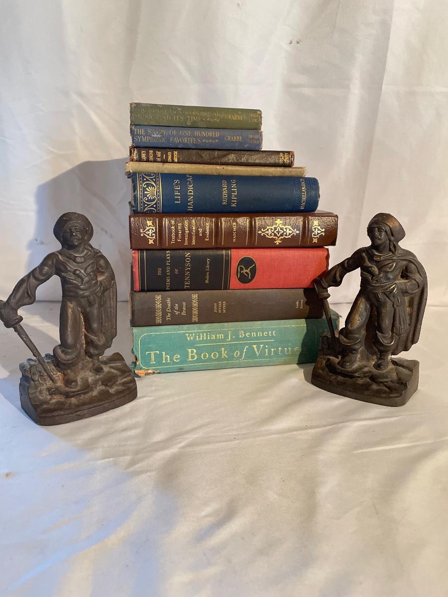 A great assortment of antique books in this lot, see images for titles and note that some books have some wear and tear that is highlighted in images. We have included a small pillow that measures 4” square and a pair of heavy cast metal swashbuckler bookends, they measure 4” x 2.5” x 7”.