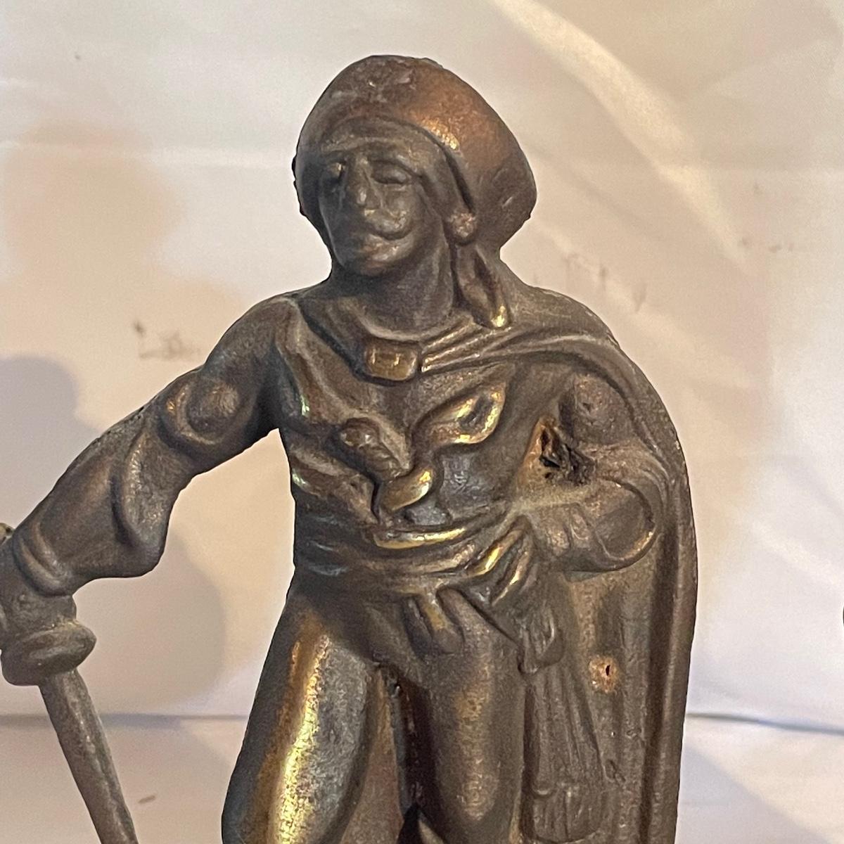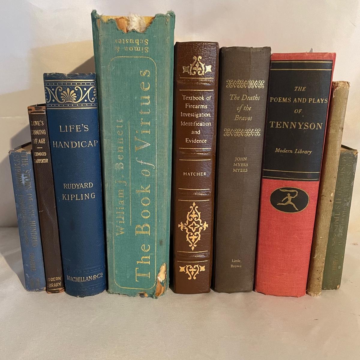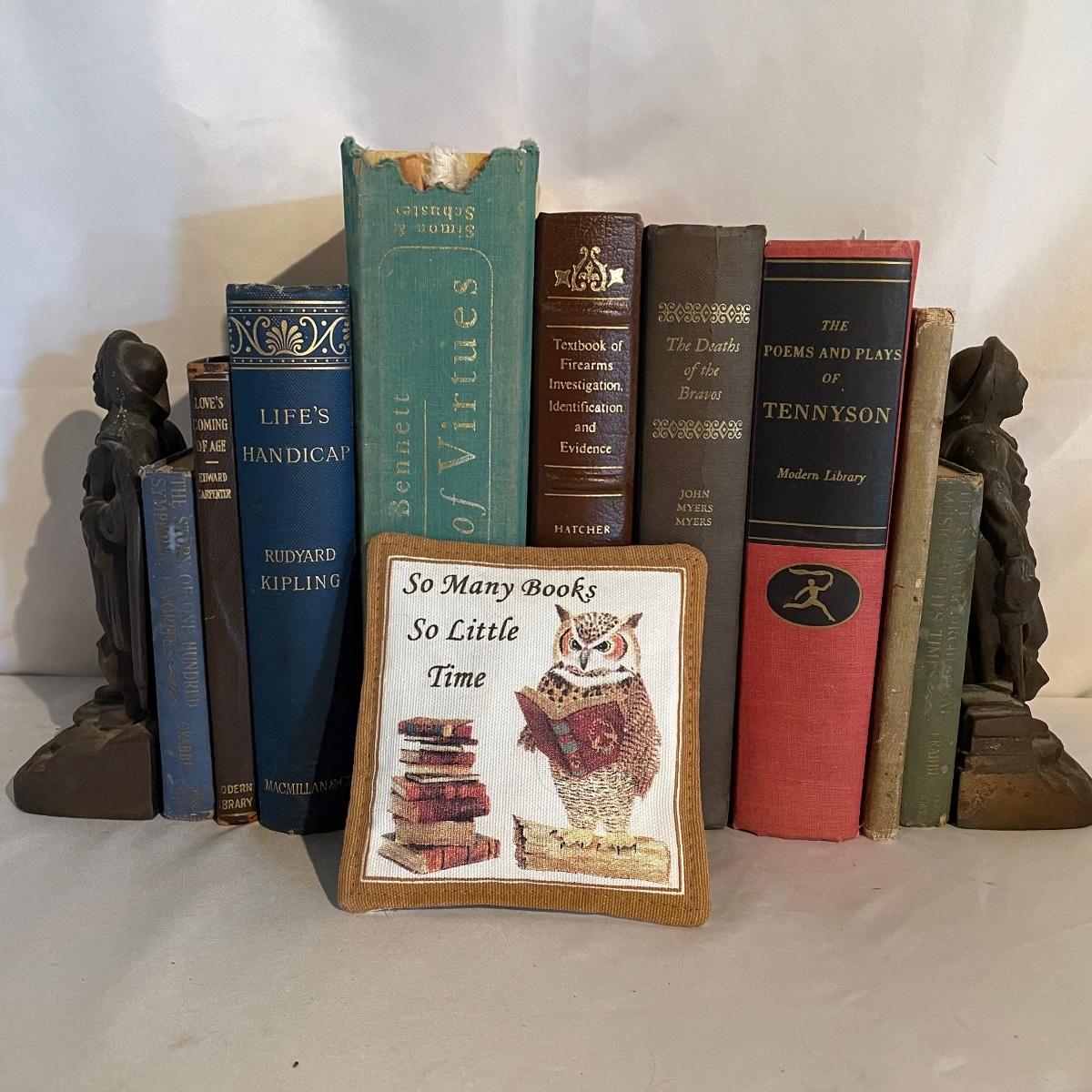 A great assortment of antique books in this lot, see images for titles and note that some books have some wear and tear that is highlighted in images. We have included a small pillow that measures 4” square and a pair of heavy cast metal swashbuckler bookends, they measure 4” x 2.5” x 7”.