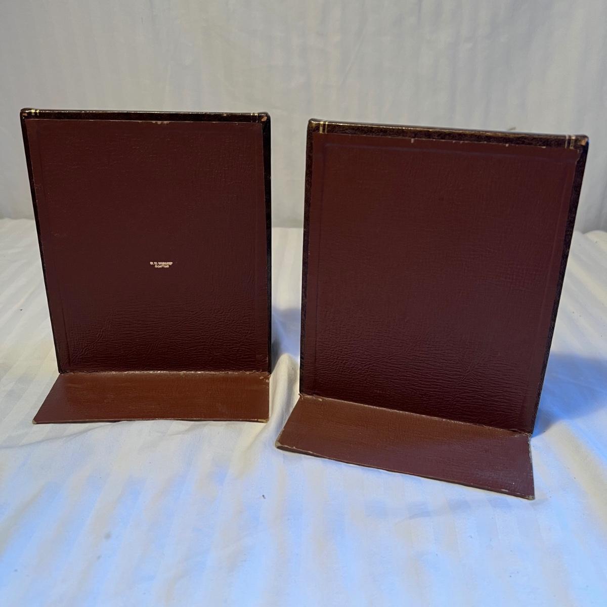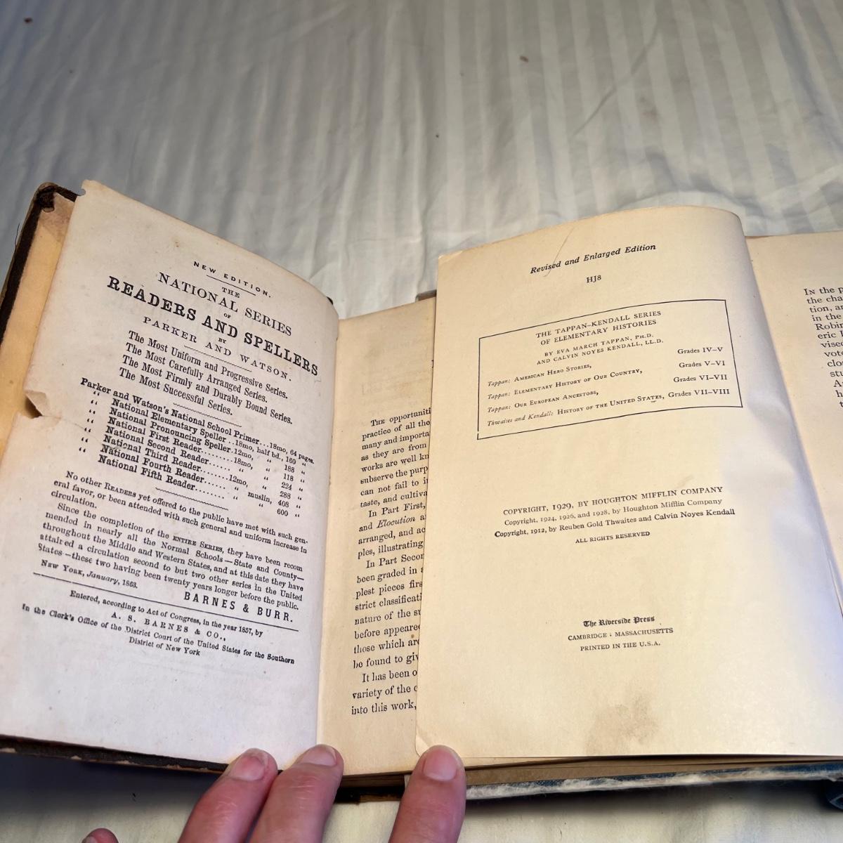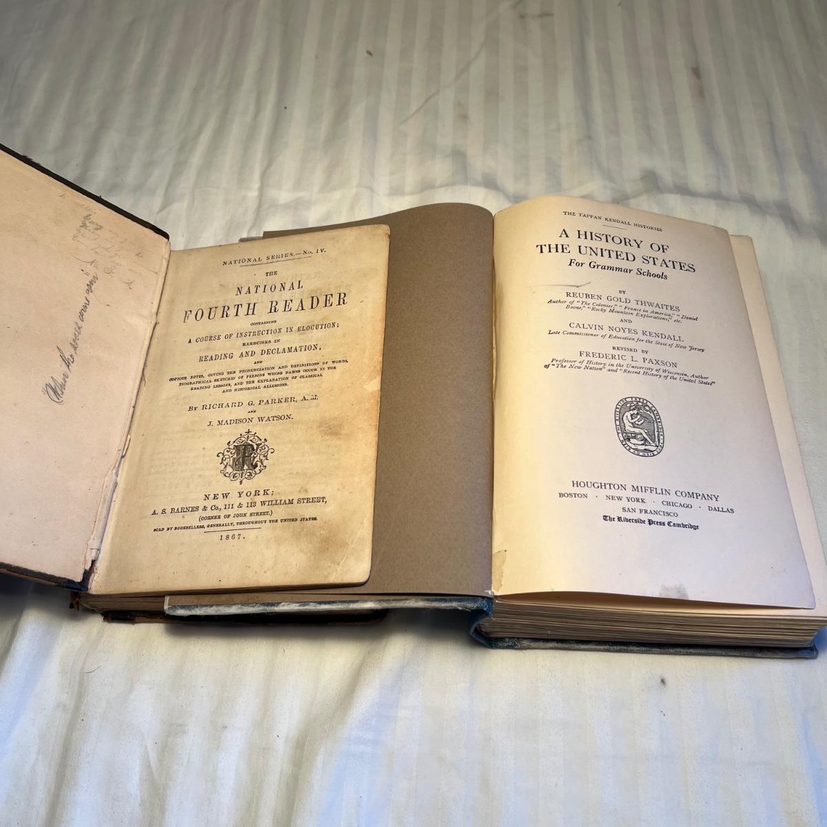 An assortment of mostly antique books and a pair of leather like bookends; bookends have a label that’s hard to read. The youngest of the four books is the ‘A History of the United States’ . The books have some age related issues shown in images.