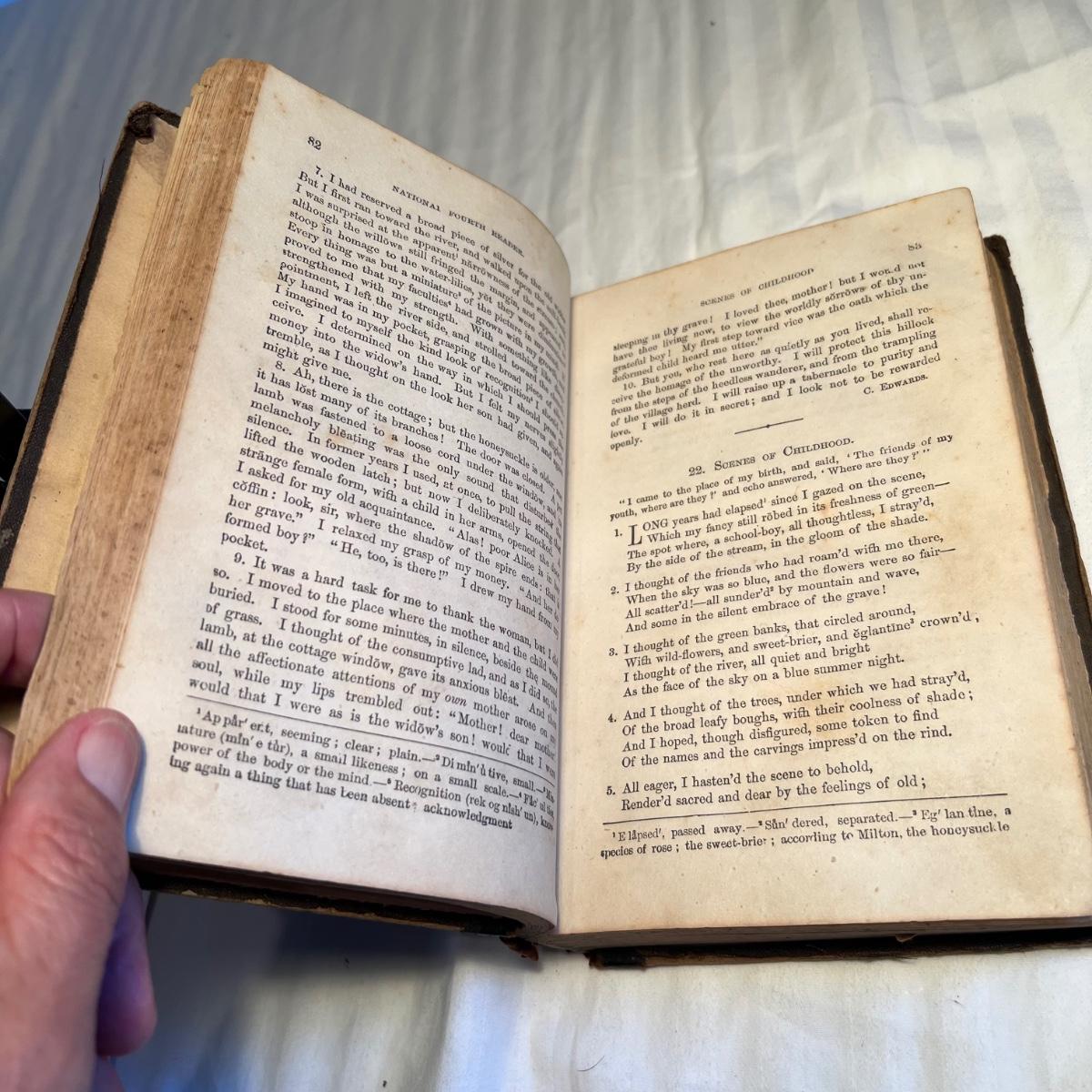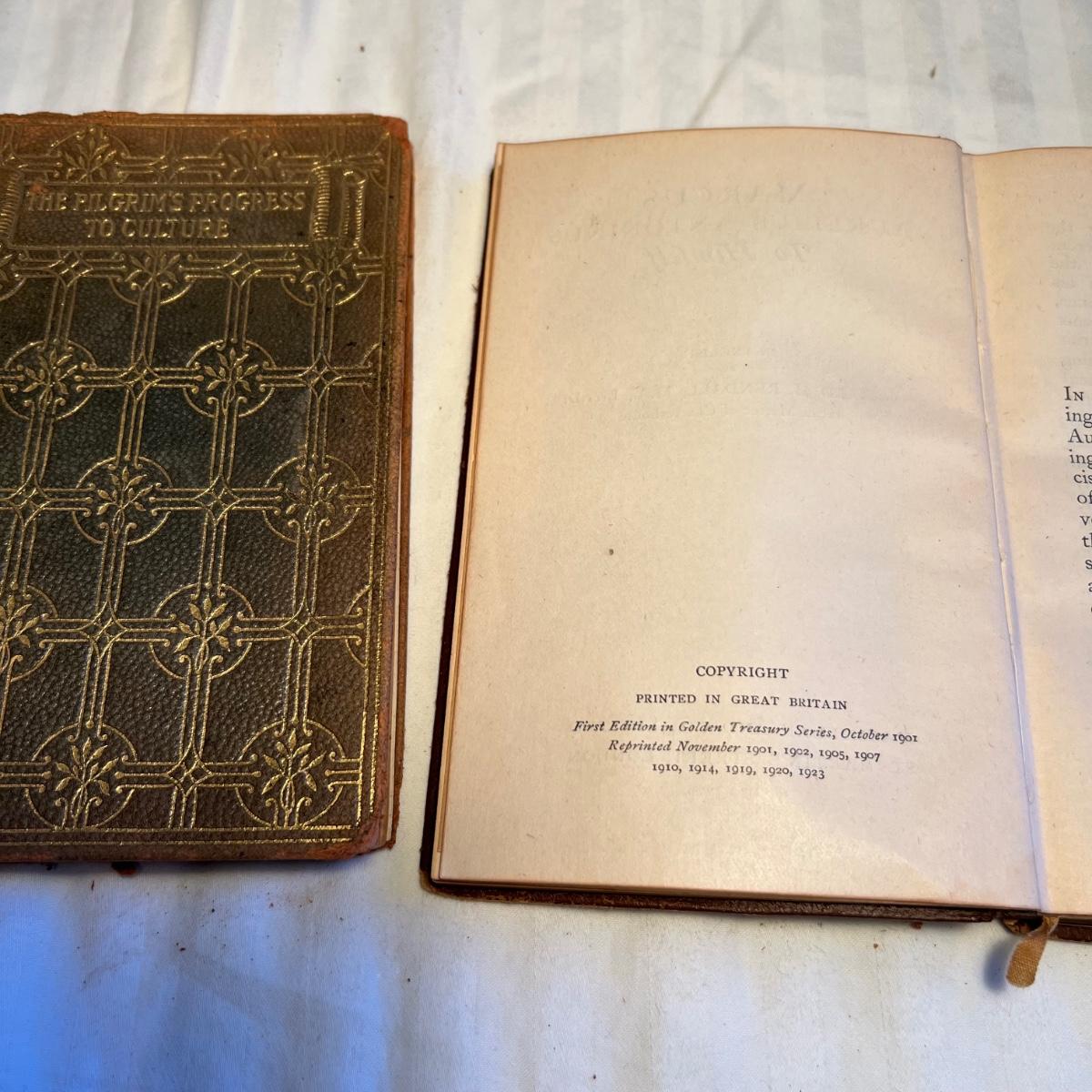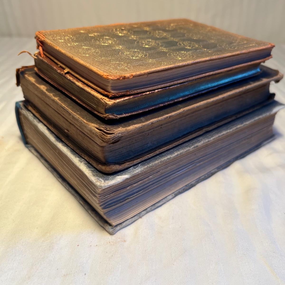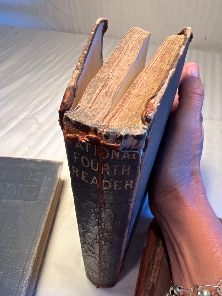 An assortment of mostly antique books and a pair of leather like bookends; bookends have a label that’s hard to read. The youngest of the four books is the ‘A History of the United States’ . The books have some age related issues shown in images.