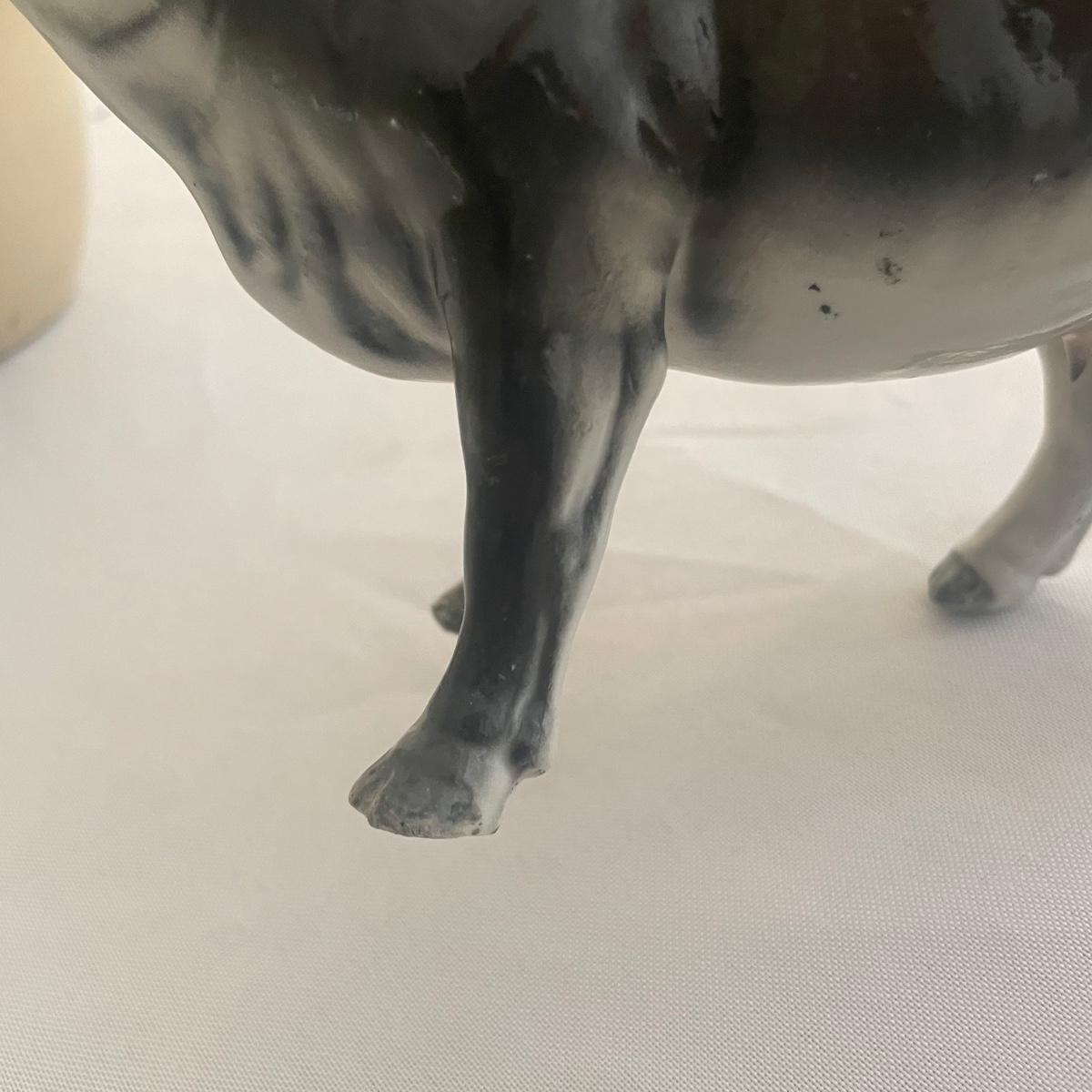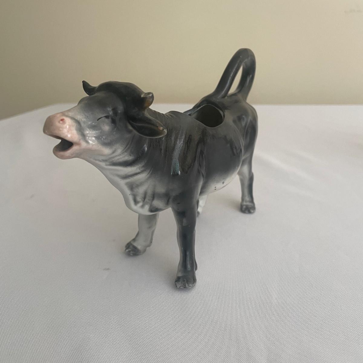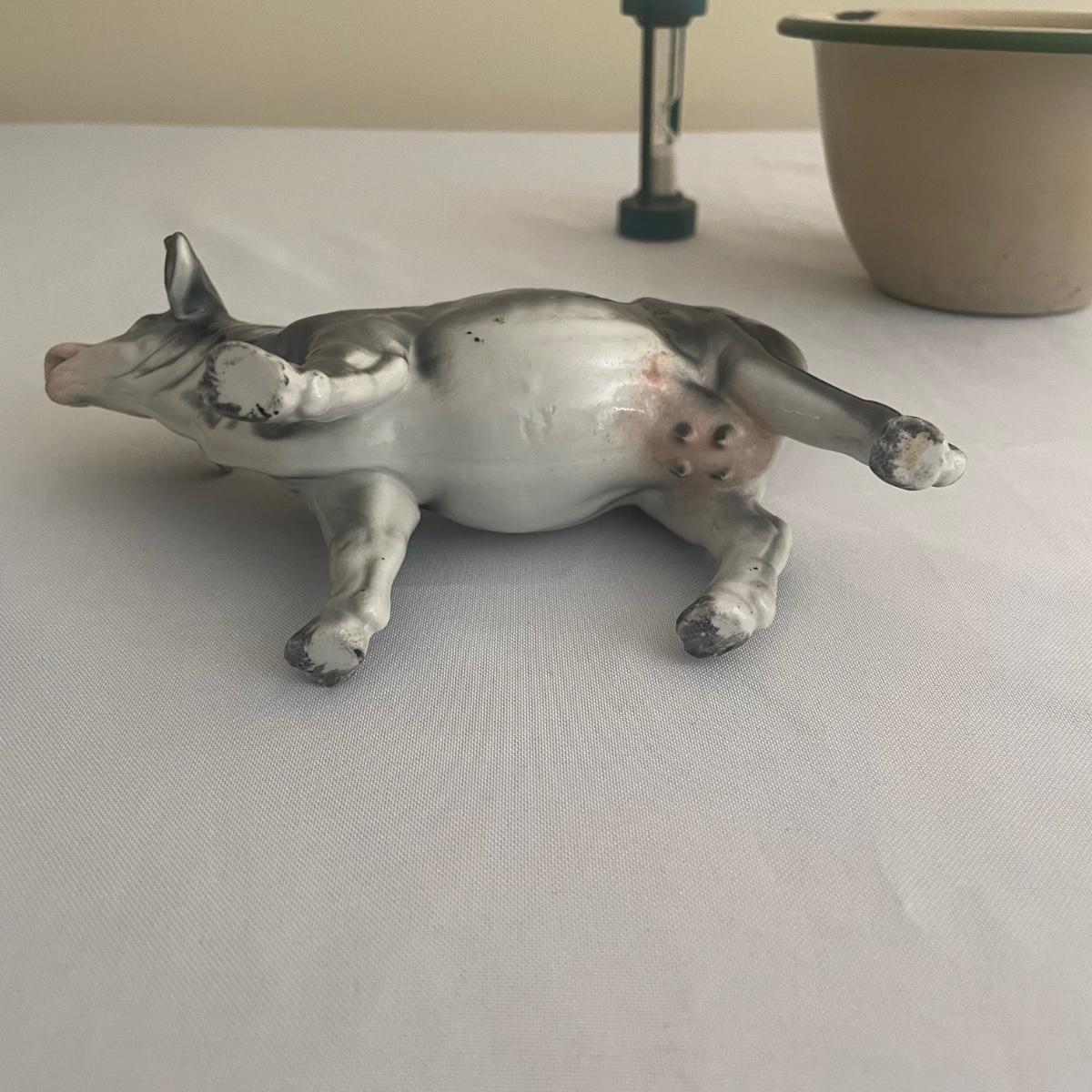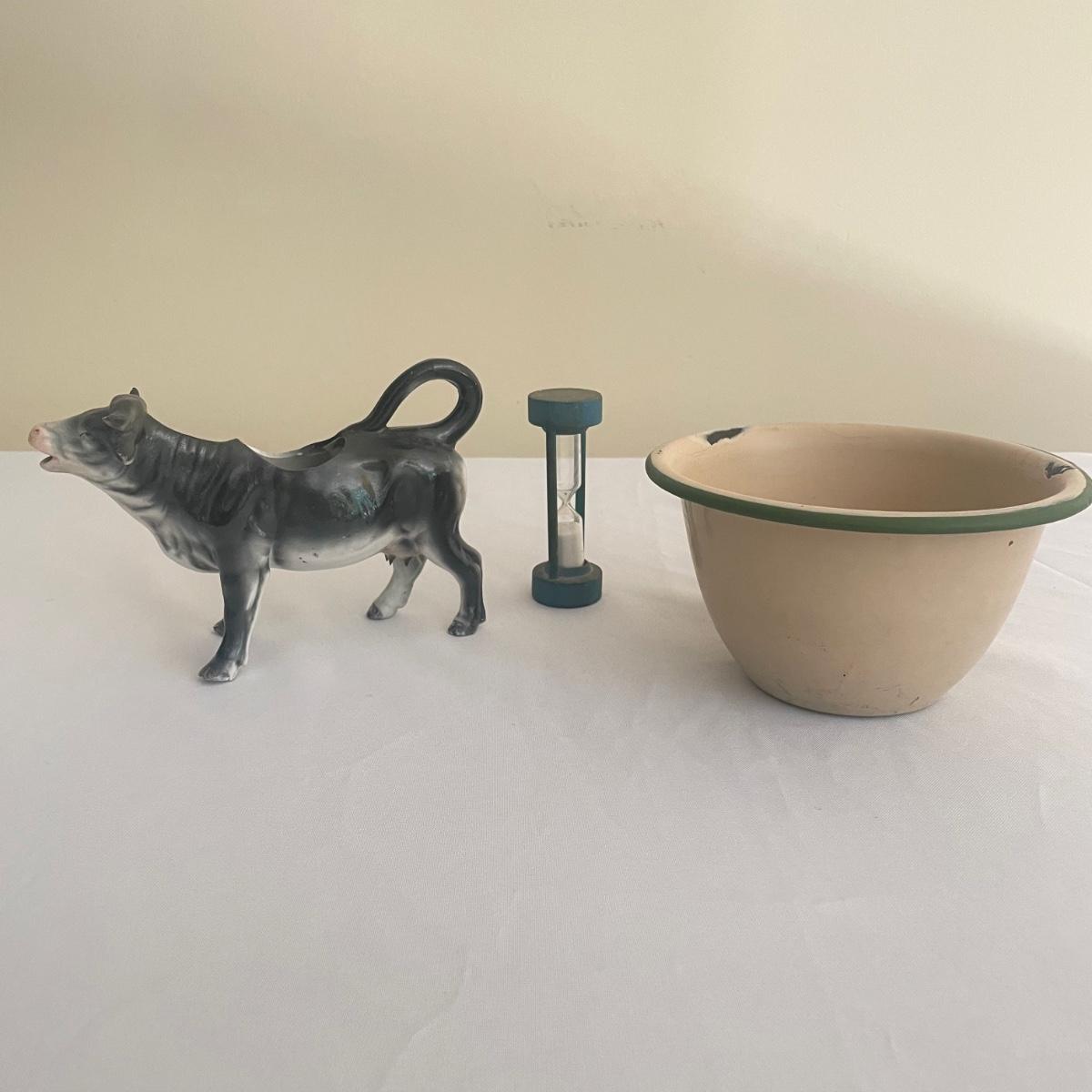 This porcelain cow creamer does not have any markings and measures 7” x 2.5” x 4.5”. Also includes is a metal enamel bowl (has a couple of blemishes) and a wood and glass sand timer that has the name R.C Reign stamped on the top.