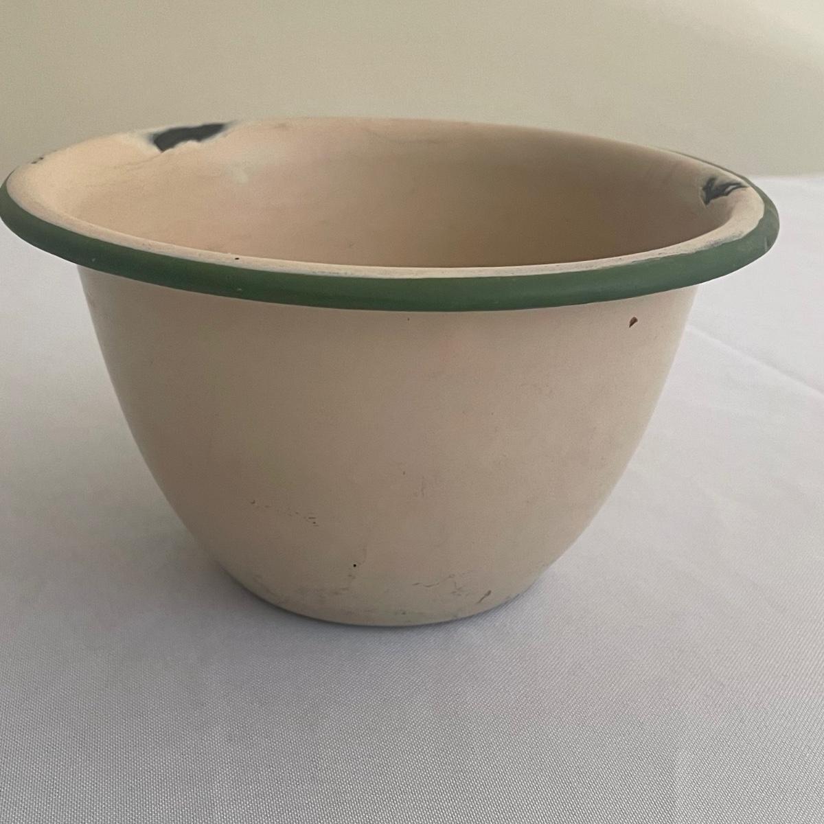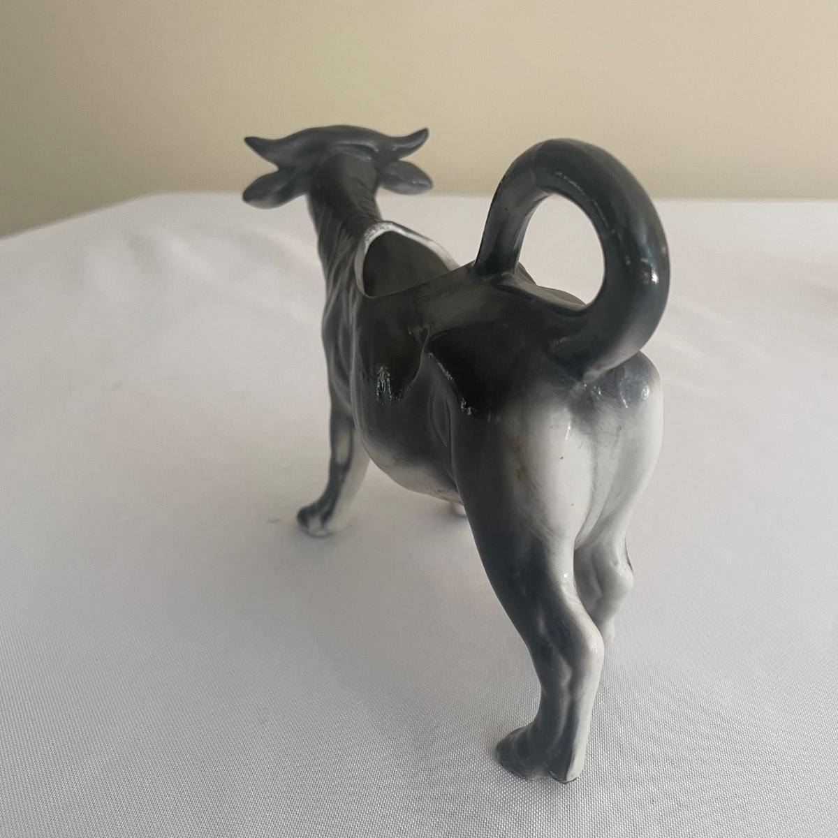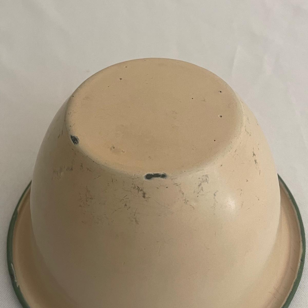 This porcelain cow creamer does not have any markings and measures 7” x 2.5” x 4.5”. Also includes is a metal enamel bowl (has a couple of blemishes) and a wood and glass sand timer that has the name R.C Reign stamped on the top.