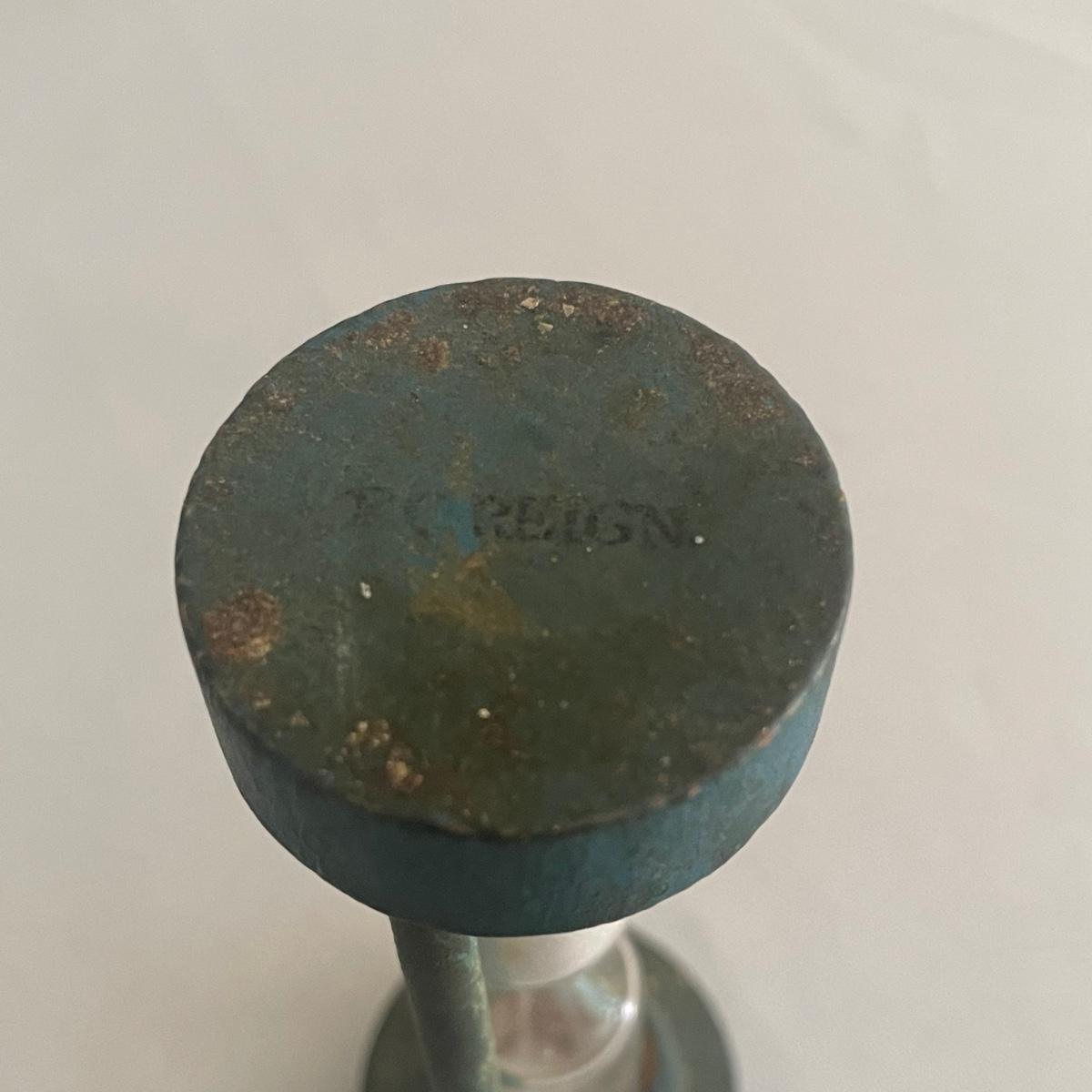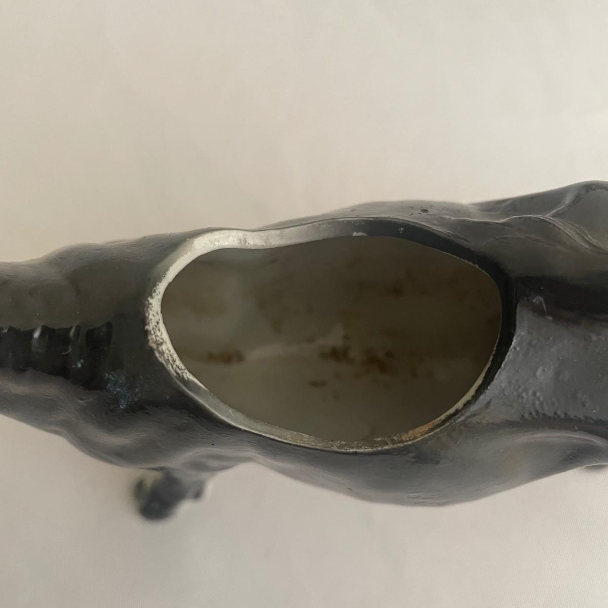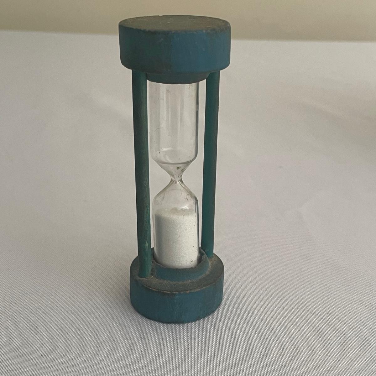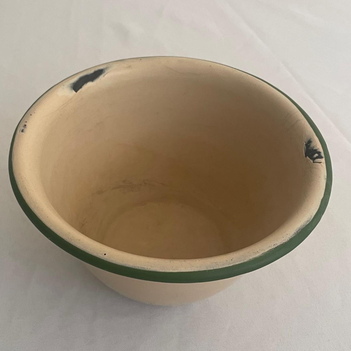 This porcelain cow creamer does not have any markings and measures 7” x 2.5” x 4.5”. Also includes is a metal enamel bowl (has a couple of blemishes) and a wood and glass sand timer that has the name R.C Reign stamped on the top.