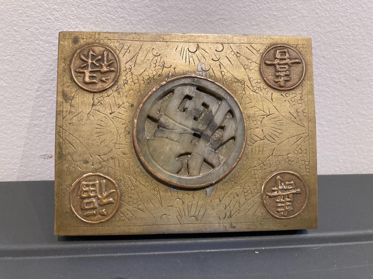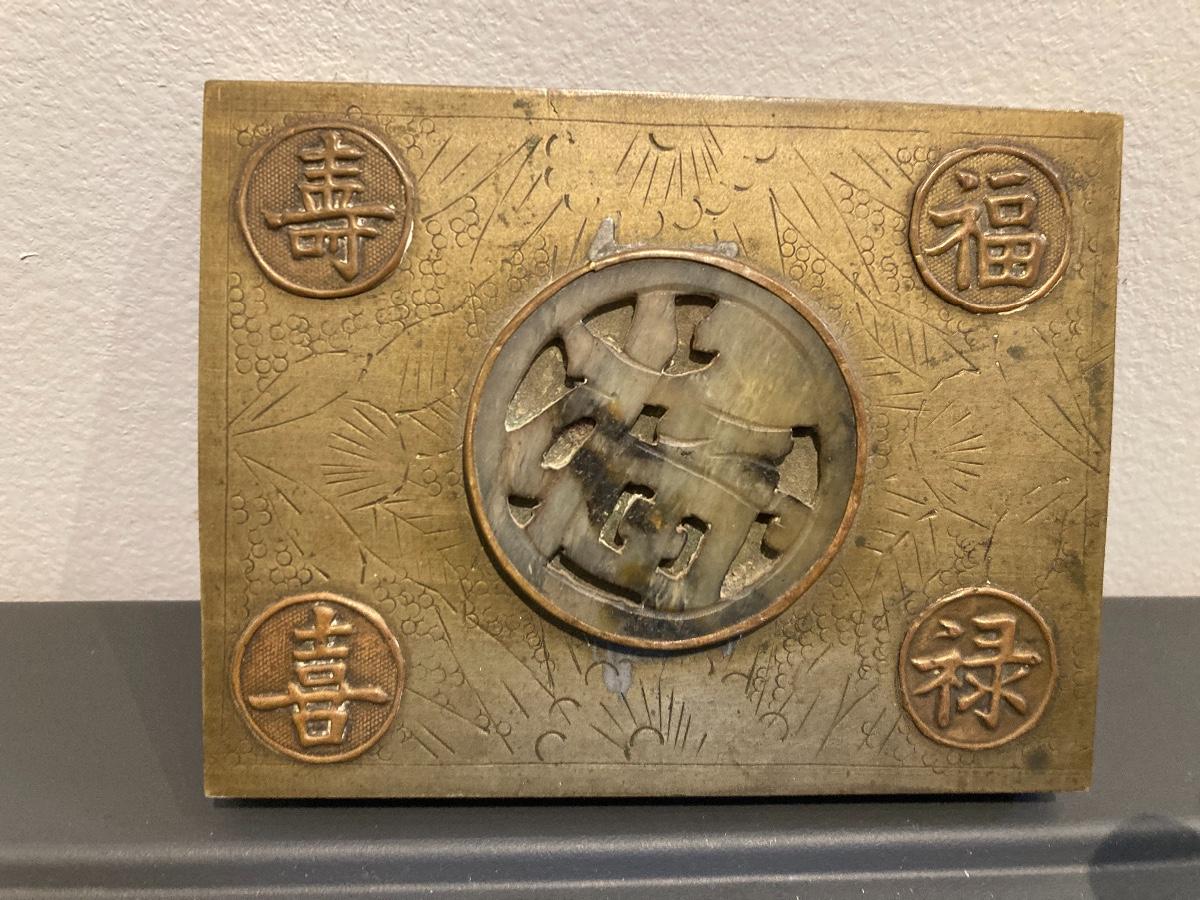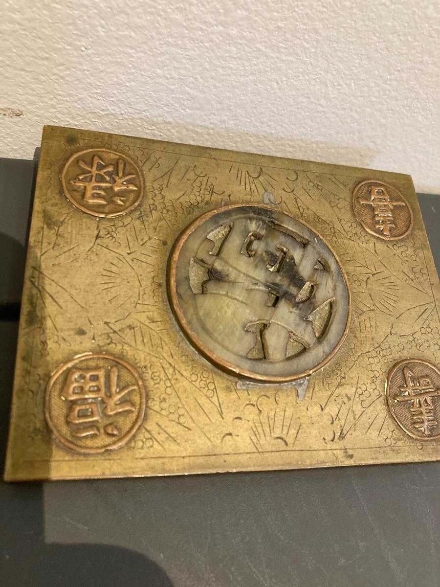 Antique Brass and Jade Plaque with Rare “Spinach” Color Large 1 3/4” Medalion