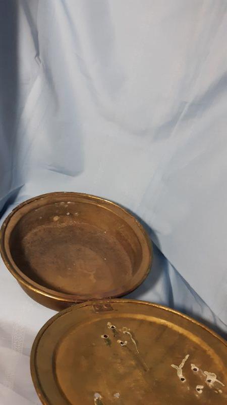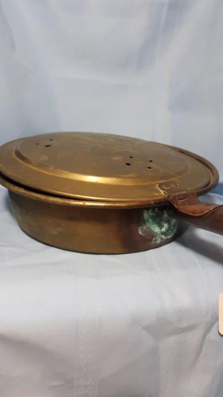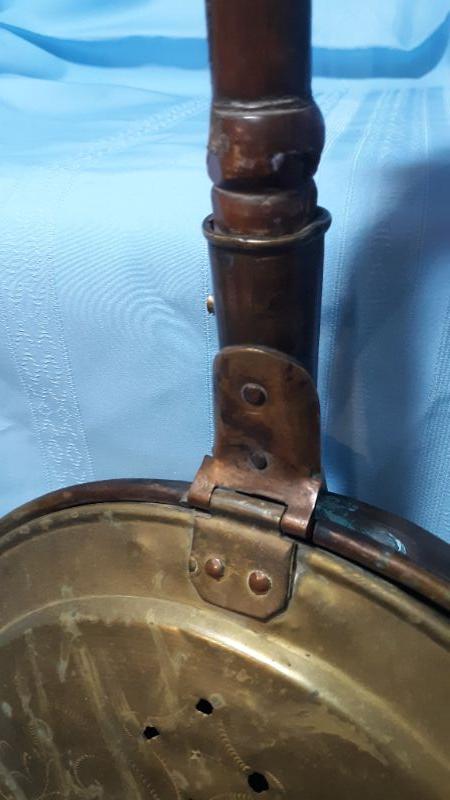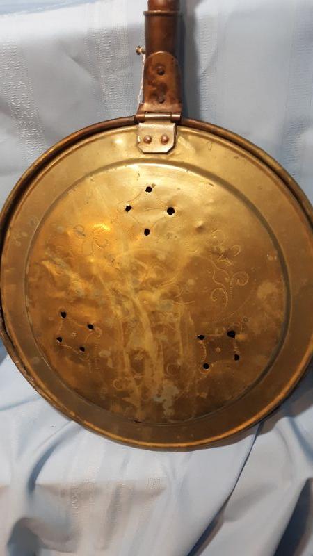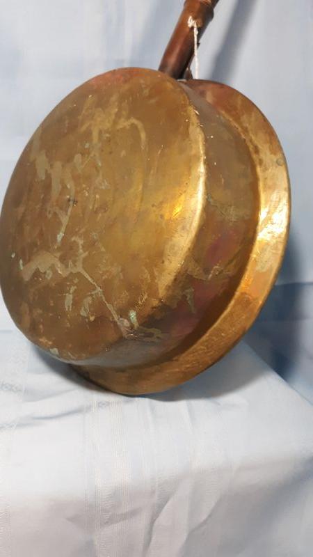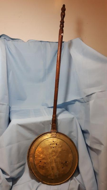 Antique brass bed warmer with wood handle, pan is 13" wide, handle 33" long