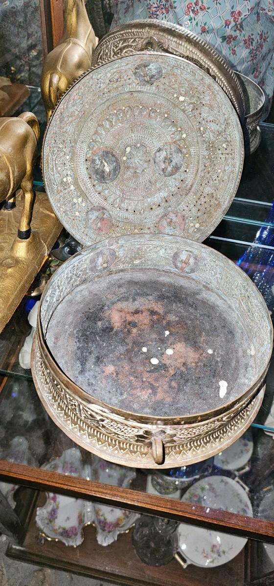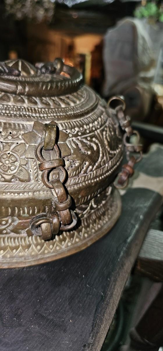 Antique Brass Betel Nut Pandan Censer Box with lid, handle, chain hinge India or Middle Eastern/ Persian