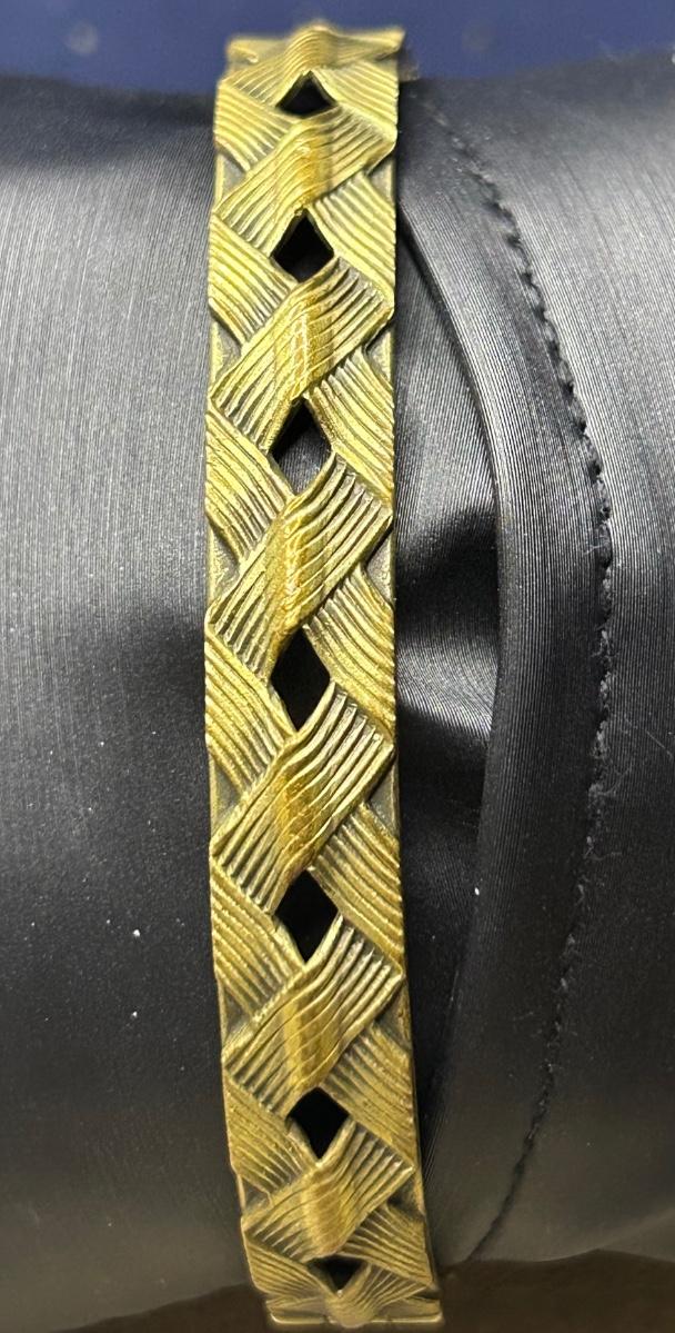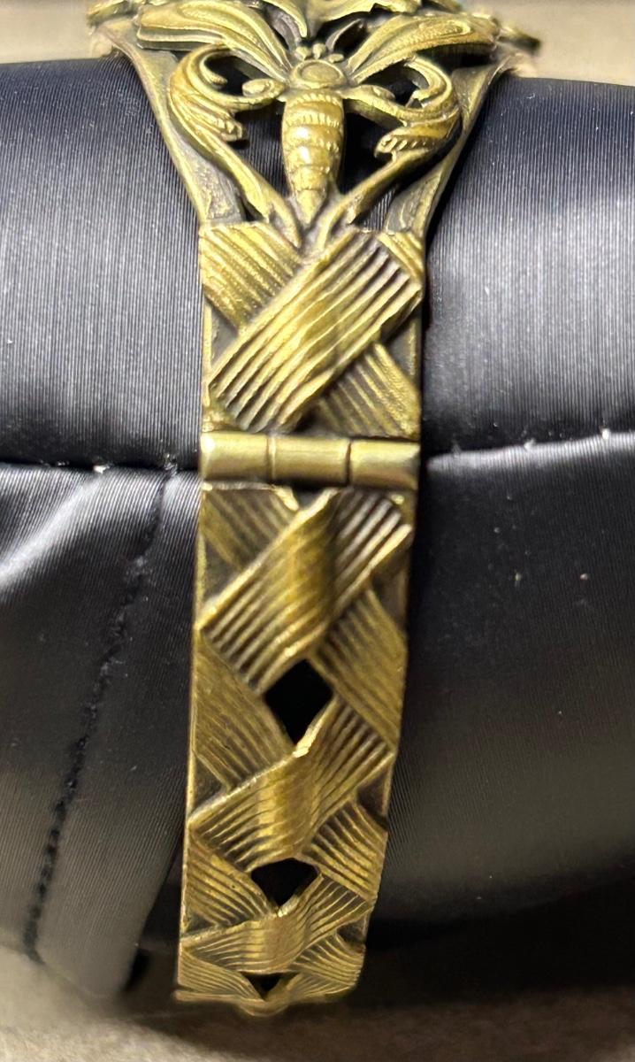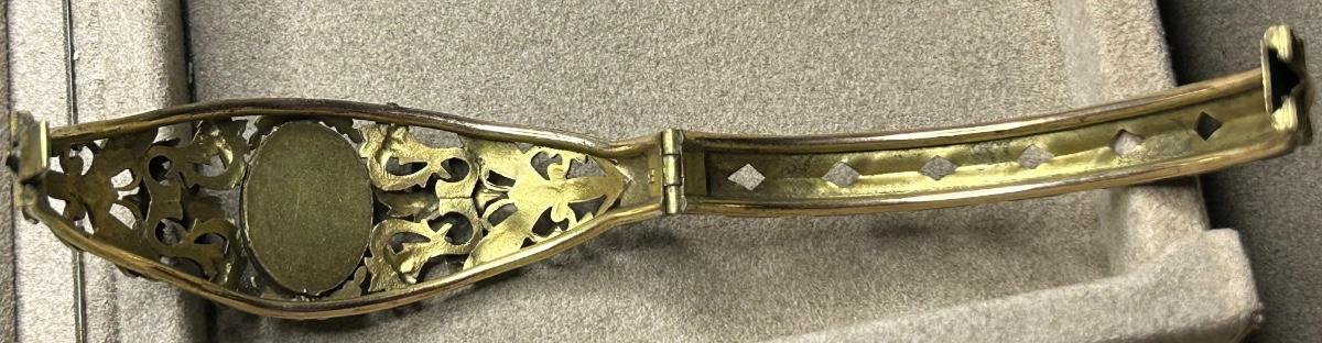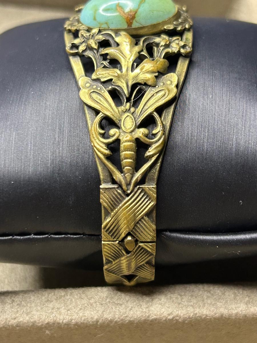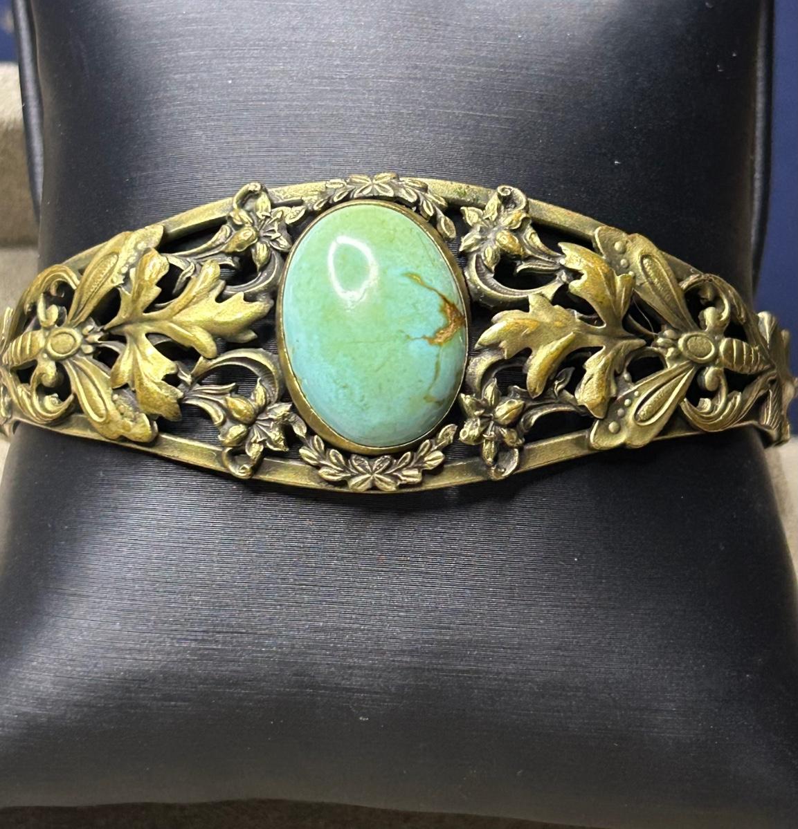 I believe it is a turquoise in the center, unsigned, 1910, push button closure & amazing detail on this bangle!