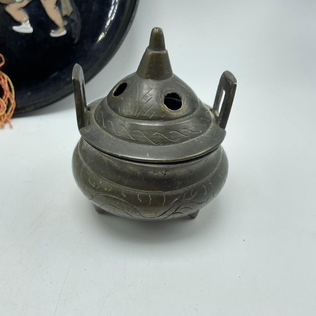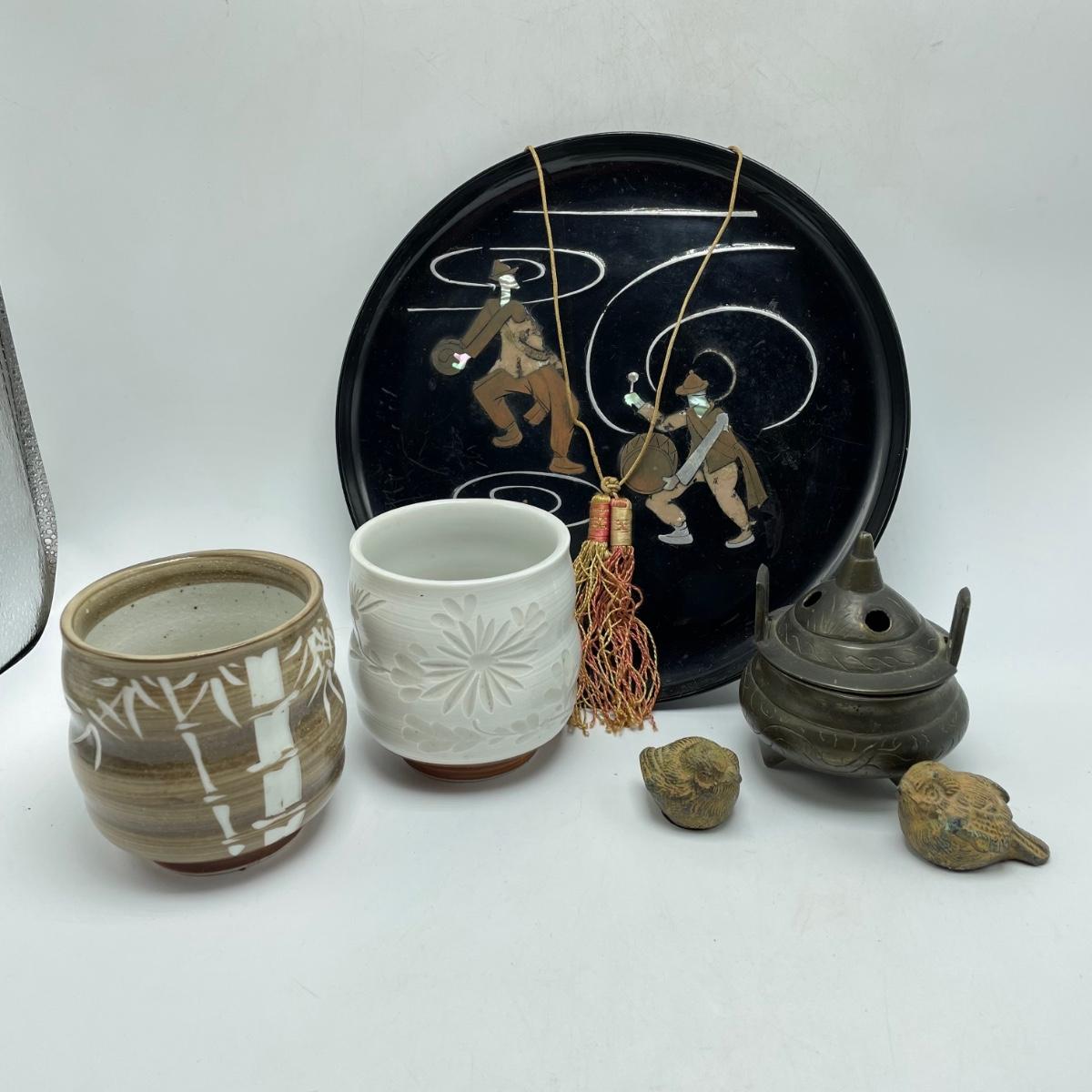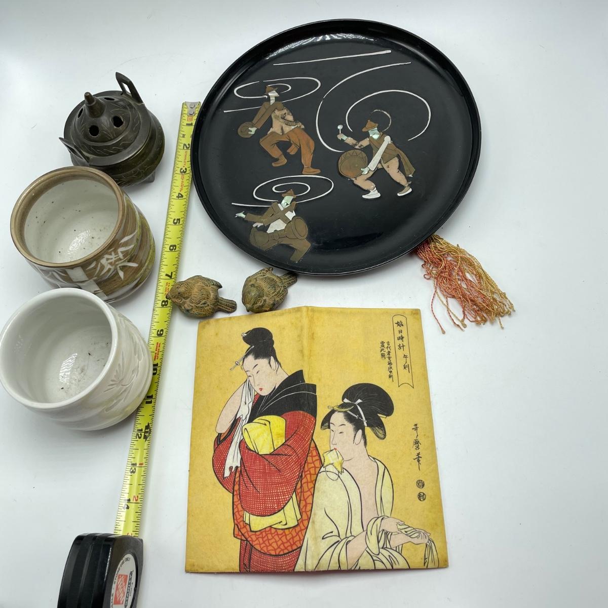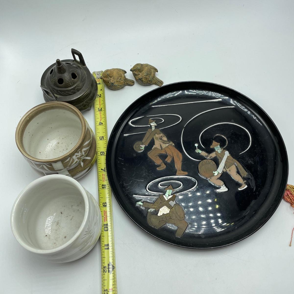 East Asian inspired decor including two beautiful pottery pieces, an antique brass incense burner a Melamine plate with metal and shell designs, a simple wallet and two cast iron birds. The birds have felt bottoms and they appear to be hollow. The melamine plate has unique and intricate designs with metal and shell inlay. The tallest character on the plate is missing his shirt, the middle character is missing a sleeve, his pants and part of the swirl. The lowest character is fully clothed, but his sleeves are separating. See images. Shipping available.