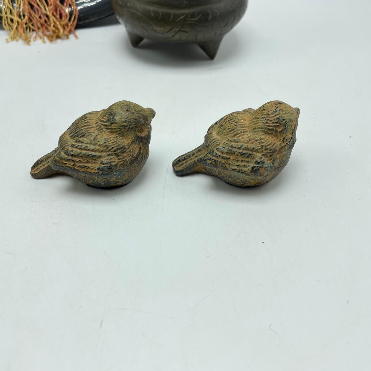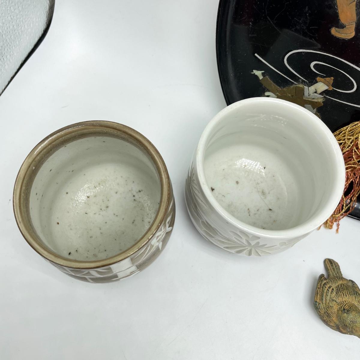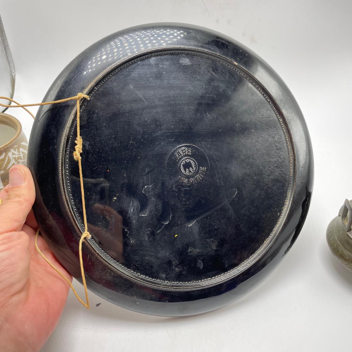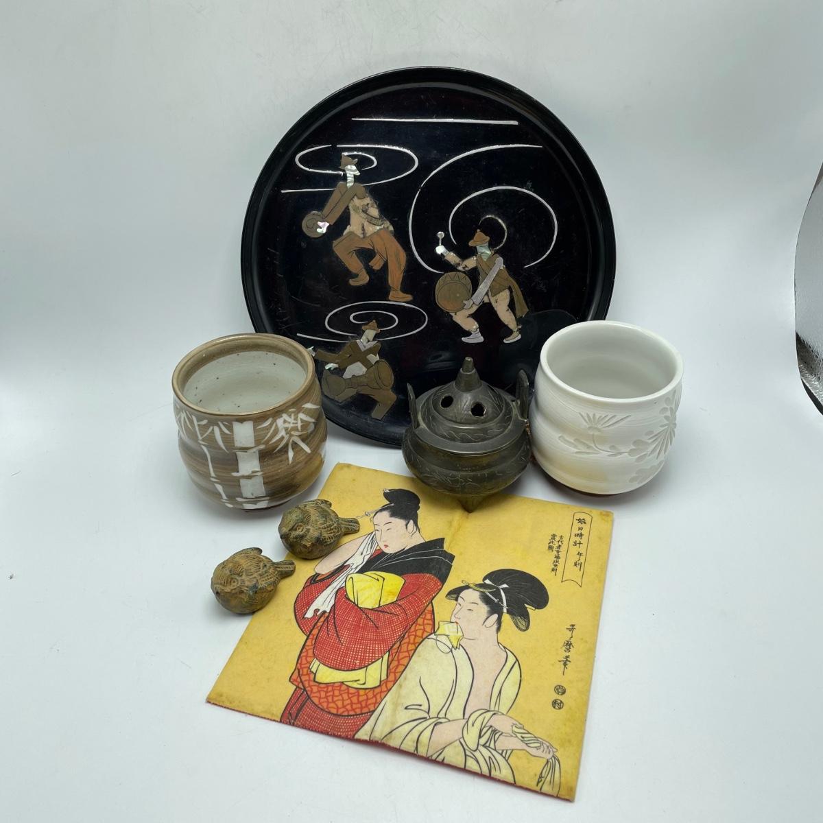 East Asian inspired decor including two beautiful pottery pieces, an antique brass incense burner a Melamine plate with metal and shell designs, a simple wallet and two cast iron birds. The birds have felt bottoms and they appear to be hollow. The melamine plate has unique and intricate designs with metal and shell inlay. The tallest character on the plate is missing his shirt, the middle character is missing a sleeve, his pants and part of the swirl. The lowest character is fully clothed, but his sleeves are separating. See images. Shipping available.