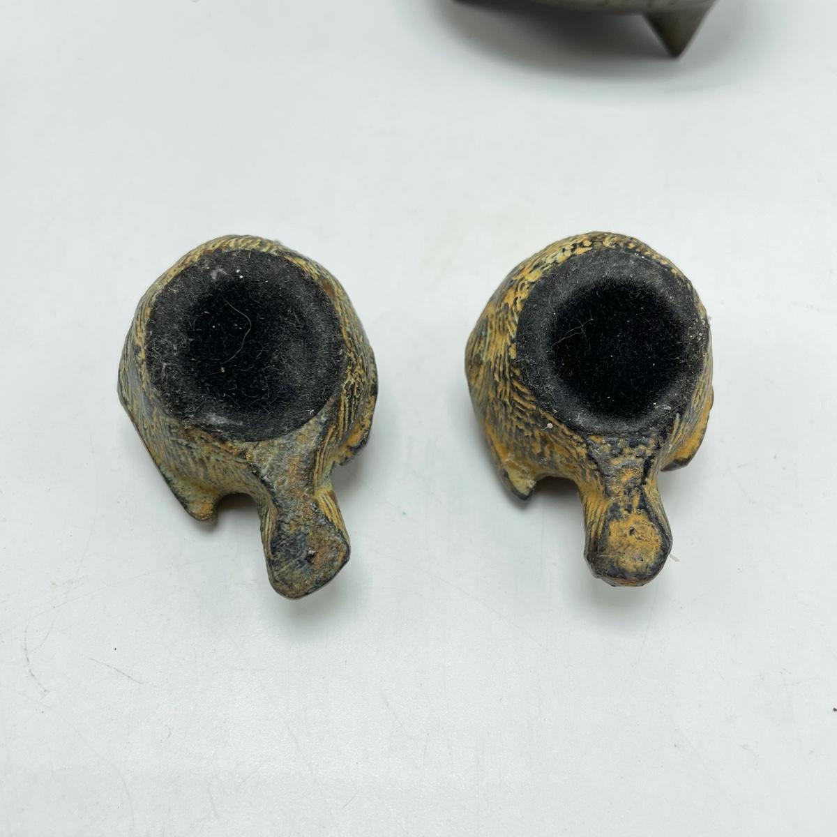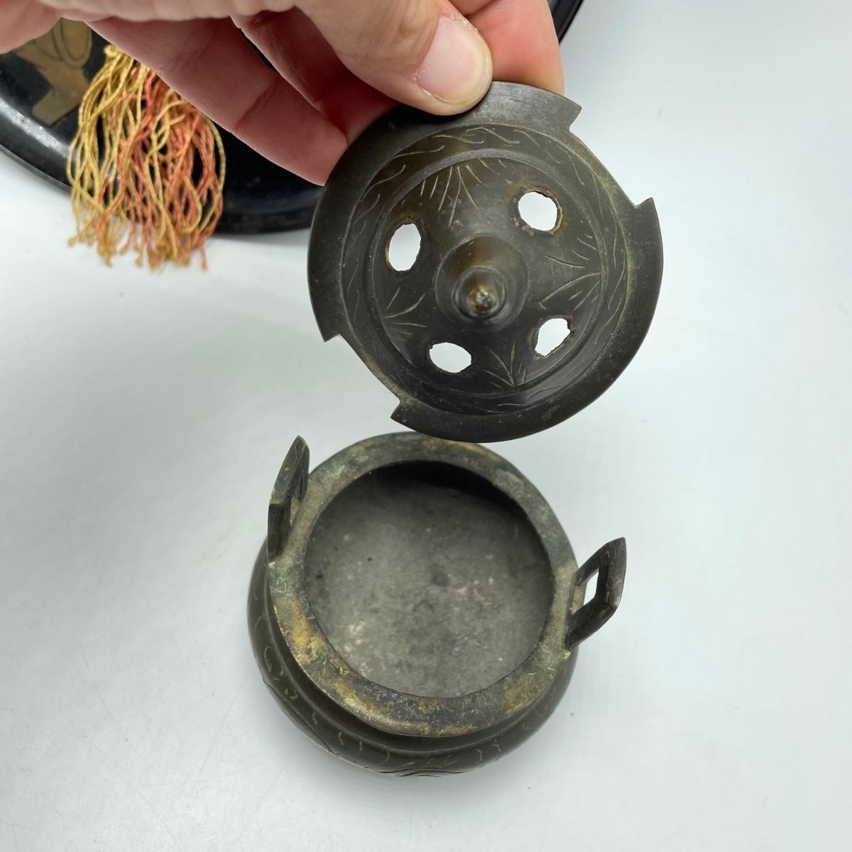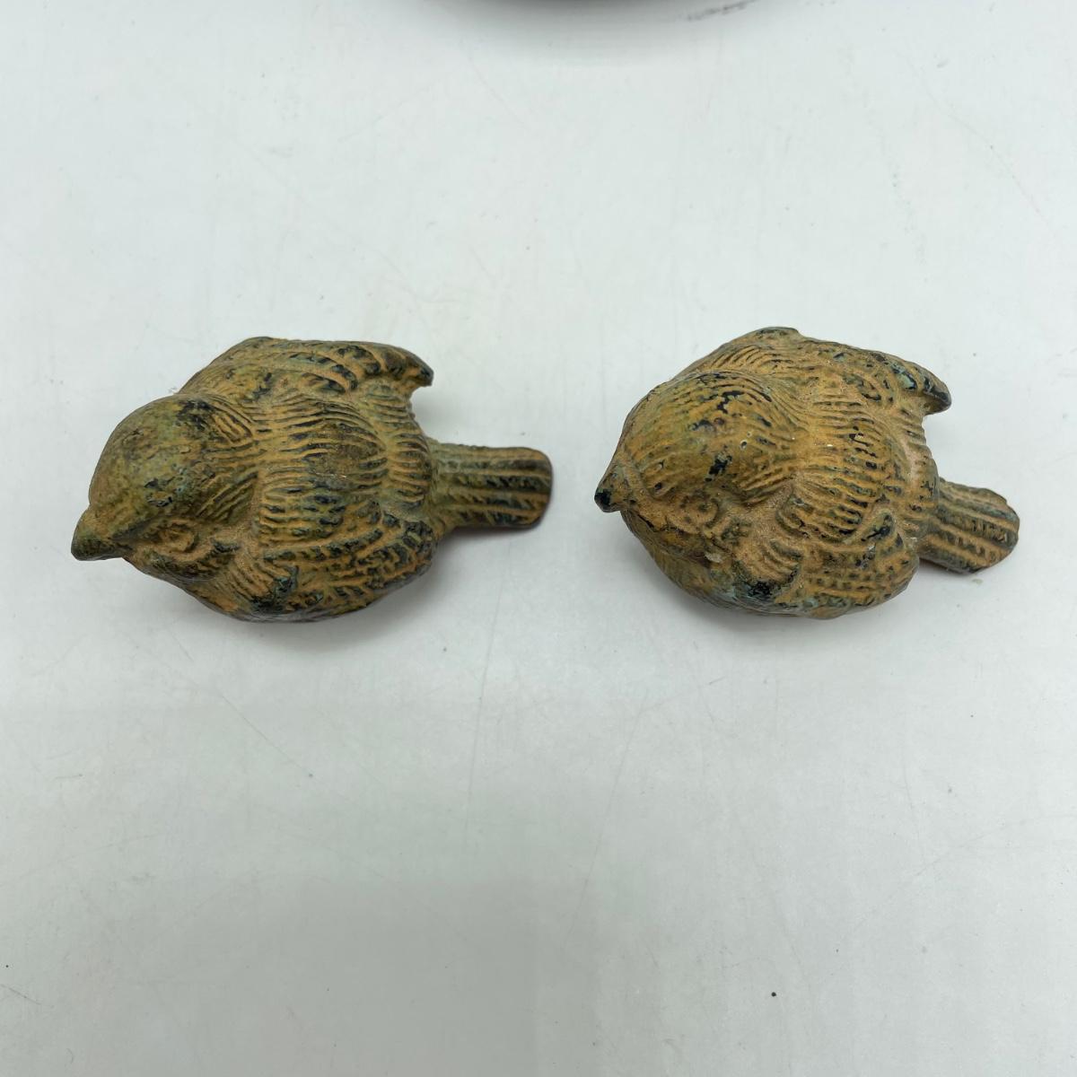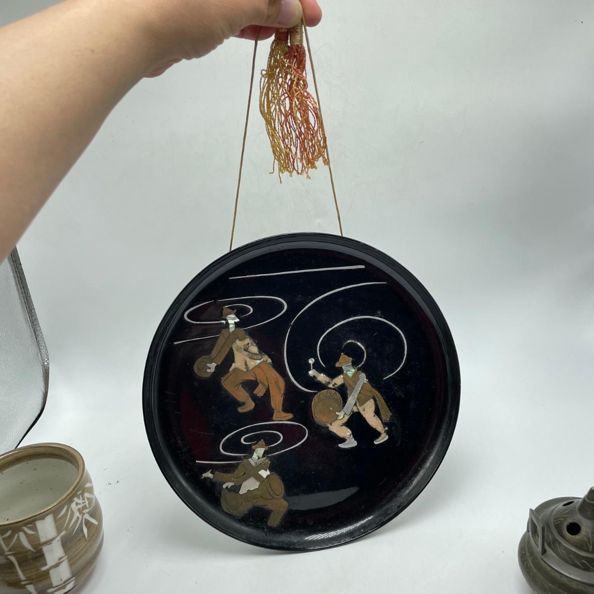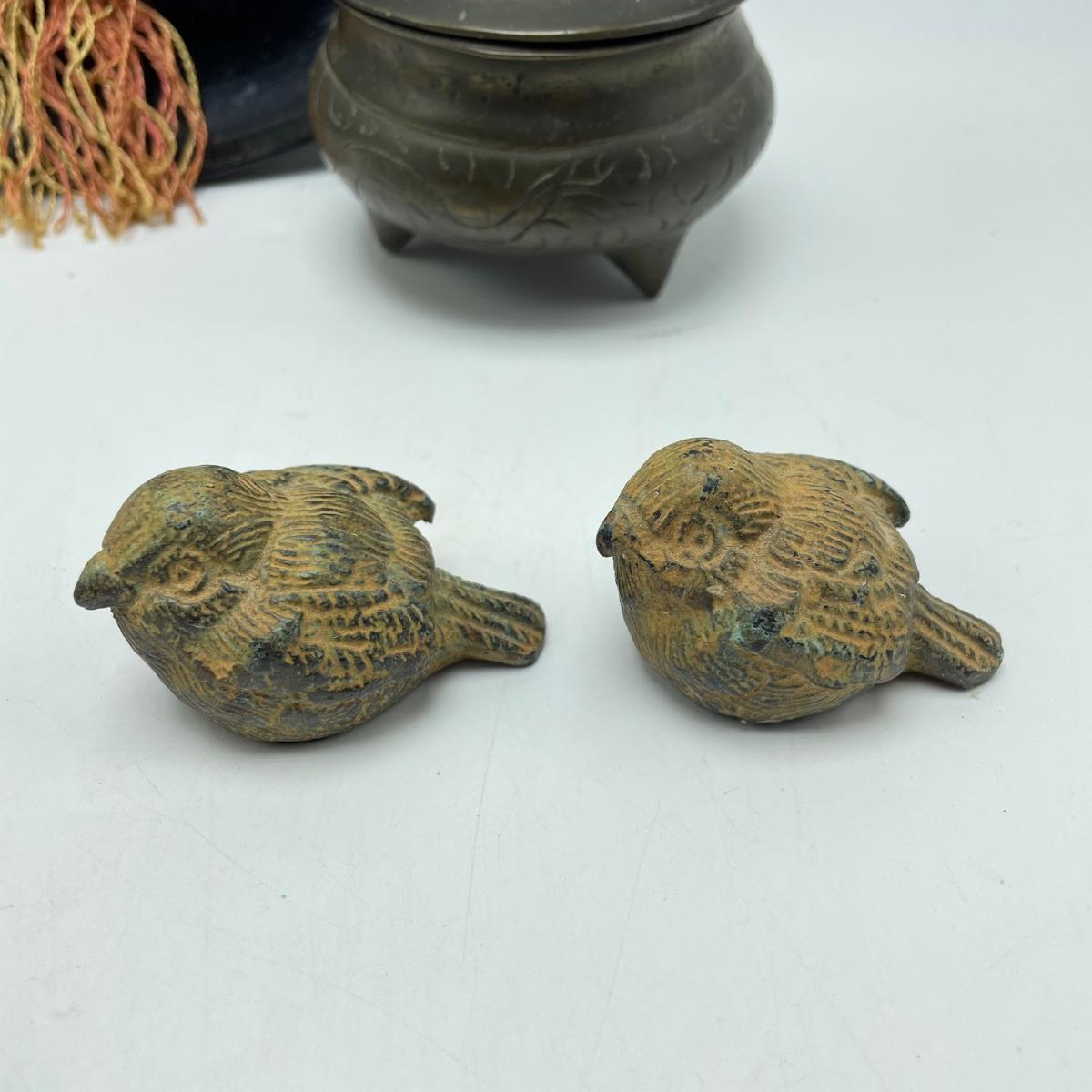 East Asian inspired decor including two beautiful pottery pieces, an antique brass incense burner a Melamine plate with metal and shell designs, a simple wallet and two cast iron birds. The birds have felt bottoms and they appear to be hollow. The melamine plate has unique and intricate designs with metal and shell inlay. The tallest character on the plate is missing his shirt, the middle character is missing a sleeve, his pants and part of the swirl. The lowest character is fully clothed, but his sleeves are separating. See images. Shipping available.