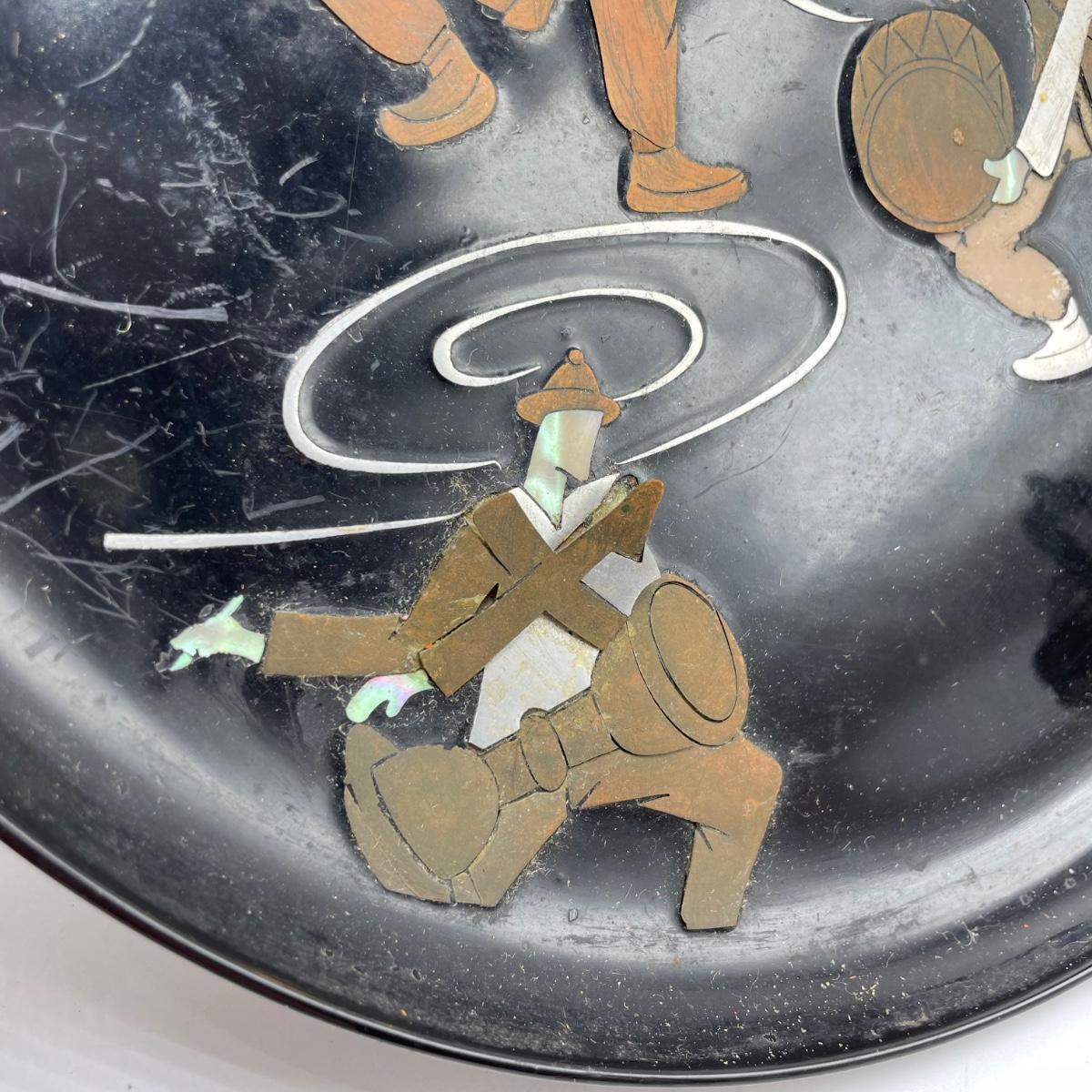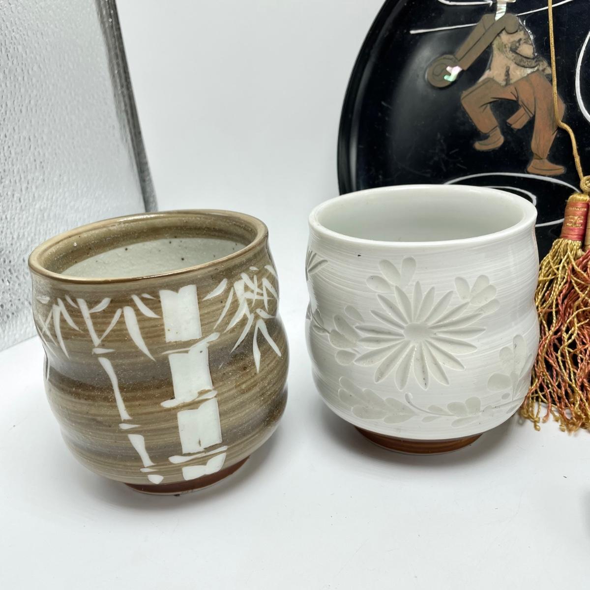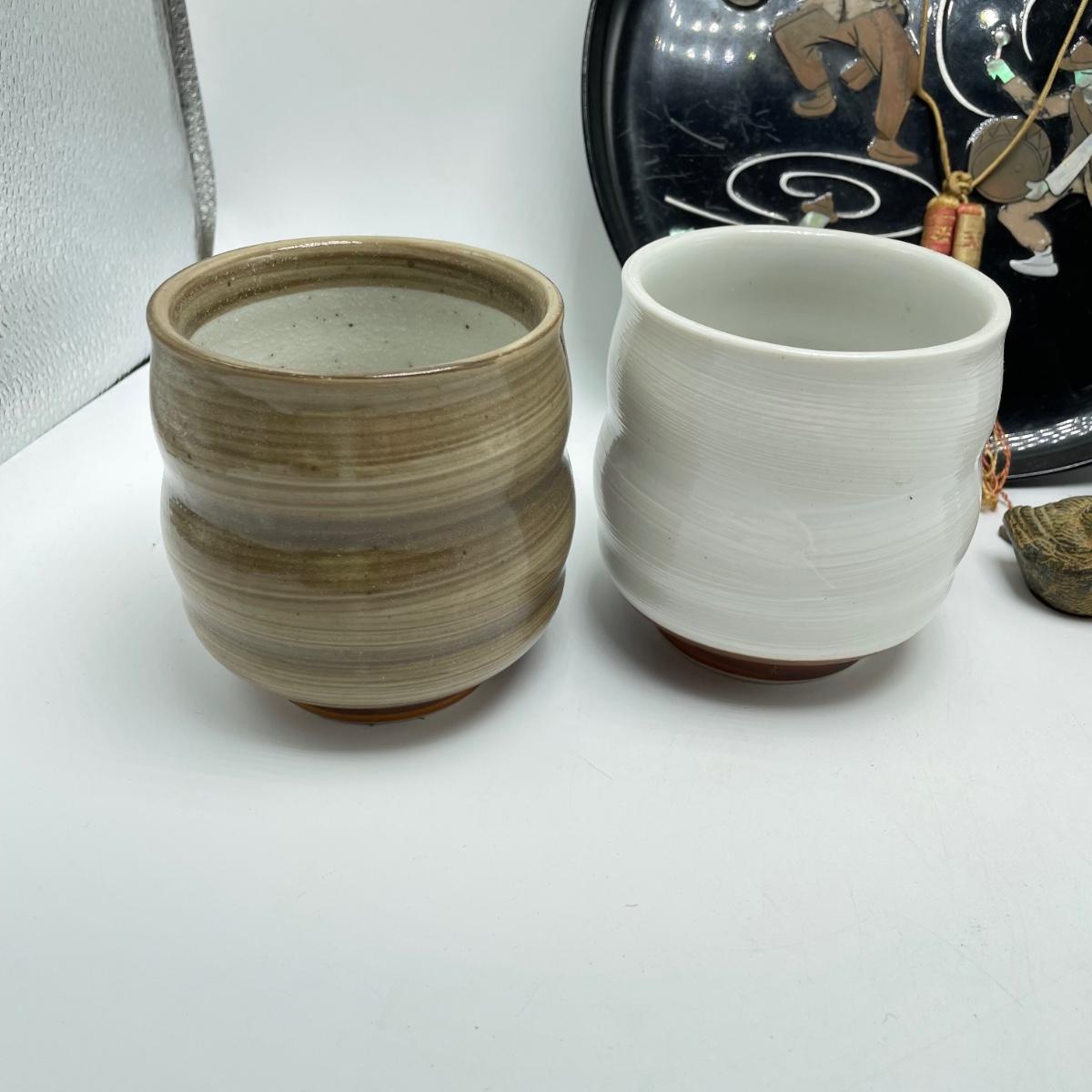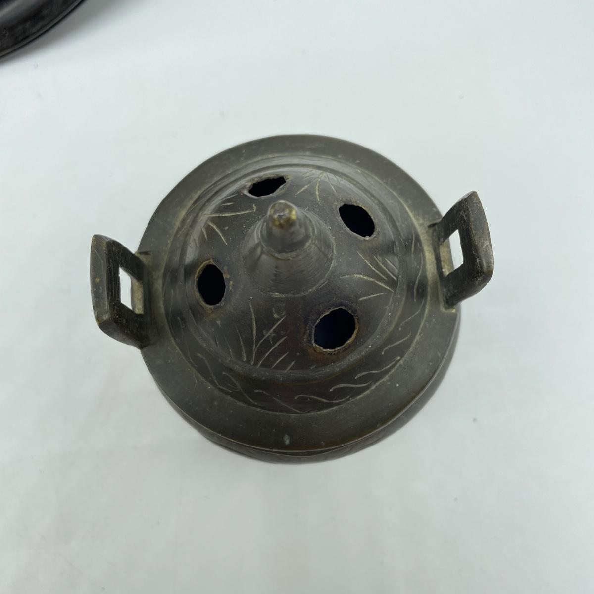 East Asian inspired decor including two beautiful pottery pieces, an antique brass incense burner a Melamine plate with metal and shell designs, a simple wallet and two cast iron birds. The birds have felt bottoms and they appear to be hollow. The melamine plate has unique and intricate designs with metal and shell inlay. The tallest character on the plate is missing his shirt, the middle character is missing a sleeve, his pants and part of the swirl. The lowest character is fully clothed, but his sleeves are separating. See images. Shipping available.