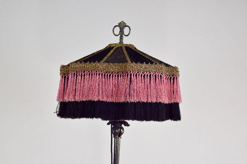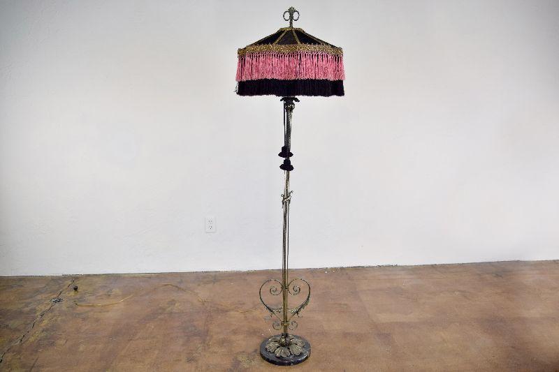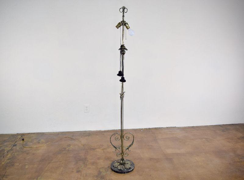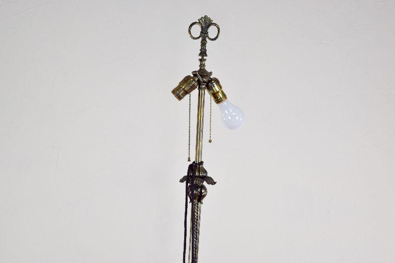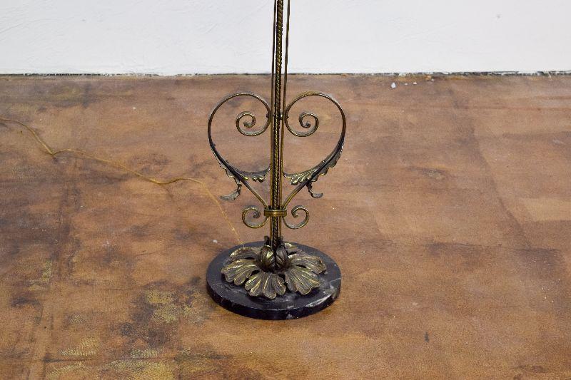 This lamp is in good overall condition, with an expected amount of wear from usage and display. There are some chips on the marble base. The lamp appears to stand slightly crooked, but could probably easily be remedied. The lamp seems to function as intended, and measures approximately 64" tall.