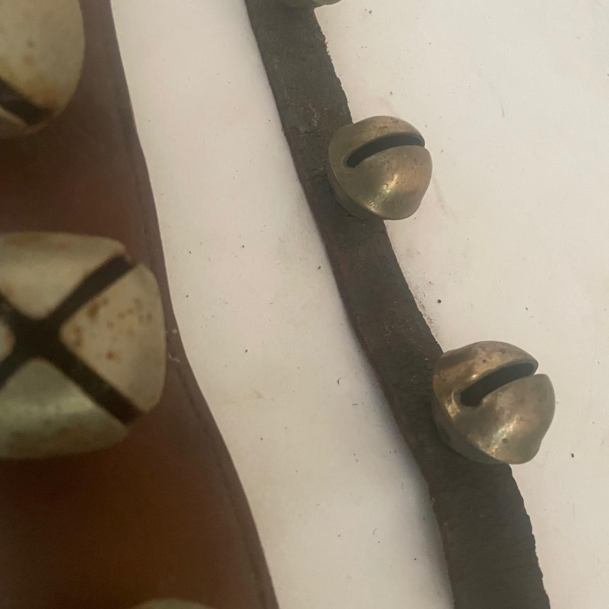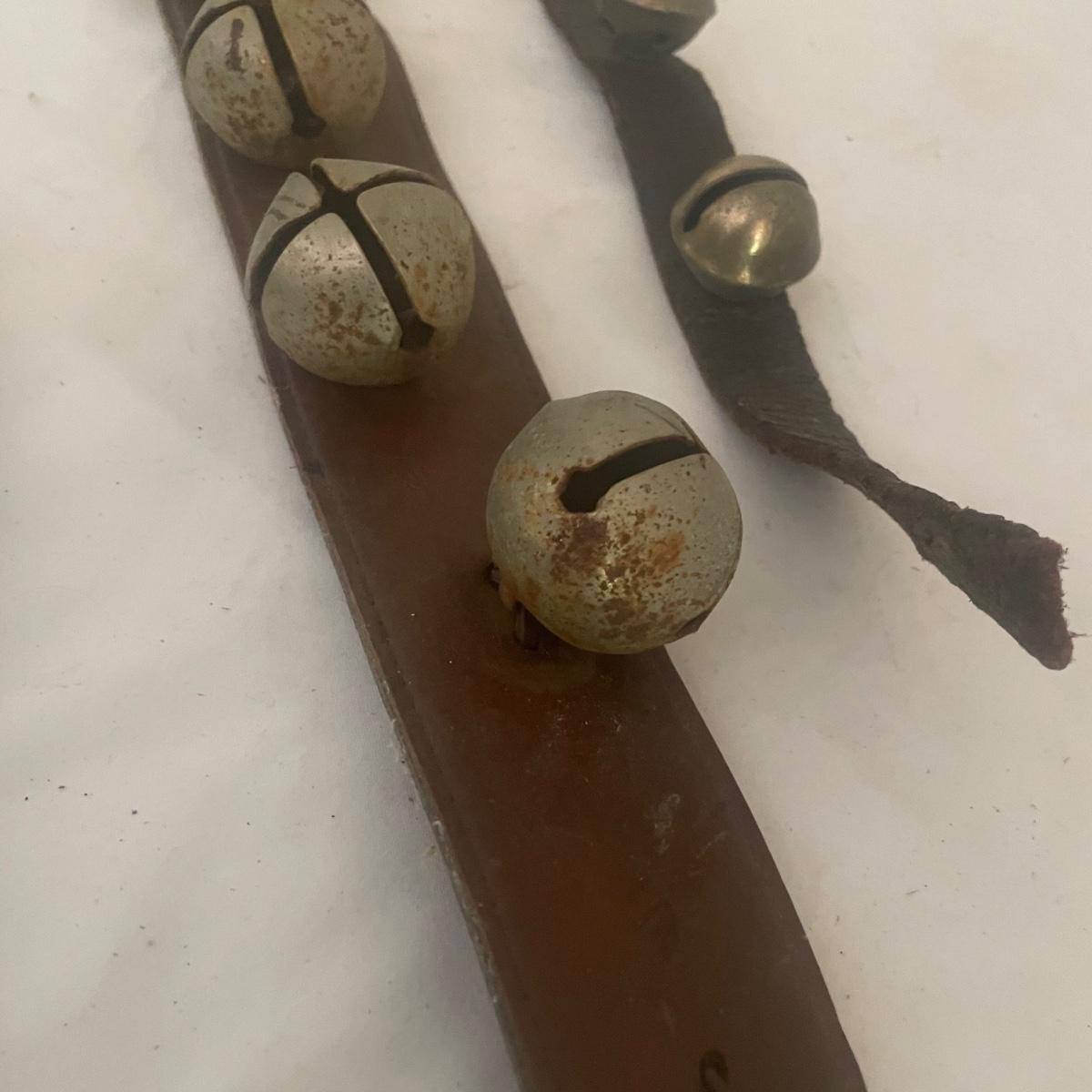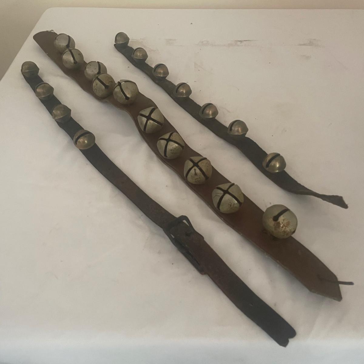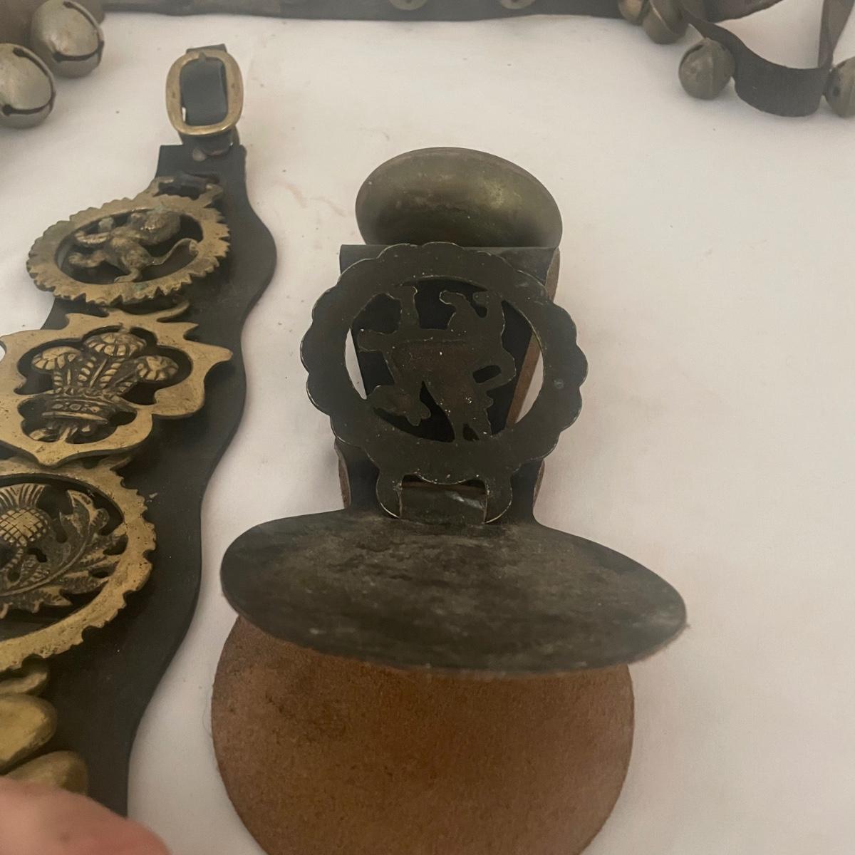 Three sets of cow bells in this lot; the two smaller sets have brass bells and their leather collars are broken. The larger metal bells have some rust. Lot also includes two leather straps with brass medallions pieces.