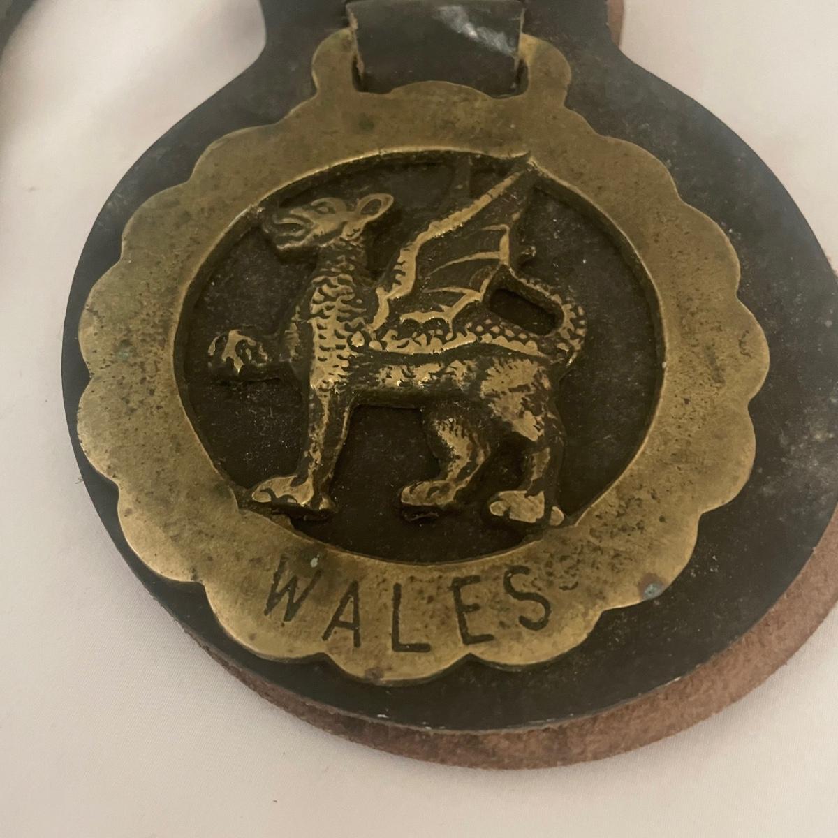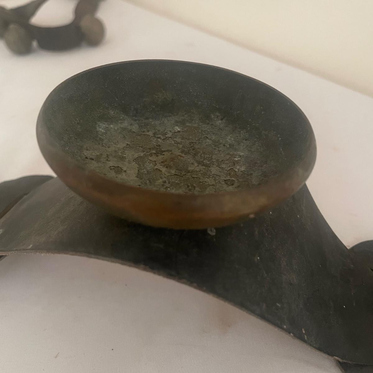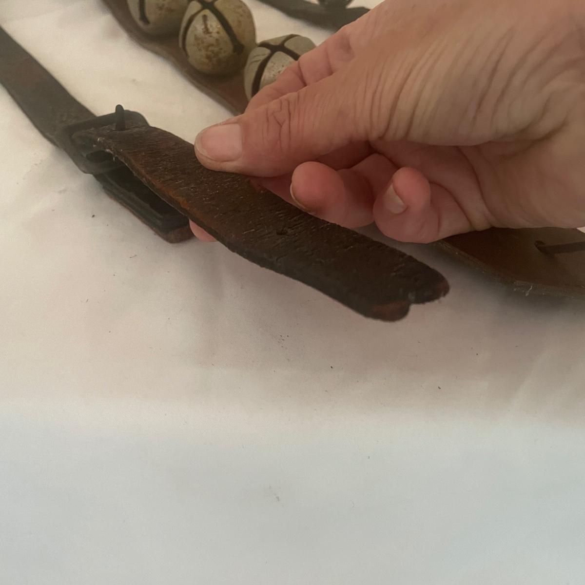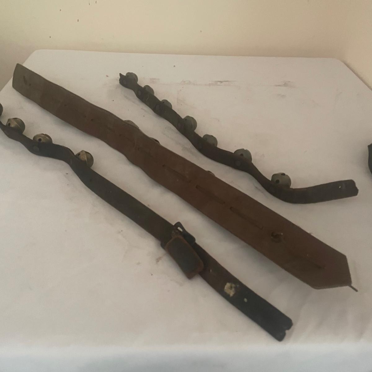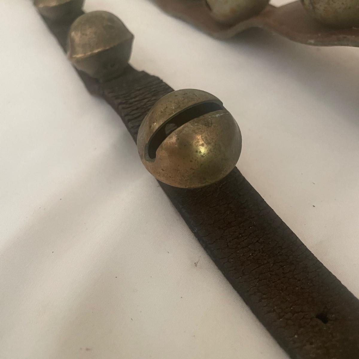 Three sets of cow bells in this lot; the two smaller sets have brass bells and their leather collars are broken. The larger metal bells have some rust. Lot also includes two leather straps with brass medallions pieces.