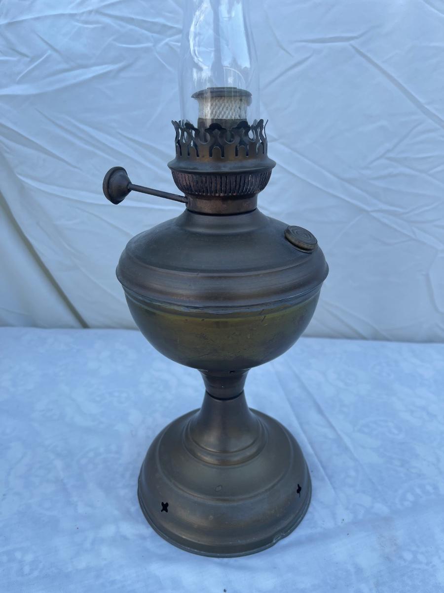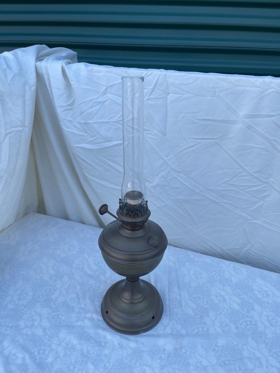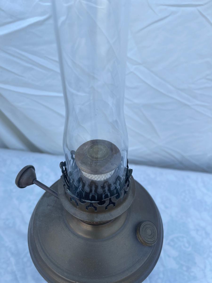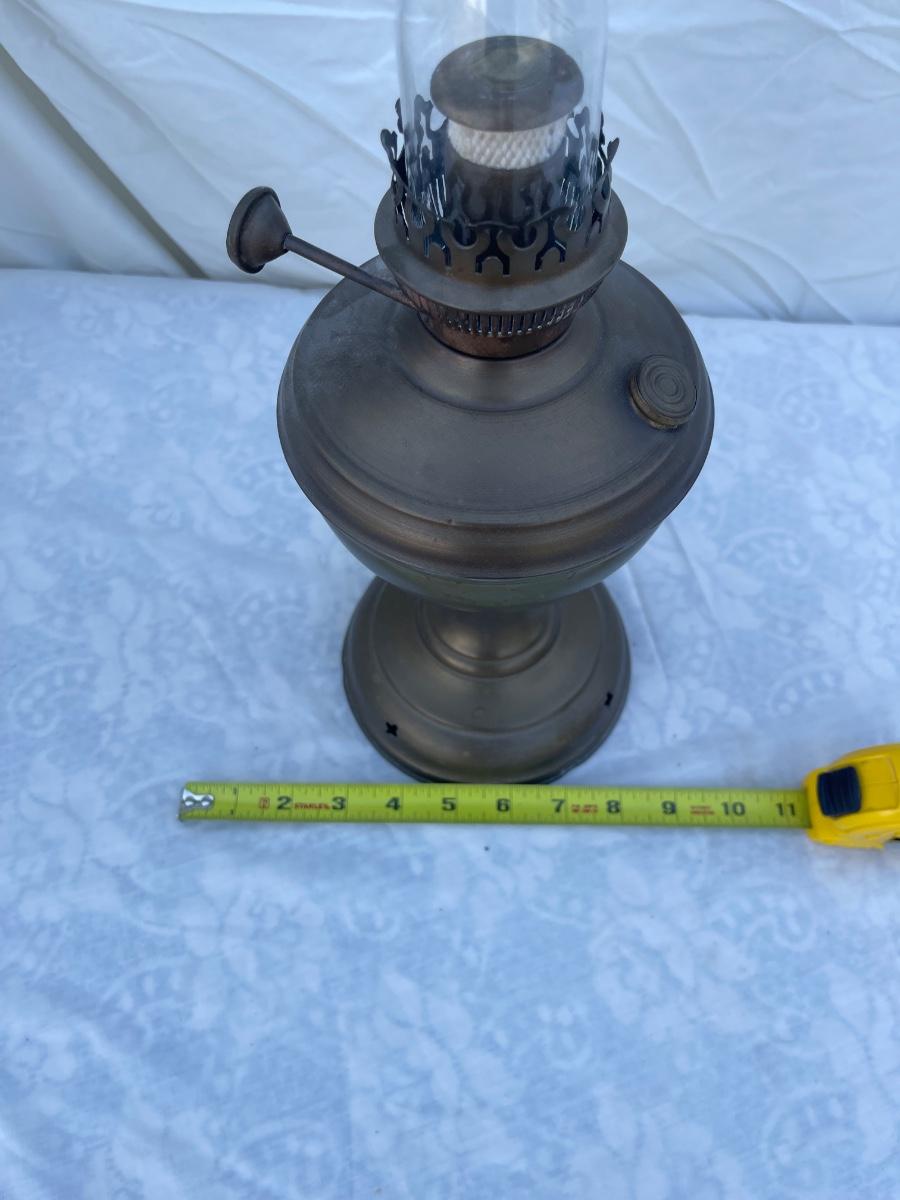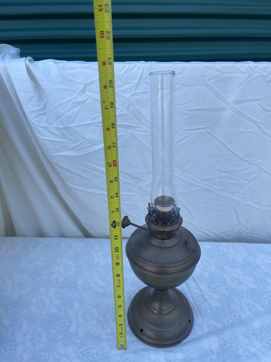 Antique Brass Oil Lamp with super skinny glass chimney. Chimney could seat better on the lamp, but otherwise the lamp is in good condition! Base is about 5" across, total height is about 21" including glass chimney.